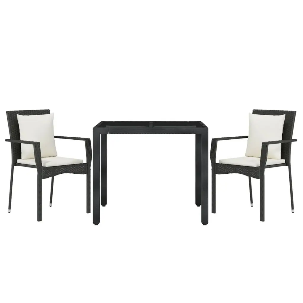 This 3-Piece Garden Dining Set combines style and functionality, giving a modern feel to your outdoor area. It has a durable table and two comfy chairs designed to enhance your dining experience in gardens, patios, or balconies, with a sleek black and cream color scheme. Durable Construction: Made with PE rattan and powder-coated steel, this dining set can take on the weather while looking good.Comfortable Seating: The outdoor cushions with zippers offer comfort and are easy to clean.Versatile Usage: Great for eating, relaxing, or entertaining in your outdoor space, giving a lovely vibe to your area.Easy to Clean: The tempered glass tabletop looks good and is simple to wipe down, keeping things neat and tidy.Adaptable Layout: Its modular design means you can rearrange it to fit your space perfectly, whether for small or big get-togethers.