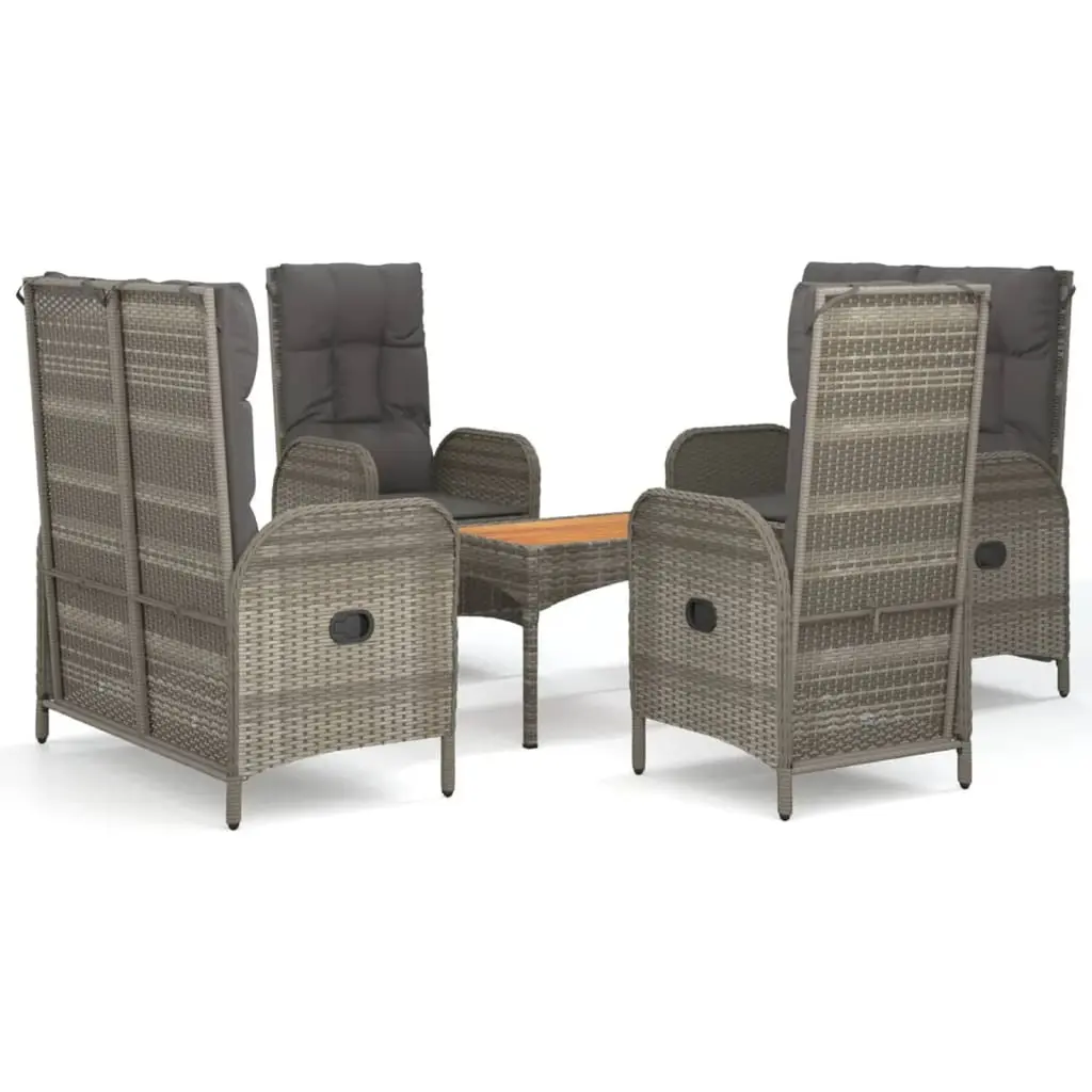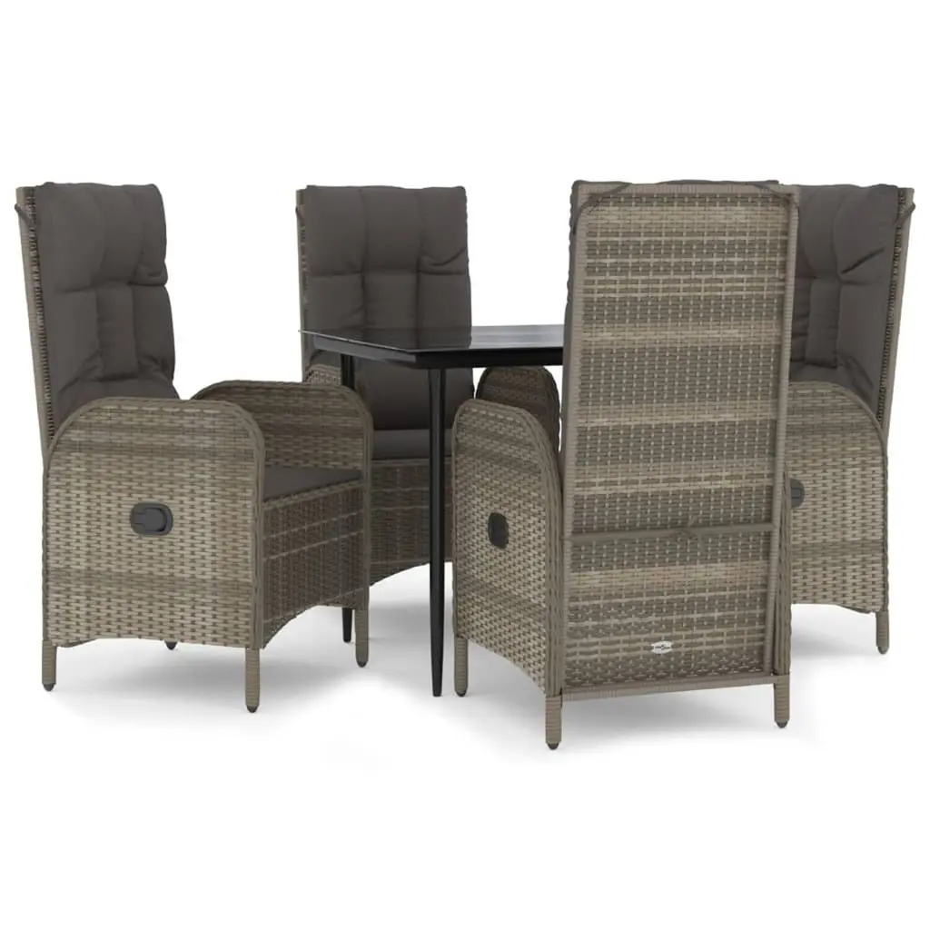This 5 Piece Garden Dining Set offers a stylish and inviting way to enjoy outdoor dining, designed to elevate your terrace or balcony experience. Its contemporary appeal is marked by a sleek black and gray color combination, perfect for sprucing up modern outdoor aesthetics while providing plenty of seating for family and friends. Stylish and Functional: The elegant design featuring black and gray tones boosts any outdoor spot while providing a comfy dining experience. Its smooth feel and neat lines fit right into contemporary settings. Adjustable Features: Adjustable armrests and backrests mean everyone can find their comfy spot for chilling or dining. Durable Construction: Built from top-notch UV resistant PE rattan and tough powder-coated steel frames, this set is made to handle outdoor wear and tear while looking good year-round. Weather-Resistant Fabric: The included cushions are weather-resistant, boosting comfort and ensuring they stay vibrant no matter the weather. Complete Dining Experience: This set seats up to four, making it perfect for outdoor family meals or chilling with friends in the fresh air.