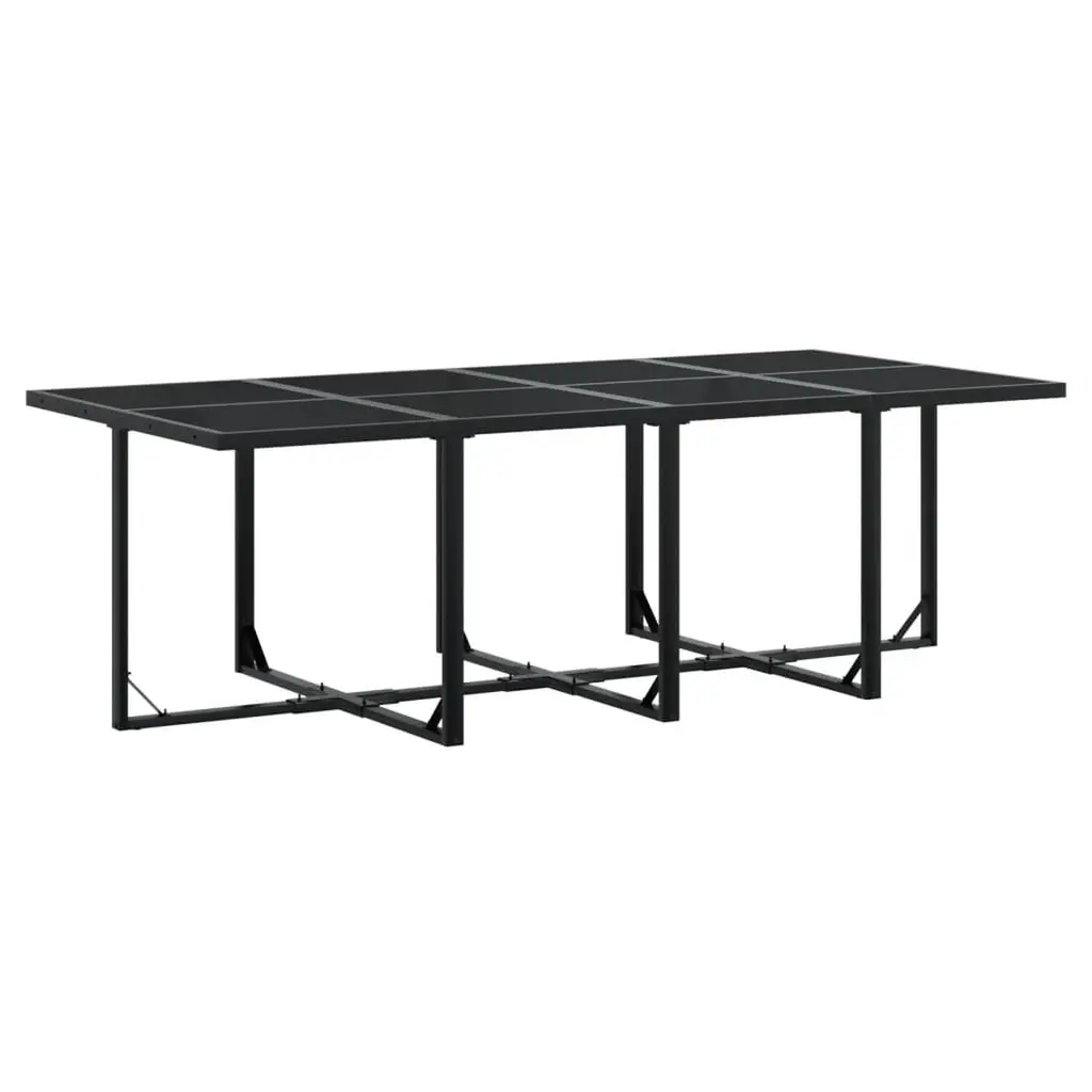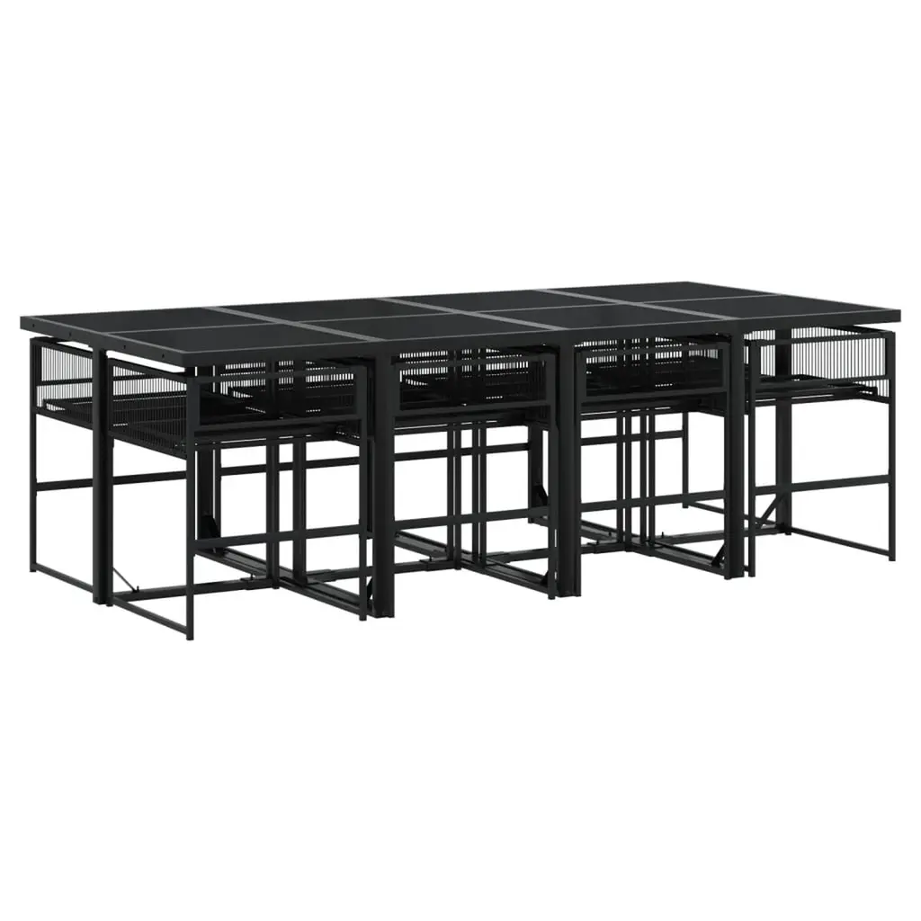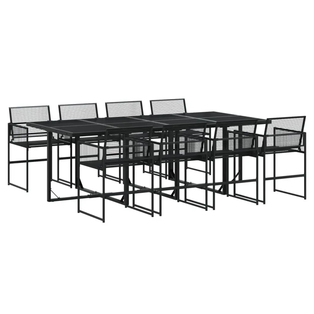This 9-Piece Garden Dining Set is just the thing for outdoor gatherings, offering loads of seating and a modern design. With its striking black finish and made from high-quality Poly Rattan with a sturdy powder-coated steel frame, this set is durable and stylish. It's ready to jazz up your patio, balcony, or garden with its classy look. Ample Seating: This garden set fits up to 9 people, perfect for family gatherings, barbecues, and social events, making dining outdoors fun for everyone.Versatile Design: With a modern look and clean lines, it effortlessly fits into various outdoor styles, making your patio or garden inviting for relaxation.Quality Materials: Crafted from UV-resistant Poly Rattan, this dining set stands up to the elements while looking good. The tempered glass top is smooth and easy to maintain, boosting your outdoor dining experience.Stackable Chairs: The chairs stack for easy storage, so you can create space whenever needed. It also makes transporting them a breeze, letting you set up or tidy away your dining area quickly.No Assembly Required: The set comes ready to use, so you can start enjoying your outdoor space straight away. No complicated setup means more time to relax and socialize!
