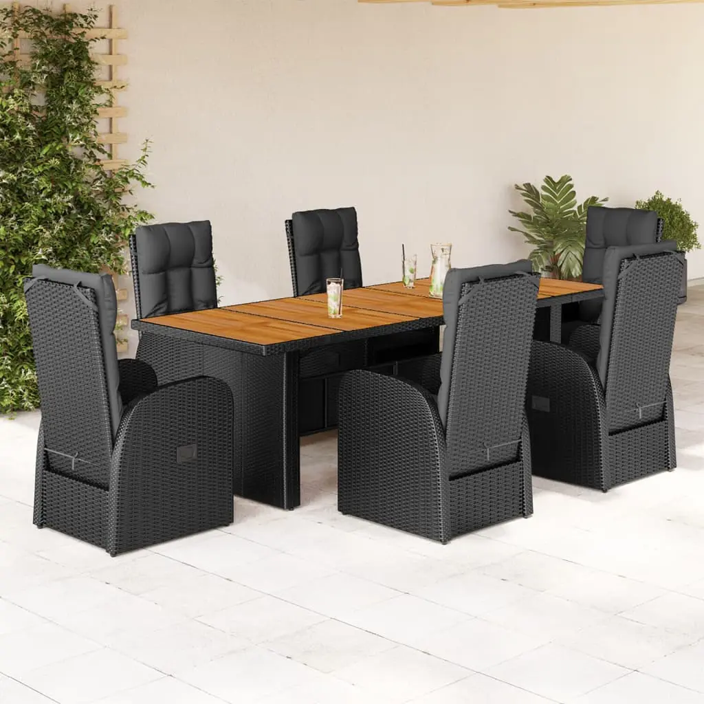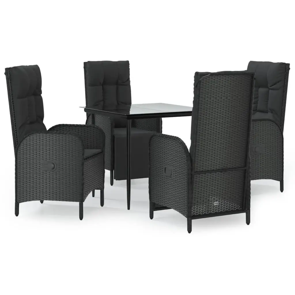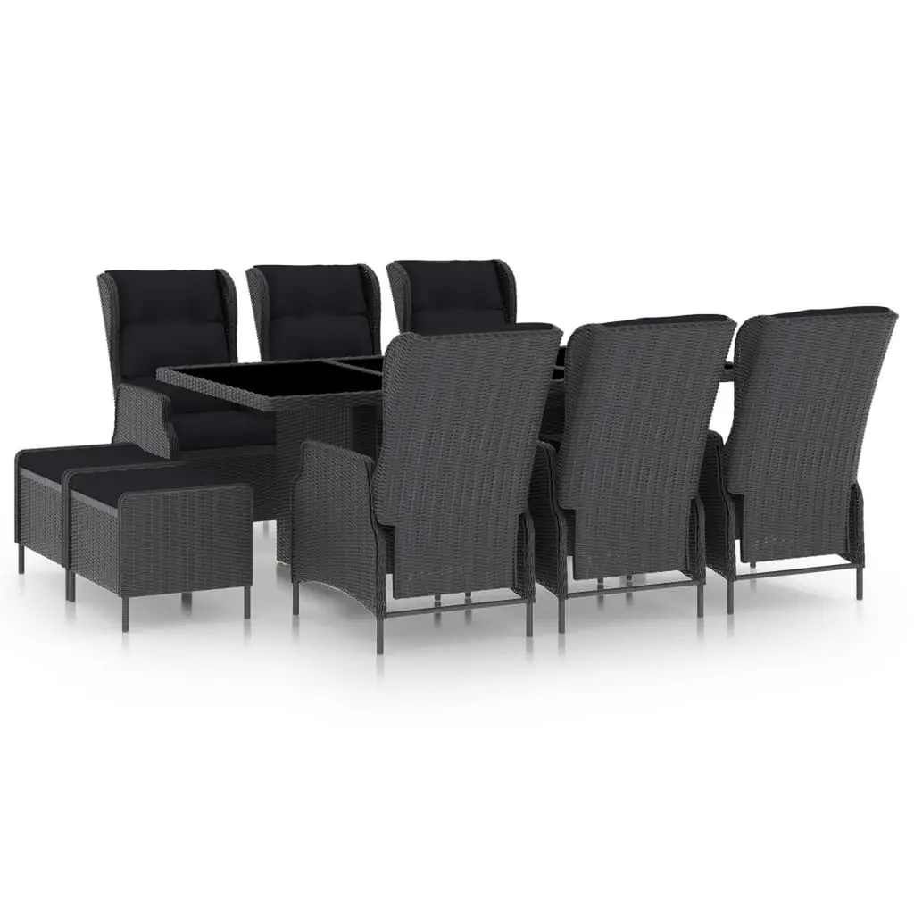 This 11-piece garden dining set is all about outdoor fun and relaxation. It features a snazzy rectangular table and ten comfy reclining chairs that mix practicality with sleek vibes. The stylish black color pairs perfectly with the easy-care cushions, making it a lovely addition to gardens, patios, or balconies, where you can enjoy memorable meals in a nice atmosphere. Adjustable Armrests: The armrests on this dining set can easily be adjusted to suit your own comfort, making it fab for dining or lounging. This feature means you can tailor your seating to your liking, perfect for family do's and get-togethers.Removable Cushions: Each chair has cushions attached with zippers, making them easy to take off for washing or swapping. This handy feature keeps your outdoor furniture looking great while ensuring comfort during long sit-downs.UV-Resistant Materials: Made from top-notch PE rattan and tempered glass, this set is built to deal with harsh UV rays so it stays chic and sturdy over time. This durability means you can enjoy outdoor meals without fretting about sun damage.Spacious Design: The big rectangular table, at 94.5 in long, fits ten chairs perfectly, ideal for hosting friends and family. Whether it’s a party or a regular dinner, it creates a friendly and sociable vibe.Elegant and Modern Look: The combo of black powder-coated steel and sleek tempered glass gives a modern touch that brightens up any outdoor area. This look not only upgrades your garden but also sets a lovely mood for gatherings.
