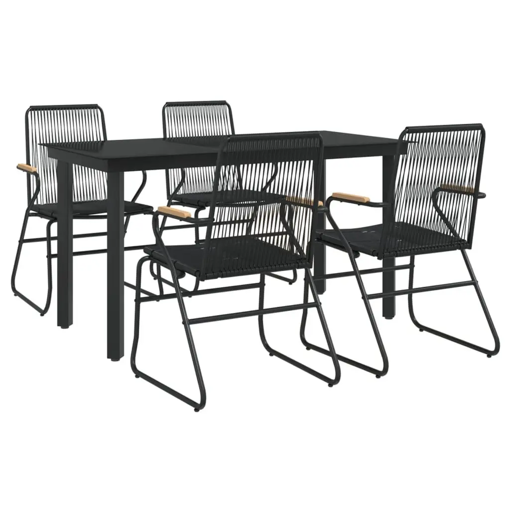 This lovely 5-piece garden dining set is just right for enjoying meals and gatherings outdoors. With a sleek black design and a modern vibe, it looks great on your balcony, terrace, or patio, while providing a comfy dining experience for family and friends. Robust Construction: Made with tough powder-coated steel and synthetic materials, this set can handle outdoor conditions while ensuring it lasts.Stylish Appearance: The classy black finish and smooth textures give a contemporary look that meshes well with any outdoor decor.Generous Seating: Made for up to four folks, this dining set means lots of space for gatherings, ideal for lazy lunches or evening meals.UV Resistant Materials: The furniture components are selected for their sunlight resistance, making sure the colors and looks stay vibrant over time.Easy Maintenance: The smooth surfaces are simple to clean; just wipe them down with warm water to keep them looking fresh.