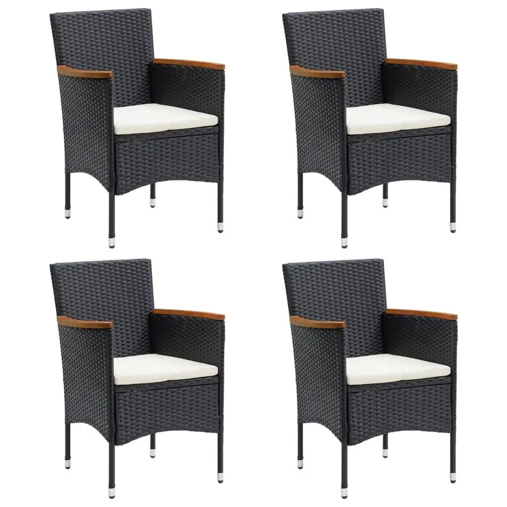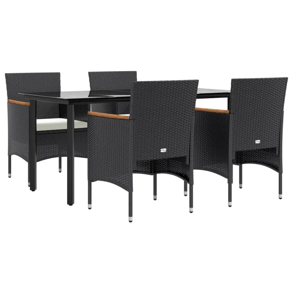 This 5 Piece Garden Dining Set combines functionality with a sleek look, making it a perfect fit for your outdoor hangout. With a chic black surface and comfy cushions, it’s ideal for both chill family meals and fancy afternoon get-togethers in the sun. Stunning Appearance: The set showcases a black frame and tempered glass surface, creating a modern look that suits any garden or terrace.High-Quality Materials: Made from powder-coated steel and poly rattan, this garden set is rust-resistant and won't fade easily.Versatile Seating Capacity: Easily seats up to five, perfect for hosting friends.Easily Removable Cushions: The cushions come with zippered covers for simple removal and cleaning, keeping the set looking fresh.Robust Construction: Built tough, this set is made to handle different weather while still looking great.