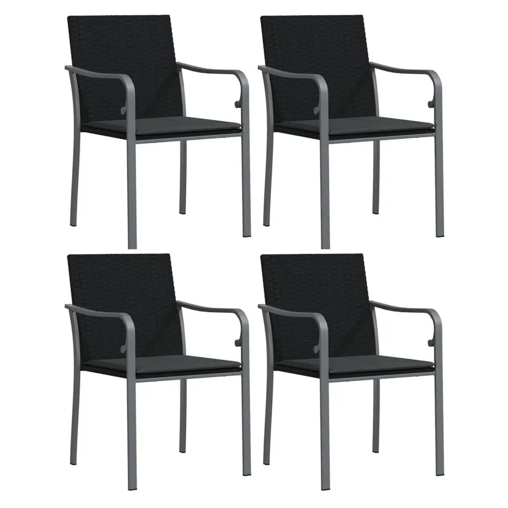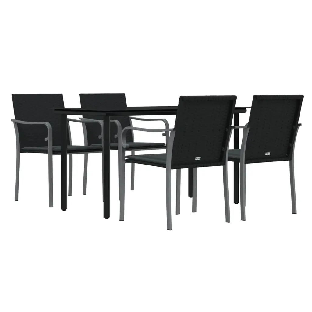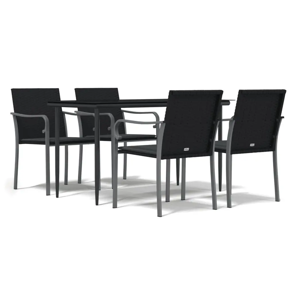 This modern 5-piece Garden Dining Set upgrades outdoor dining with trendy style and cozy seating. It's perfect for patios or balconies, featuring a sleek table and four chairs that look awesome in any outdoor setting while providing a cozy spot for meals with family or friends. Weather-resistant materials help ensure longevity and easy care; made from durable PE rattan, it's made to handle the elements while keeping its stylish look.Comfy seating thanks to soft cushions made from weather-resistant polyester fabric, perfect for long outdoor meals while keeping it looking sharp.The modern set, finished in sleek black, blends seamlessly with different outdoor styles, perfect for those who value both form and function in their garden furniture.Solidly built with a tough steel frame, supporting each piece for steady use while being easy to move and maintain.This flexible set is made for outdoor settings, catering to both small gatherings and intimate meals, making it a great addition to any garden or patio.