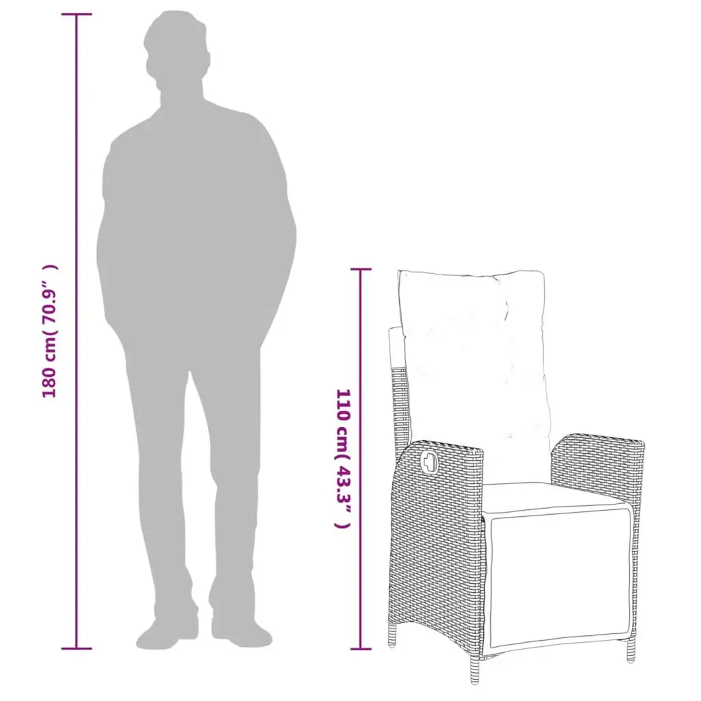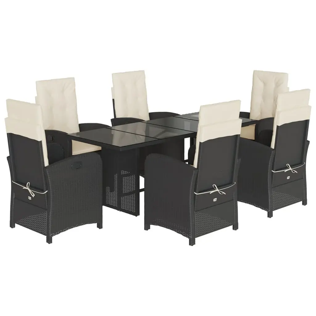 This 9-piece garden dining set is a stunning addition to your outdoor area, combining style and functionality. Thoughtfully designed for gatherings, al fresco meals, and chilling out with pals or family, it brings comfort and flair to your garden, patio, or backyard. Classy Design: The smart black and cream scheme with smooth poly rattan and solid acacia wood gives it a modern twist. Room for Everyone: Seats up to 8 folks, with comfy chairs that keep you happy during long meals. Weather-Resistant: Built from tough poly rattan and solid acacia wood, this dining set handles all kinds of weather while looking great. Adjustable Comfort: Reclining backrests and footrests let you find your perfect position for total relaxation. Easy Maintenance: The removable cushion covers are a breeze to clean, keeping your dining set fresh for each get-together.