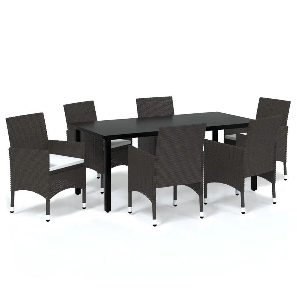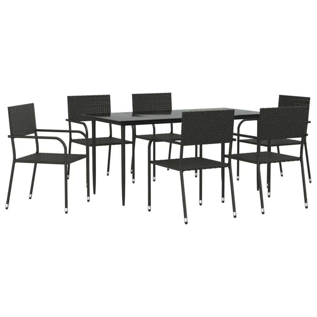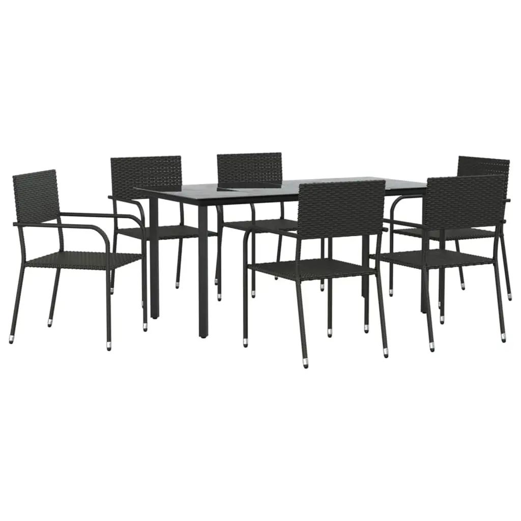 This 7-piece garden dining set is a great addition for anyone wanting to spruce up their outdoor space. Perfect for hosting on balconies or patios, the stylish poly rattan and strong steel build gives it both flair and durability for relaxed meals outside. Weather-Resistant Construction: The materials are UV and water-resistant, meaning they’ll last and still look great over time, no matter what the weather throws at them.Modern Aesthetics: The sleek design features smooth lines and a chic glass top, boosting the look of any outdoor space and making dining a treat.Space-Saving Design: The stackable chairs make it easy to store them away when they’re not needed and keep your space neat during events.Robust and Stable: Each chair and table rests on a strong powder-coated steel frame, ensuring a solid base for food and drinks, keeping things safe while you’re using them.Generous Seating Capacity: With space for up to six people, it's ideal for family meals, BBQs, or casual hangouts with friends.
