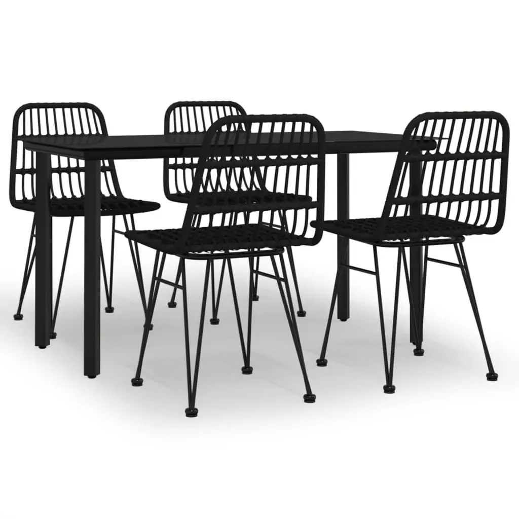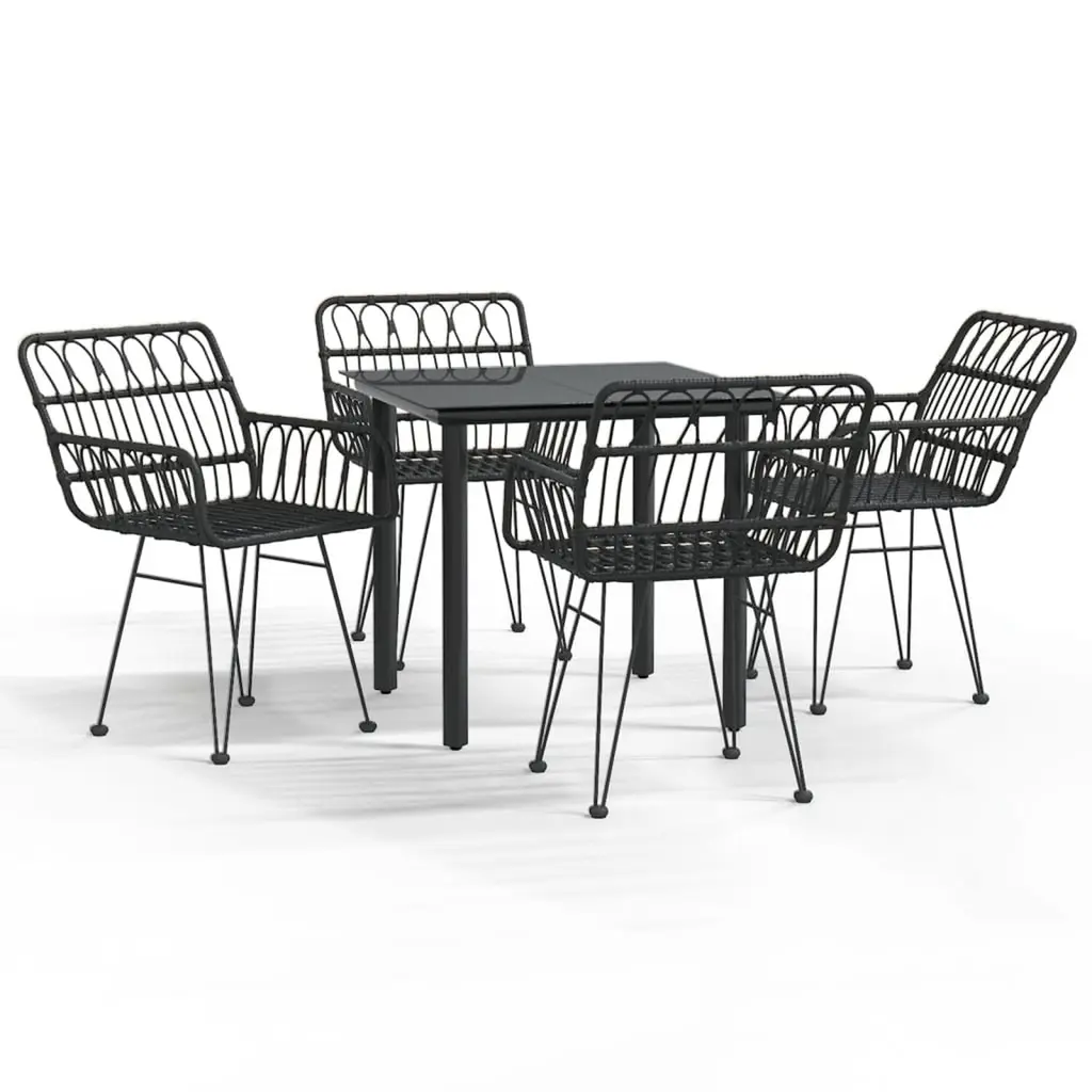This 5-piece outdoor dining set mixes function and style, creating a welcoming spot for meals with family and friends. With a rectangular table and four comfy chairs made of synthetic poly rattan, this set brightens up any patio, balcony, or garden, making it perfect for laid-back outdoor lunches or entertaining. Robust Design: Made for everyday outdoor use, this set boasts strong steel frames for great stability, ensuring your outdoor dining is both enjoyable and safe.Tempered Glass Tabletop: The table's tempered glass top is tough and easy to maintain; just give it a wipe to keep it gleaming.Comfortable Seating: Chairs made from smooth poly rattan look smart and offer a comfortable seat, perfect for lazy afternoons or evening chats.Weather Resistance: Featuring materials designed for outdoor use, this set withstands various weather conditions, letting you enjoy it for many seasons.Stylish and Functional: The modern design with clean lines enhances any outdoor space, turning it into a beautiful feature of your garden.