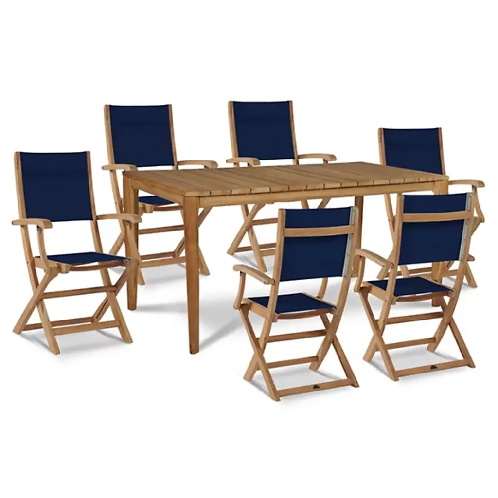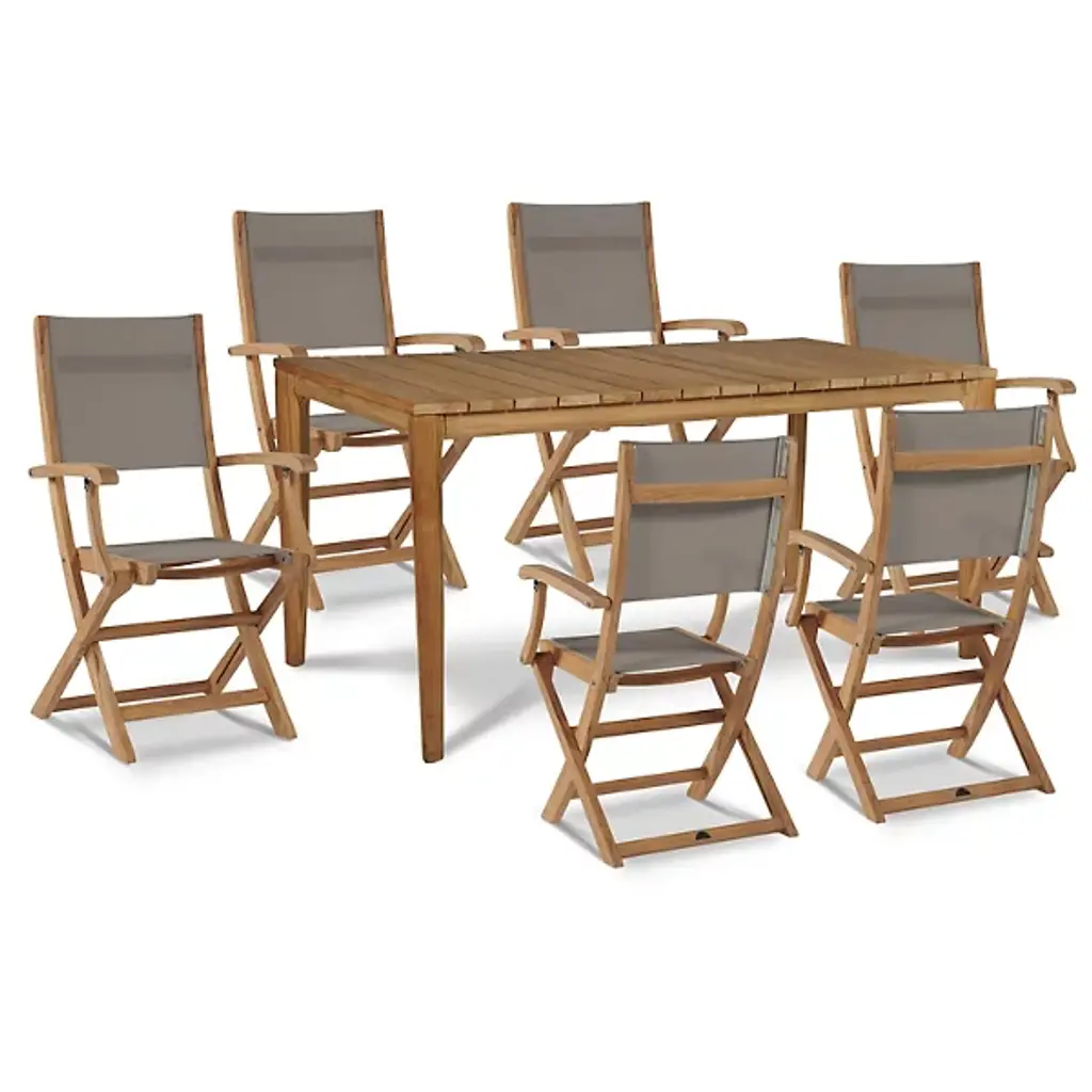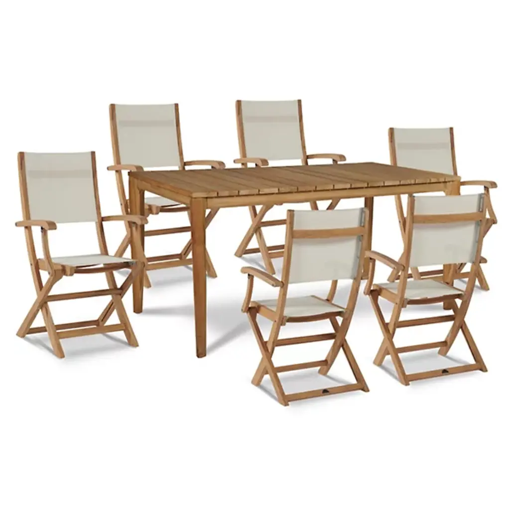 This garden dining set not only looks stylish but also does the job right for outdoor living. With its rustic style and cream white fabric, it fits perfectly in any garden, backyard, or patio, creating a great spot for dining and relaxing. Solid Acacia Wood Construction : This solid acacia wood setup is built to last, giving you a strong and sturdy solution for your outdoor area. Comfortable Seating : Each chair has soft polyester fabric seats for comfy long dining sessions. Enjoy relaxed meals or outdoor gatherings while staying cozy. Adjustable Foldable Mechanism : Easy storage and transport is key, and this foldable design lets you quickly set up for any occasion or tuck it away when it’s not being used. Stylish Rustic Design : With its smooth surface and natural wood finish, the rustic style adds a classy touch to your dining space. It’s perfect for casual hangouts or intimate dinners. Spacious Seating Capacity : This set can comfortably sit up to 6 people, making it ideal for family meals or gatherings with friends. Enjoy long meals outdoors, making lovely memories together.