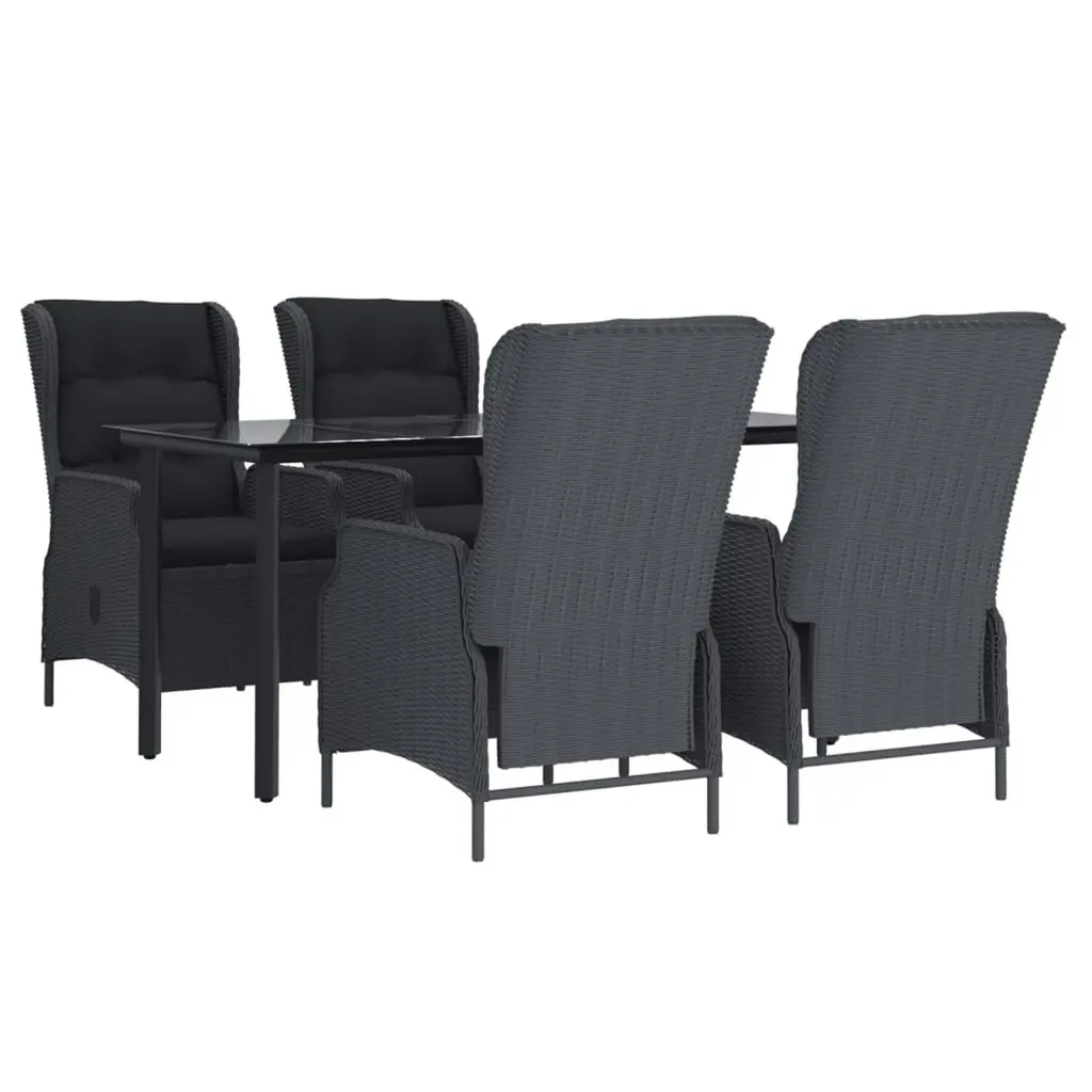 This 5-piece garden dining set adds a touch of class to your outdoor spaces, mixing functionality with a modern vibe. With its dark grey poly rattan and stylish tempered glass top, it’s perfect for fun gatherings with family and friends on sunny afternoons. The powder-coated metal frame is built to last and stay stable, making sure it holds strong against different weather.With cushioned seats of weatherproof fabric, relaxing in style is the name of the game.The contemporary design easily fits into any outdoor scene, perfect for balcony meals, patio nights, or garden parties.The adjustable backrest lets each guest find their sweet spot, ramping up the relaxation factor.With room for up to five, this set is ace for hosting anything from casual brunches to summer barbecues.