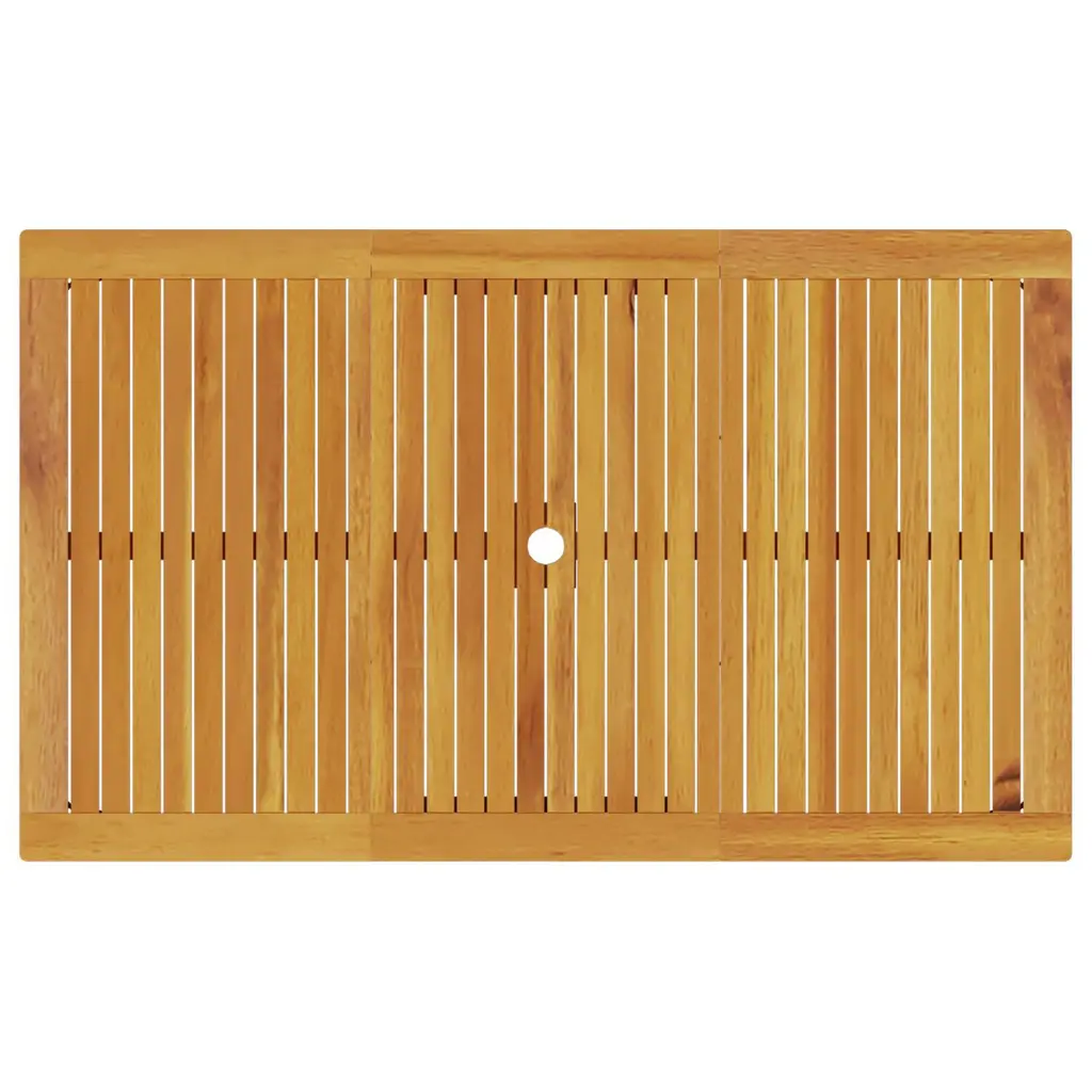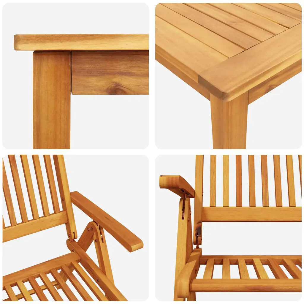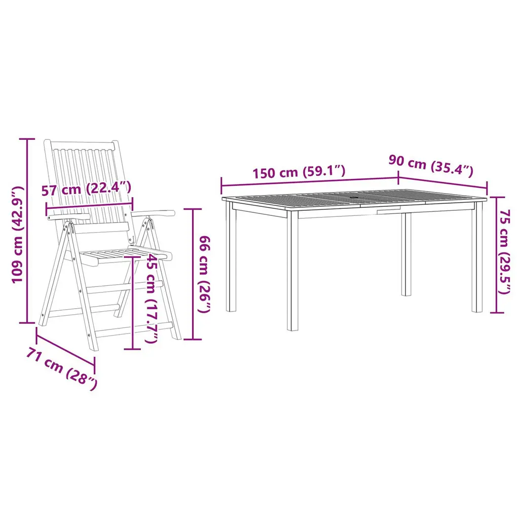 This foldable garden dining set is the definition of rustic charm, perfect for folks who love spending warm evenings dining outside. With its beautiful solid Acacia wood construction, this set combines style and practicality, while its earthy brown color fits in perfectly with any garden or patio. Made to seat your guests comfortably during spring and summer gatherings, this set is a versatile solution, showcasing natural beauty with its rugged yet classy design. Materials: This dining set is made from premium solid Acacia wood, known for its strength and ability to withstand the elements. The dense composition of Acacia wood ensures it lasts long while adding a lovely look to outdoor spaces. You'll love its natural tones, which boost the rustic charm of any garden or patio.Included Components: The dining set comes with comfy armrests and a nice backrest that are both functional and stylish, offering your guests ultimate comfort. The set pieces work together to create a seamless look that fits perfectly into outdoor areas.Features /Function /Design: Its foldable design allows for easy space saving while keeping elegance and functionality intact. This feature makes storing the set away effortless when it's not in use, while still being a stylish centerpiece during your outdoor get-togethers.Recommended Uses: Perfect for outdoor settings, this set shines in gardens and patios during the warm spring and summer months. Its adaptable design fits in effortlessly in any backyard, enhancing social gatherings with a welcoming vibe.Care &Maintenance: Keep this dining set looking great by occasionally wiping it down with a dry cloth. Stay away from harsh chemicals and store it indoors or in a shed during bad weather to keep it in tip-top shape over time.