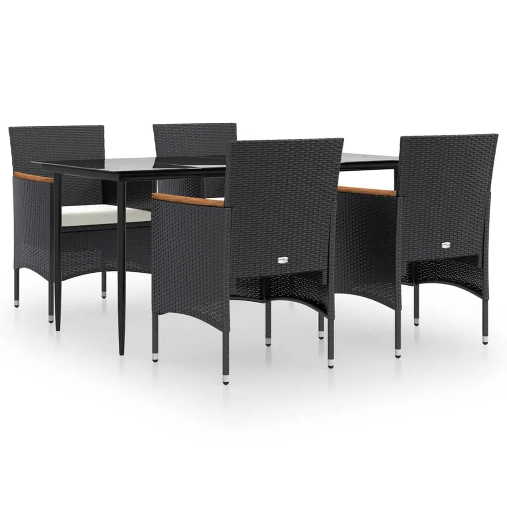 This 5 Piece Garden Dining Set includes a lovely table with four chairs, perfect for those long summer evenings spent dining outside or enjoying a cup of coffee in the garden. The modern vibe with grey and black tones and outdoor cushions makes it a beautiful fit for any terrace or balcony, creating a relaxed spot for family hangouts or entertaining guests. Weather-Resistant Materials: Made with tough PE rattan and a powder-coated steel frame, this set stands up to the weather, looking stylish for ages.Comfortable Seat Cushions: Each chair comes with nice, soft cushions that you can easily take off for cleaning, making meals a breeze.Modern Style: The neat and simple design fits perfectly with contemporary outdoor decor, making it a fab choice for sprucing up your garden.Adjustable Features: The chair backrests recline so you can get comfy just the way you like.Easy to Maintain: Thanks to the weather-resistant materials, you can enjoy your set without the hassle of lots of upkeep.