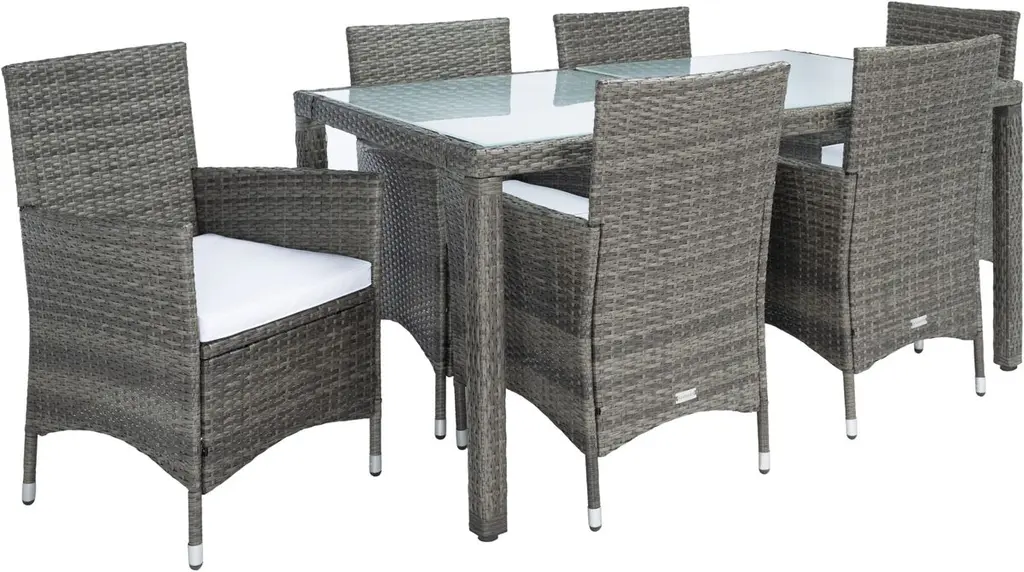 This 5 Piece Garden Dining Set combines modern style with practicality, featuring a smooth grey glass tabletop with four trendy chairs made from natural rattan. Perfect for outdoor meals on the balcony or patio, it creates a cozy and inviting vibe for family get-togethers or laid-back dining. Durable Construction: Made from weather-proof PE rattan and a strong steel frame, this dining set promises to last.Elegant Glass Top: The smooth glass surface adds a classy touch while being easy to keep clean.Versatile Use: Ideal for both indoor and outdoor spots, this set fits in anywhere from dining rooms to gardens.Comfy Cushions: Each chair has plush, removable cushions for added comfort while dining or relaxing.Compact Size: The set’s size is perfect for smaller areas, seating up to four comfortably.