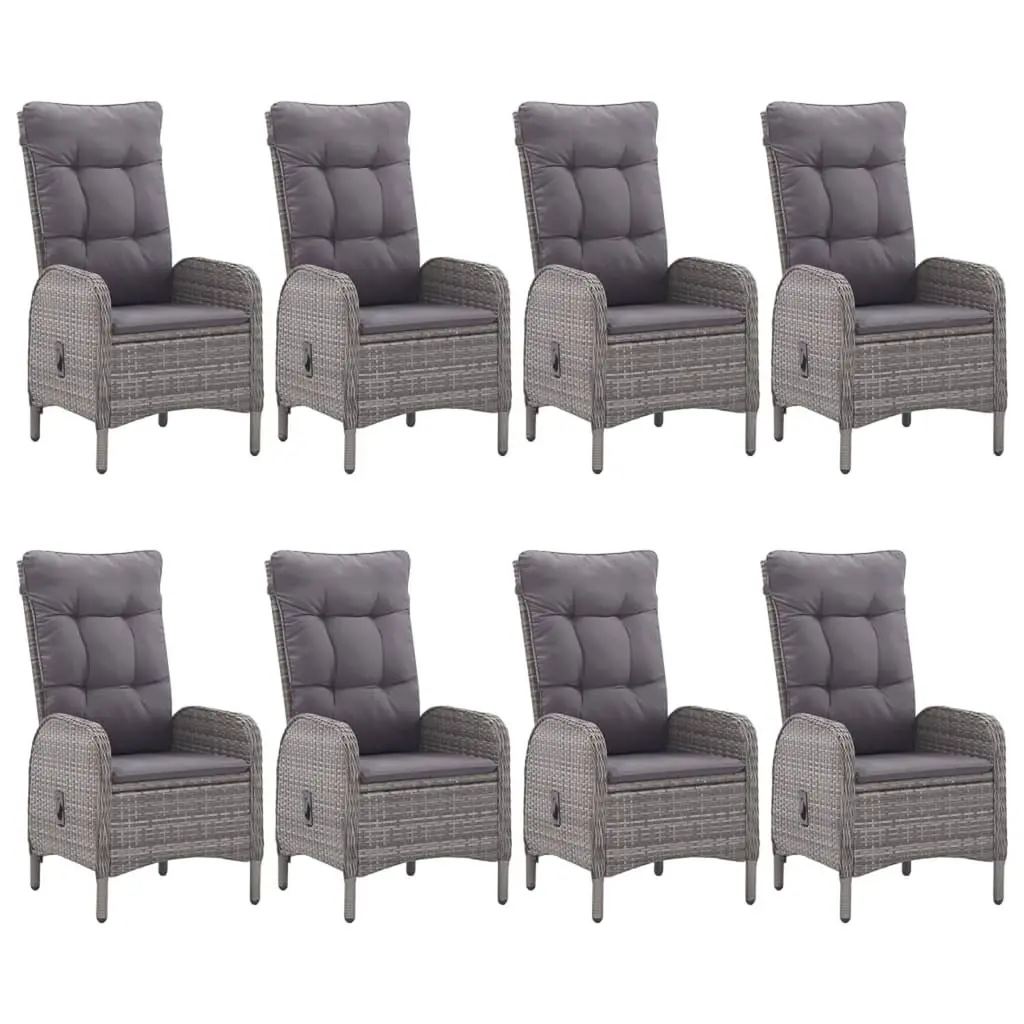 This 9-Piece Garden Dining Set in Grey is a stylish way to eat outside, mixing comfort and looks for your patio or garden. Its chic design makes it a great spot for family and friends during summer BBQs or cozy dinners, making your outdoor area even more inviting. Durable Materials: This set is made from weather-resistant PE rattan, designed to handle the elements while looking good. The high-quality materials make it a solid investment for outdoor furniture.Sleek Design: The grey color, oiled acacia wood finish, and sleek textures boost the aesthetic of your outdoor space and fit in well with different decor styles, adding a bit of class to informal dining.Ample Seating: Made for 8 people, this dining set is perfect for family get-togethers or outdoor parties, giving everyone a comfy place to eat together. Great for hosting friends on summer evenings.Easy Maintenance: With removable cushion covers that zip off, keeping them clean is a breeze. Just wipe the frames with a damp cloth for quick upkeep.Versatile Usage: Ideal for all sorts of outdoor spots, be it on a balcony, patio, or garden, catering to your dining needs while setting the scene in your outdoor space.