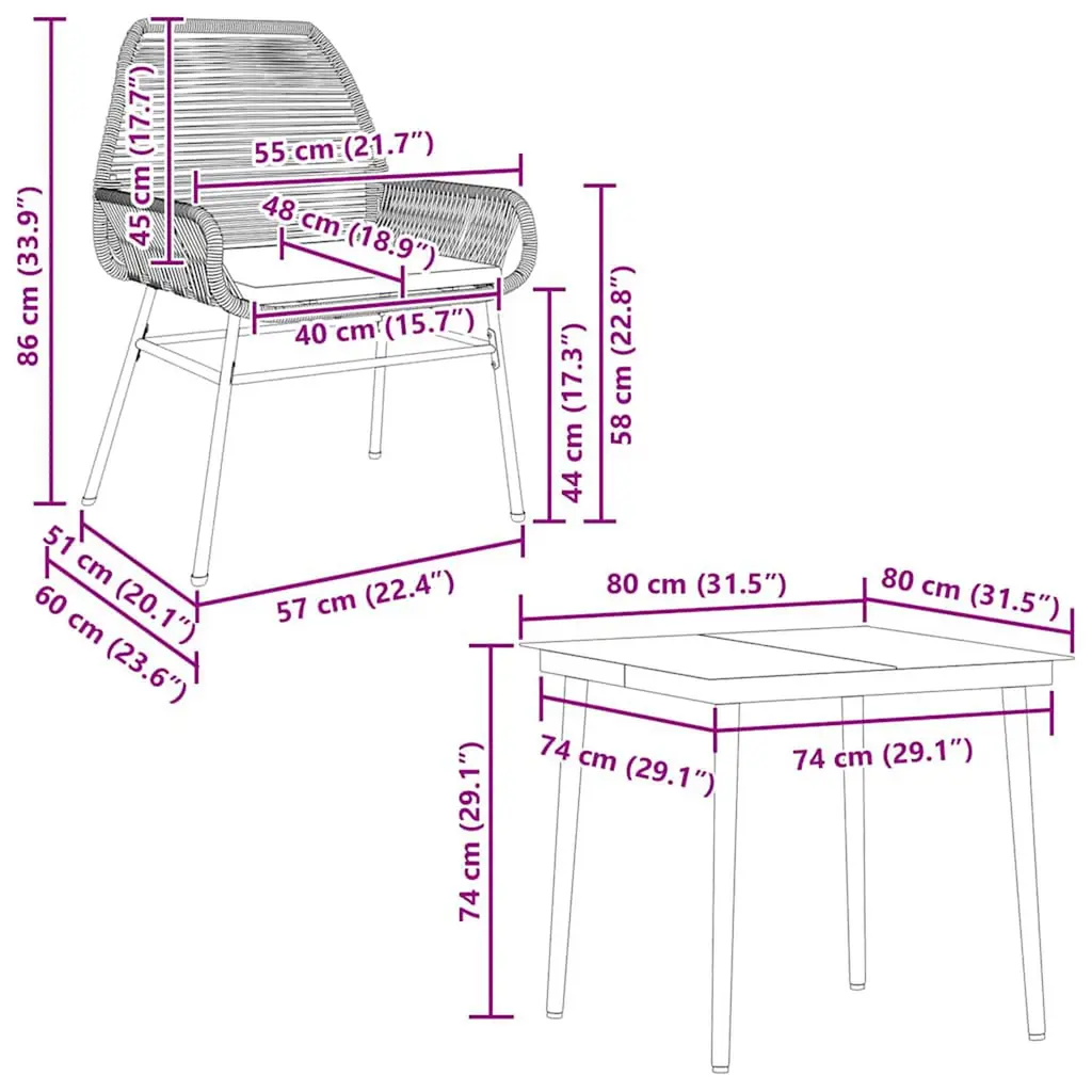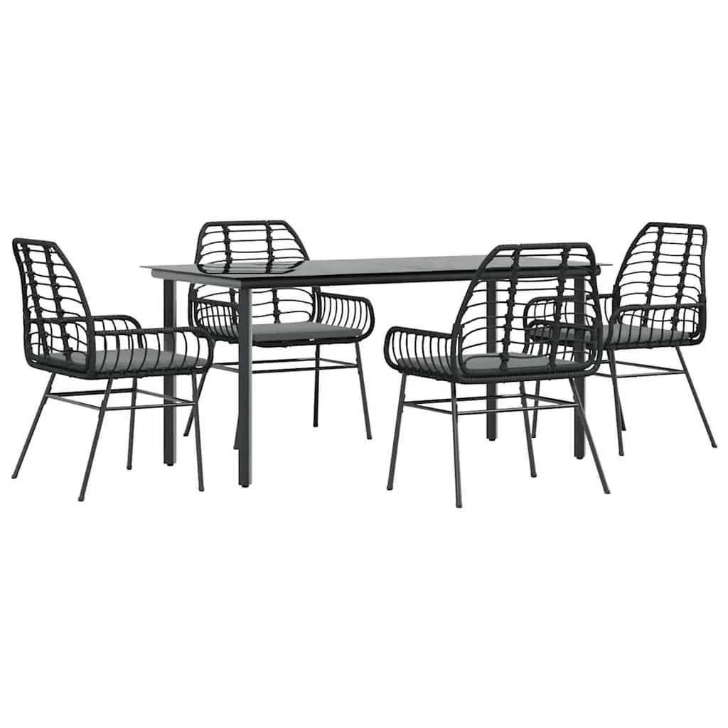 This 5-piece garden dining set is a lovely addition to any outdoor area, offering plenty of space and comfort for gatherings or quiet meals in the fresh air. Blending contemporary design with functional comfort, it comes with a stylish table and four chairs that fit perfectly with your patio, balcony, or garden vibe. Stylish Design: The modern look of this dining set adds a welcoming charm to any outdoor décor.Durable Material: Made from UV-resistant poly rattan, this set is built to withstand the weather while looking good.Comfortable Seating: Each chair has soft cushions with removable covers, making it easy to keep clean.Sturdy Construction: The powder-coated steel frame provides stability and helps resist rust, enhancing durability.Versatile Use: Great for alfresco dining, this set seats up to four, making it perfect for family meals or hosting friends, adding elegance and function to your patio.