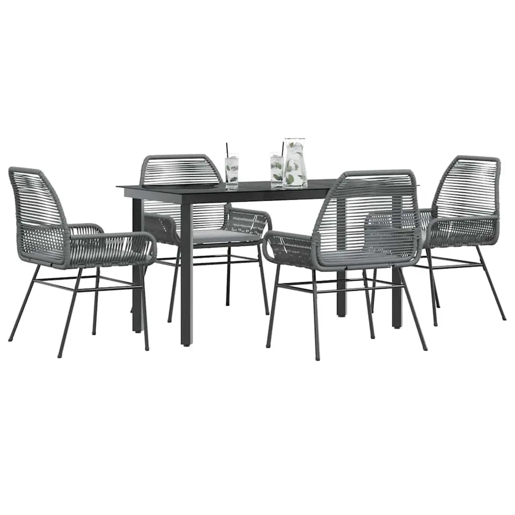 This 5-piece garden dining set combines elegant design with practicality, showcasing a modern style that brightens up any outdoor space. Built from sturdy materials, it includes a stylish rectangular table with tempered glass and four comfy chairs, making it perfect for outdoor dining or get-togethers with friends and family. Stylish Appearance: The set sports a chic grey poly rattan look, blending beautifully with outdoor aesthetics and providing a welcoming vibe for your garden or patio.Convenient to Clean: Each cushion comes with a removable cover, making cleaning a breeze and keeping the set fresh all year round.Comfort-Enhanced Features: The cushions are nicely padded for comfort, letting you and your guests enjoy longer meals without any fuss.Robust Construction: Made from UV-resistant materials, the set can handle sun exposure, ensuring it stays beautiful and functional for a long time.Practical Dimensions: The set accommodates up to four people easily, making it great for small gatherings, barbecues, or quiet meals outdoors.