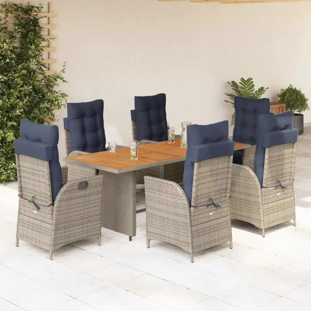 This 9 Piece Garden Dining Set is made for outdoor lovers wanting style and comfort while they eat. Crafted with solid synthetic poly rattan and robust acacia wood, this set combines aesthetic charm with function, creating a welcoming space to enjoy meals or chill with family and friends in your garden, patio, or balcony. Adjustable Armrests: The armrests on each chair can be easily adjusted to provide personalized comfort for everyone, perfect for different heights and preferences.Durable Construction: Made from high-quality, water-resistant poly rattan and strong metal, this set is designed for outdoor use and can resist UV damage.Detachable Cushions: Each chair comes with removable seat and back cushions that have zippers for easy cleaning and maintenance.Spacious Comfort: With seating for up to 8 guests, this dining set ensures everyone can gather comfortably for meals and chats outdoors.Elegant Design: The modern design with sleek lines and neutral colors fits various outdoor styles, making it a great addition to any space.