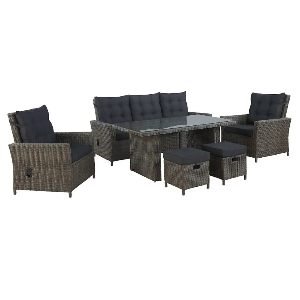 This 5-piece garden dining set is spot on for outdoor get-togethers, featuring a rectangular table and four comfy armchairs. The nice grey tones and sleek design fit right in with any outdoor vibe, making it a fab choice for laid-back family or friend hangs on a patio or balcony. Durable PE rattan: This garden dining set is well-made with weather-resistant PE rattan for lasting use against the outdoors.Comfy cushions: Soft seat and back cushions mean you can enjoy long meals without getting sore.Space-saving design: The stackable chairs are a breeze to store away when not in use, saving space in tight spots.Stylish and modern: Its contemporary vibe with a sleek powder-coated finish adds a chic touch to any outdoor setting.Easy maintenance: The materials are easy to clean and look fresh season after season.