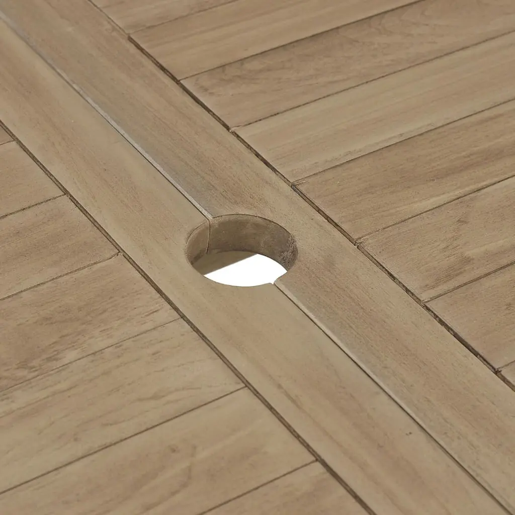 This Garden Dining Set is a smart and functional pick for your outdoor dining. It comfortably seats six, with a rectangular table and folding chairs that blend in nicely with any garden or balcony. The stylish grey finish enhances the natural beauty of solid teak wood, giving it a modern yet classic vibe. Natural Material: Made from top-quality solid teak wood, showcasing the beauty of natural materials and ensuring long-lasting durability. The smooth texture and oiled finish enrich the seating experience, providing a warm touch ideal for family meals or gatherings with friends.Weather Resistant: This robust dining set is made to handle the outdoors. Enjoy your al fresco dining no matter the weather, making it a reliable addition to your patio or garden.Adjustable Features: Thanks to its foldable chairs, it’s a breeze to store away when space is tight. Just fold them up when you're done, keeping your outdoor area neat and stylish.Comfortable Seating: Designed for optimal support, the chairs come with a carved wooden armrest, ensuring comfy dining for you and your guests, making it perfect for long meals.Versatile Use: Perfect for any occasion, whether it’s a BBQ or a classy dinner, this versatile dining set provides the perfect setting for your outdoor gatherings.