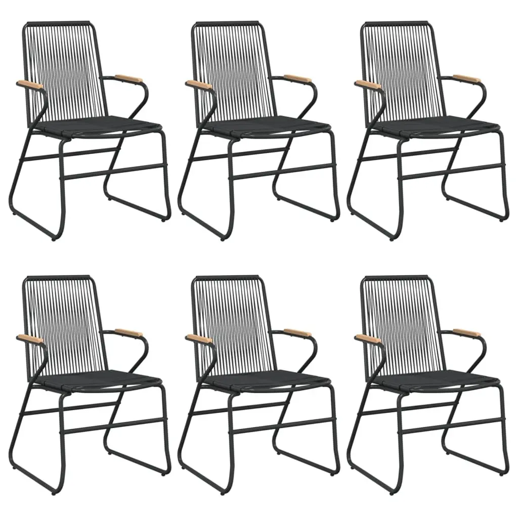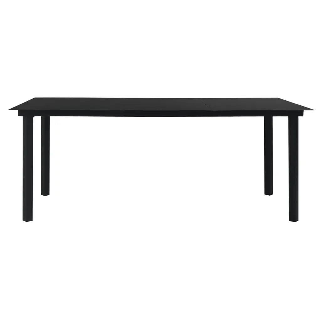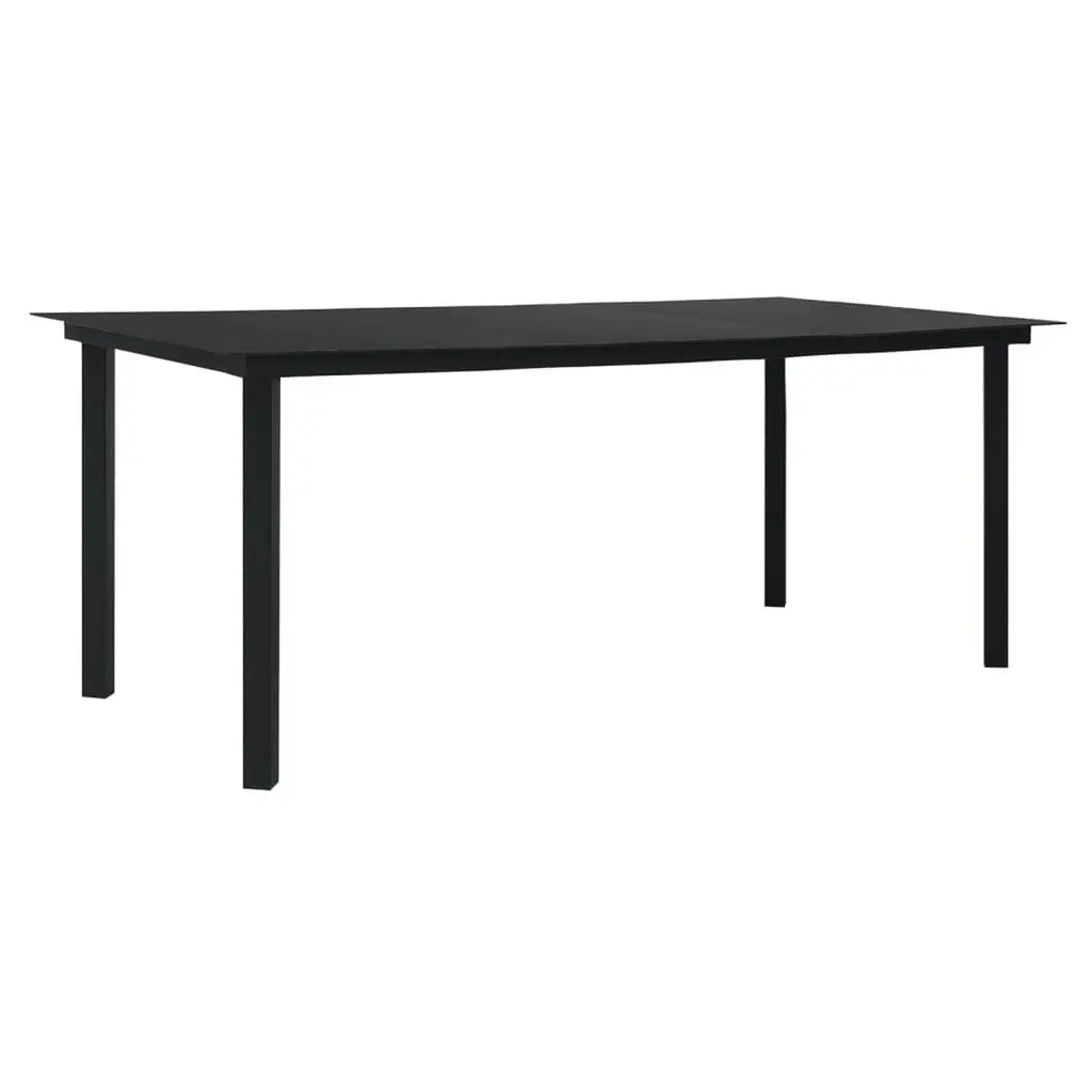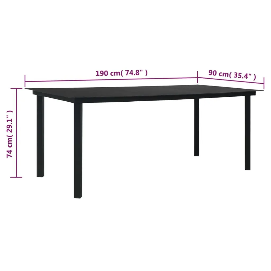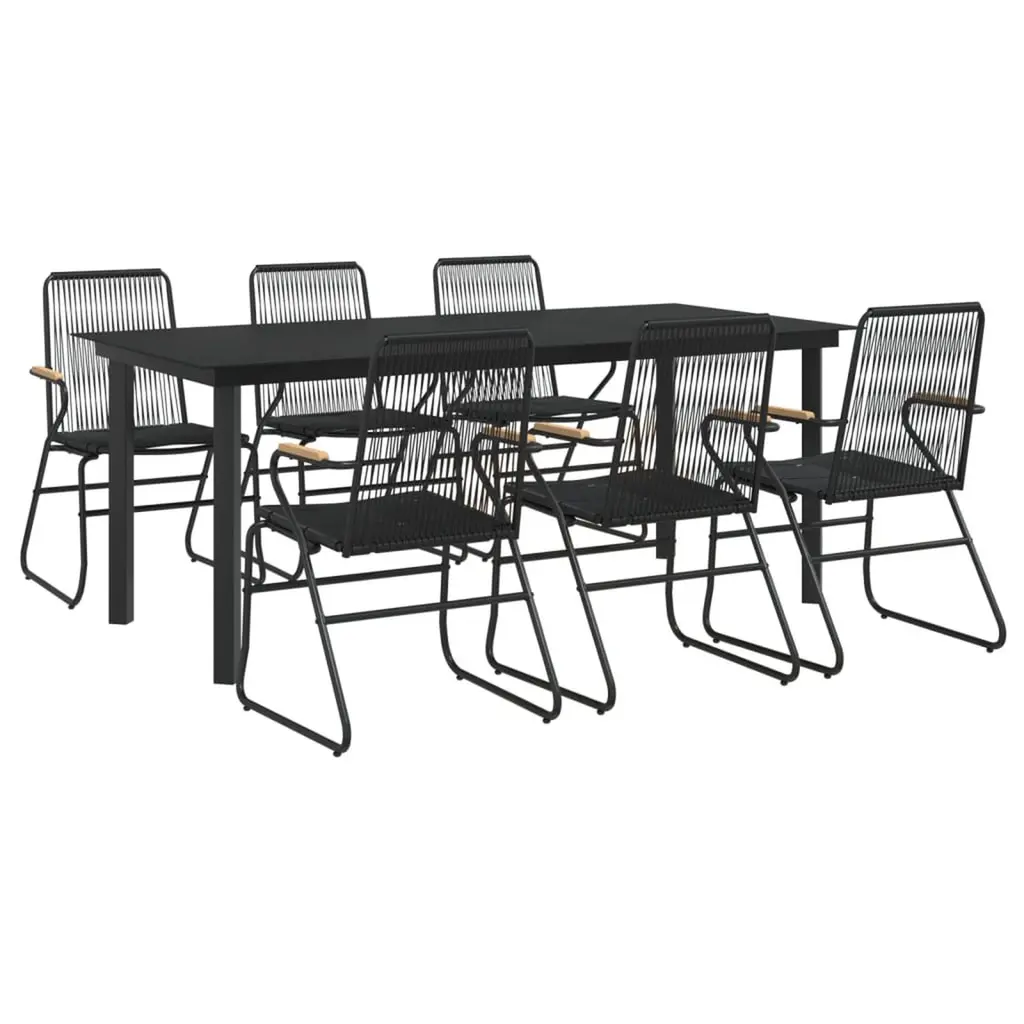 This 7-Piece Black Garden Dining Set is a stunning mix of durability and style, perfect to spruce up your outdoor areas. With a rectangular table and six classy chairs, it not only gives enough space for family and friends but also adds a stylish touch to your balcony, terrace, or garden. The sleek black color and design make it fit right in with your outdoor setup, creating a warm atmosphere for meals in the fresh air or chill gatherings. Made with a powder-coated steel frame for lasting quality, able to endure the elements while keeping its good looks.Teak wood armrests make it comfy for long meals, perfect for entertaining guests.This chic black garden dining set is fab for dining or coffee meets, creating a comfy and stylish eating area.The long table surface at 74.8 in. offers plenty of space for food and decor, making dining more inviting.Includes 6 comfortable and stable chairs, with a smooth touch and helpful ergonomic backrest height of 33.7 in.