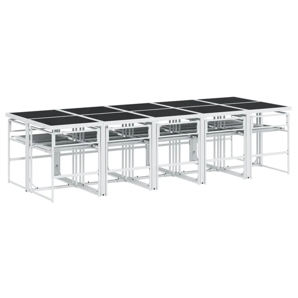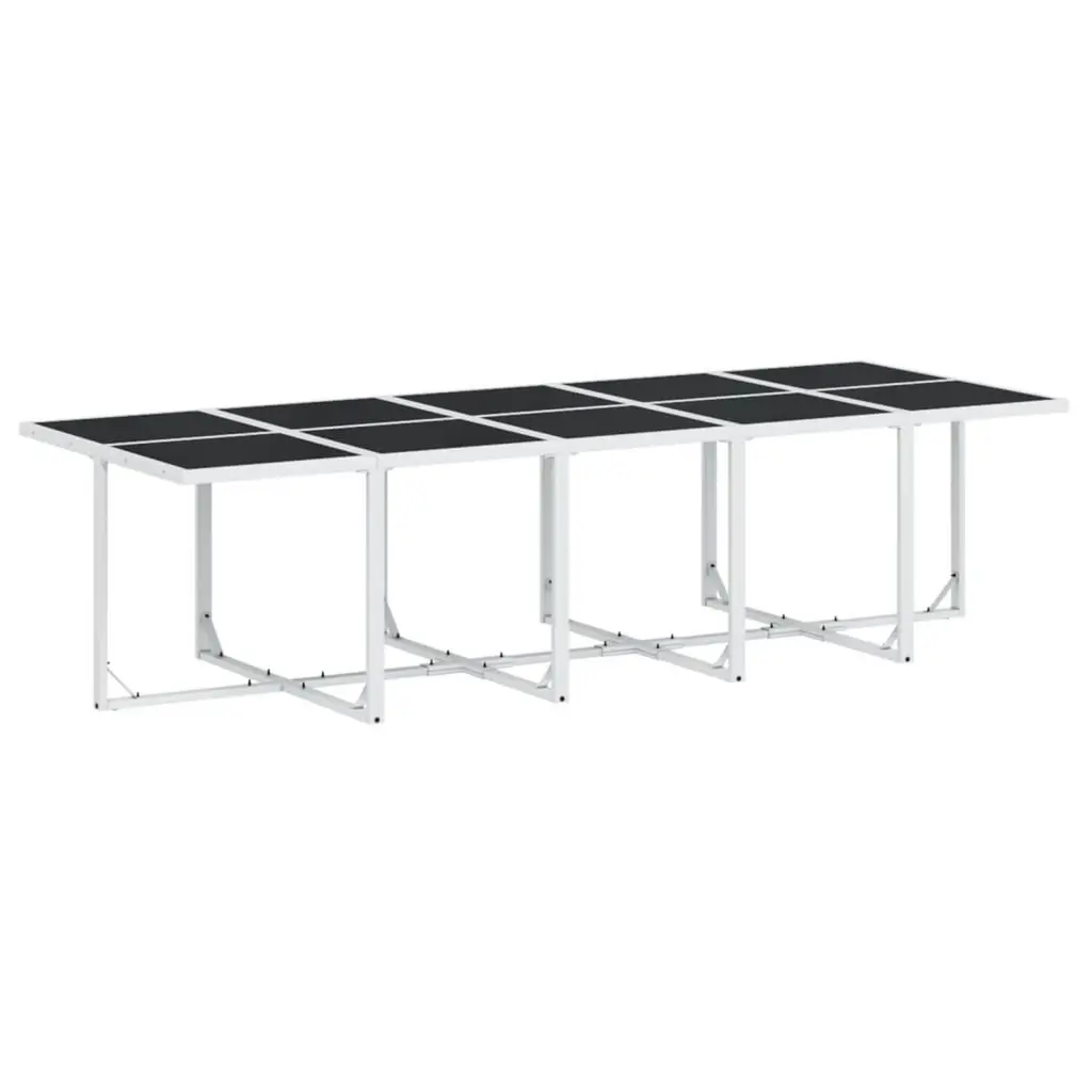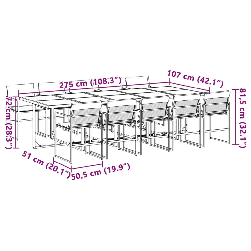 This garden dining set offers a classy solution for outdoor meals, boasting a modern design and comfy features. Made with top-notch materials like powder-coated steel and tough Textilene, it includes ten chairs and a spacious rectangular table that’s fab for family gatherings or al fresco parties in your garden or patio. High-Quality Frame: Built from powder-coated steel, this garden set is seriously durable, ensuring it lasts even with regular outdoor use. The surface finish keeps it protected against rust and the weather, so it can handle the elements.Comfortable Seating: The set comes with comfy cushions made from weather-resistant fabric, making those long meals much more enjoyable. You'll definitely relax while soaking in the outdoors.Adjustable Design: With a foldable design, the chairs store away easily when you're done, giving you the flexibility to make the most of your outdoor space. They don’t take up much room, perfect for seasonal storage.Spacious Dimensions: The table measures 108.3 in long and 42.1 in wide, making it ideal for entertaining. It fits ten dining chairs, perfect for get-togethers.Stylish Aesthetic: The sleek white and anthracite color combo adds a fresh touch to any outdoor space, blending seamlessly with a range of garden styles. A great way to elevate your backyard or patio vibe.