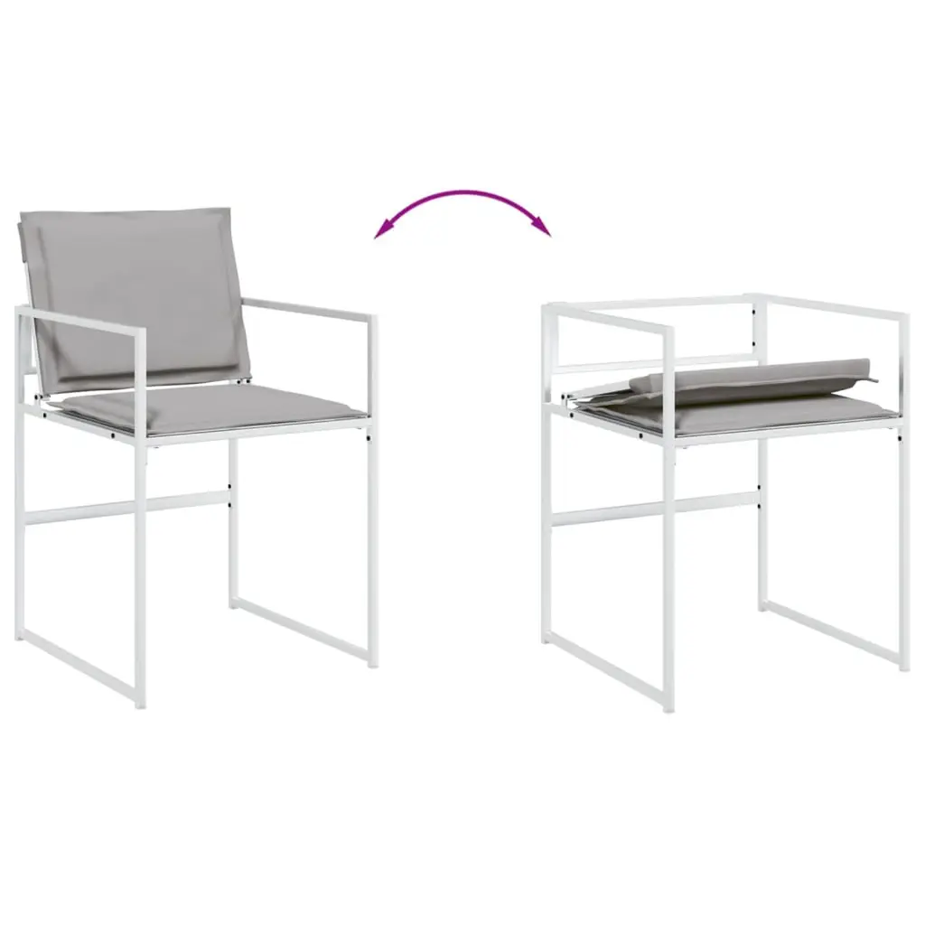 This 5-Piece Modern Garden Dining Set gives you a lovely and stylish outdoor dining experience, perfect for hanging out with family and friends. The sleek design, with a great mix of white and light gray tones, really jazzes up any patio or garden, all while keeping it comfortable and classy for outdoor meals. Stylish Aesthetic: The modern design, enhanced with white and light gray tones, creates a chic outdoor atmosphere, making it ideal for entertaining or quiet meals.Comfort-Oriented: Each chair features generous cushions that provide support and comfort during extended dining, perfect for lounging in the sunshine.Durable Construction: Made with powder-coated steel and textilene fabric, this set withstands fading, water, and UV damage, so it'll last outdoors.Versatile Usage: Great for outdoor dining or casual gatherings, this set fits up to 4 people, making it ideal for family meals or social events.Convenient Storage: The foldable and stackable chairs make storage easy when not in use, maximizing your outdoor space.