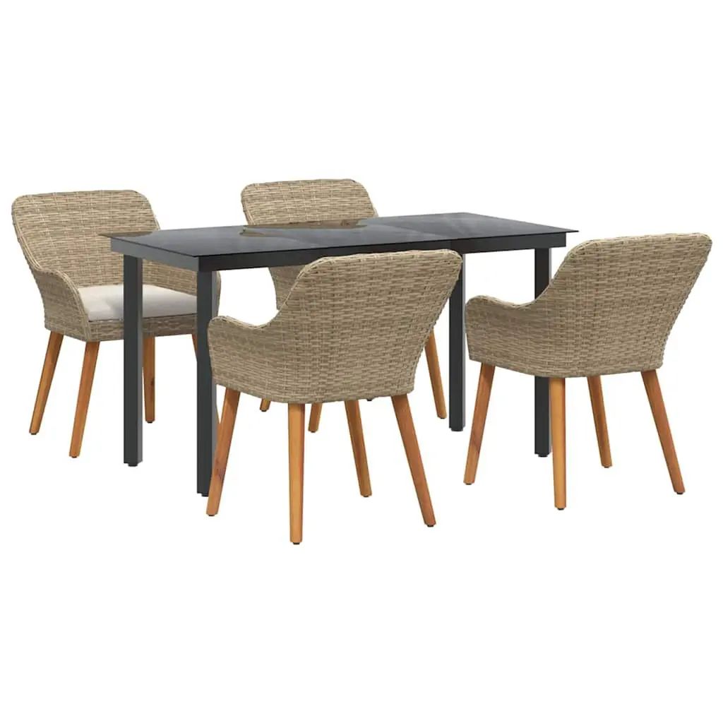 This outdoor dining set gives you a stylish and comfy eating area, perfect for hanging out with friends or family. It’s designed with a modern vibe that makes your backyard or patio look fantastic, creating a nice space for outdoor meals when it’s warm. Made from sturdy poly rattan, it pairs well with both simple and fancy garden styles. Durable Materials: With high-quality poly rattan and strong steel, this set can endure whatever the weather throws at it all year round. It’s built to resist rain, UV rays, and wear, making it perfect for your outdoor parties. You can count on it to stay sturdy and keep looking good after countless gatherings.UV-Resistant Quality: This set features UV-resistant materials that keep it bright and strong, preventing it from fading in the sun. So, it’ll always look great, keeping your outdoor space fresh no matter the season.Sleek Table Design: Check out the beautiful patio table with its sleek glass top. It's easy to clean and looks fantastic, combining style with practicality to make your outdoor dining enjoyable.Comfortable Seating: This dining set comes with comfy seat cushions that have handy zippers, making long meals outside a breeze. The poly rattan chairs not only look stylish but also prioritize comfort, perfect for those lazy summer days.Care & Maintenance: To keep your set in top condition, use covers when it’s not in use. This protects it from harsh weather and helps it last longer. Plus, it’s easy to maintain, so you can focus on enjoying your outdoor space.