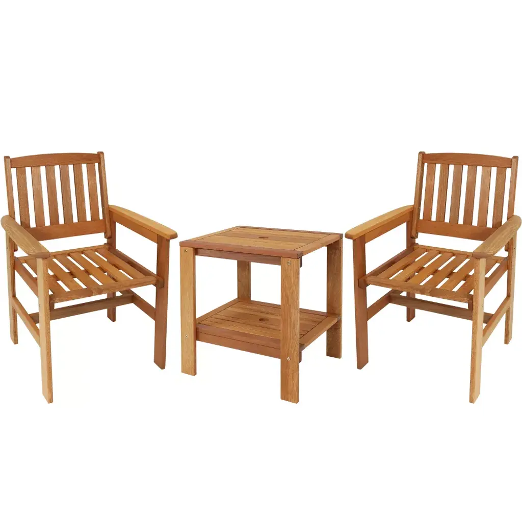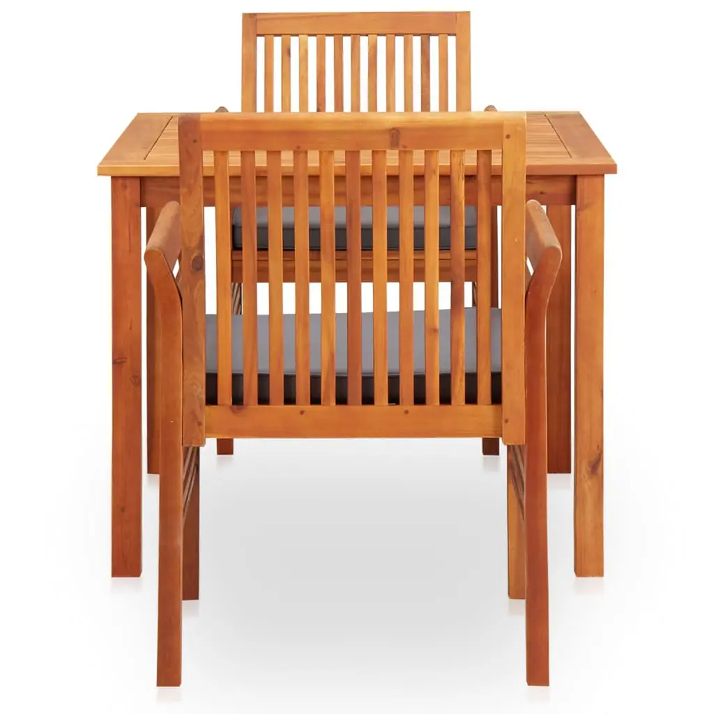 This 3 Piece Outdoor Dining Set is a great mix of style and practicality, made for modern outdoor spaces. Built from solid acacia wood, it has a lovely brown finish paired with dark grey cushions, perfect for creating a welcoming atmosphere for dining or hanging out with friends. Stylish Design: The set's smooth square shape and clean lines elevate any outdoor space, making it a fab choice for balconies or patios.Durable Material: Made from solid acacia wood with an oiled finish, this dining set promises longevity while adding a natural vibe to your outdoor decor.Comfortable Seating: Comes with thick cushions from weather-resistant fabric, delivering a comfy spot for those long, sunny brunches outside.Weather Resistance: Built to withstand the elements, the cushions keep moisture at bay, and the solid wood structure remains sturdy through the seasons.Easy Maintenance: Simple care steps mean the furniture lasts, letting you enjoy it with little fuss all year round.