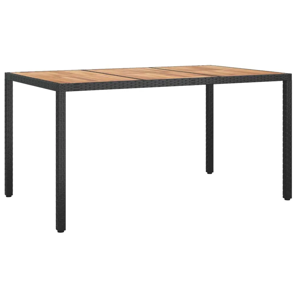 This 5-piece patio dining set mixes style and functionality, making it perfect for outdoor meals. With a beautifully made rectangular table topped with solid acacia wood and four comfy chairs, it offers a modern look while being durable for various outdoor settings, including your garden, balcony, or conservatory. **Durability**: Made from weather-resistant materials, this set holds up to the elements and is reliable all year round.**Comfort**: Each chair's got plush, removable cushions that boost your seating experience during meals and get-togethers.**Modern Design**: The sleek black poly rattan mixed with a solid wood table top gives a contemporary vibe that fits in with any outdoor style.**Versatile Usage**: Whether you’re hosting a barbecue or having a quiet dinner, this set is perfect for any occasion, making it a great piece for your outdoor collection.**Easy Maintenance**: The powder-coated steel frame is a breeze to clean, keeping your dining set looking its best.