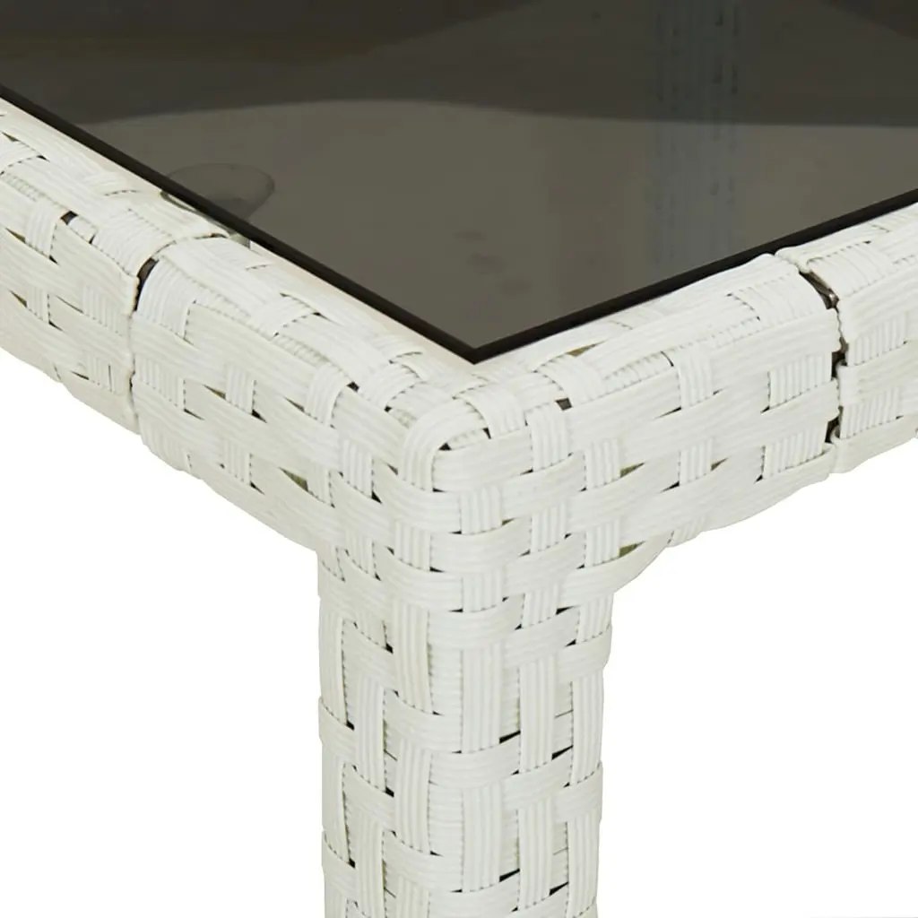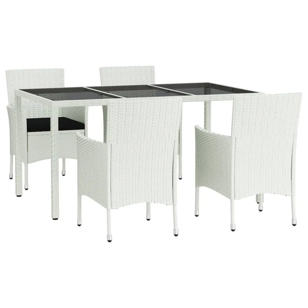 This 5-piece patio dining set adds a splash of modern style to your outdoor area, making it ideal for laid-back dinners or fun get-togethers. With a striking white finish and sturdy poly rattan plus powder-coated steel frame, this set not only looks great but is comfy and resilient, perfect for chilling in your garden, balcony, or patio. Durability: Built with strong steel frames and weather-proof PE rattan, this patio dining set is made to last, offering stability and longevity for regular use. It's designed for outdoor living, so it can handle sun and rain without losing its appeal.Comfort: Each chair has thick, comfy cushions that are easy to remove and clean, thanks to the zip closure. This nice touch makes lounging outdoors as comfy as sitting on your favorite indoor furniture.Modern Design: The stylish, contemporary lines of this dining set boost your outdoor space, with a smooth tempered glass top that looks great while being practical for dining and relaxing.Versatile Setup: Perfect for any occasion, this set works well in different outdoor settings, whether it's a summer BBQ bash or a peaceful dinner alfresco. Adaptable and stylish, it suits any mood.Space Efficient: The compact table at 59.1 in long can fit 5 people, great for intimate gatherings while providing plenty of room without overwhelming your patio or deck.
