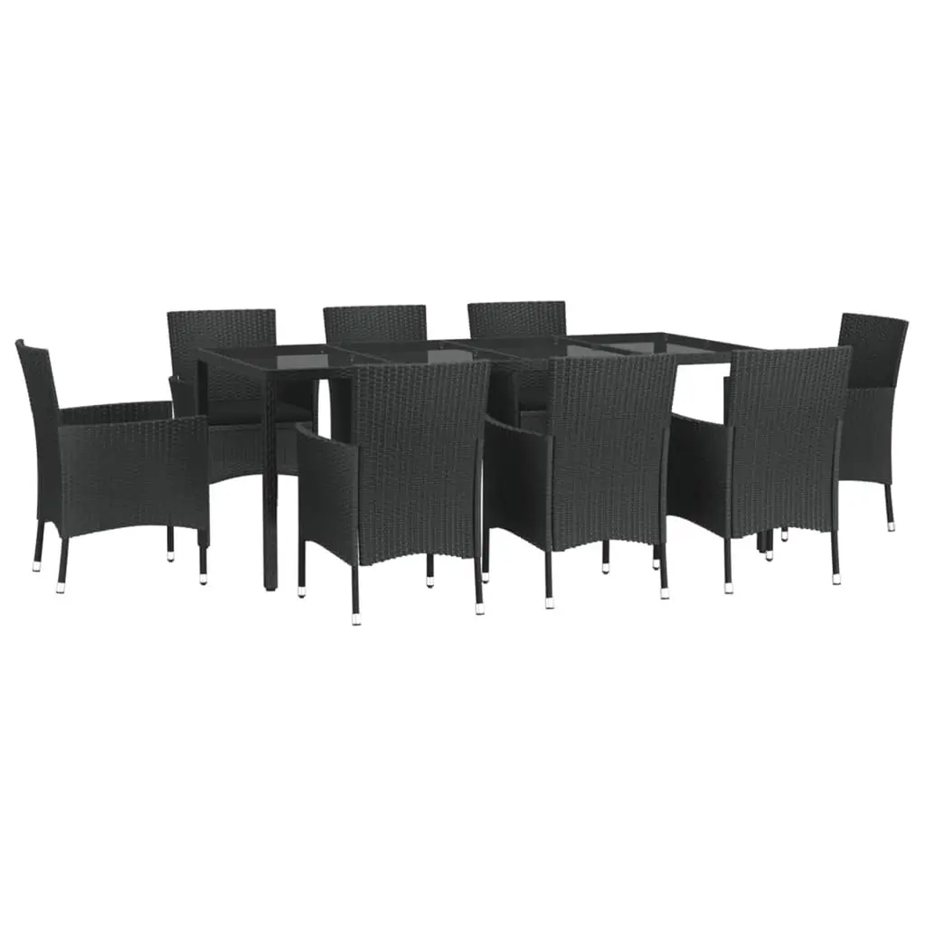 This modern 9-piece patio dining set is just what you need to spruce up outdoor spaces, great for family dinners or hanging out with friends. It's got a sleek design and solid build, making it a fab focal point for any garden, balcony, or patio, mixing comfort with style for adults. Weather-Resistant Material: Built from tough poly rattan, this dining set stands up to the weather, ensuring it lasts and is easy to clean.Adjustable Features: The multi-position backrest and adjustable armrests let you set it up just how you like, making sure you’re relaxed while you eat.Elegant Finish: The matte black gives it a flashy look that fits in with any outdoor setup.Complete Dining Experience: The set includes a spacious rectangular table and eight snug chairs with lovely cushions, perfect for family get-togethers or fancy meals.Easy Care Instructions: Just wipe it down with a damp cloth to clean. The cushions come with removable covers and zippers for easy upkeep.