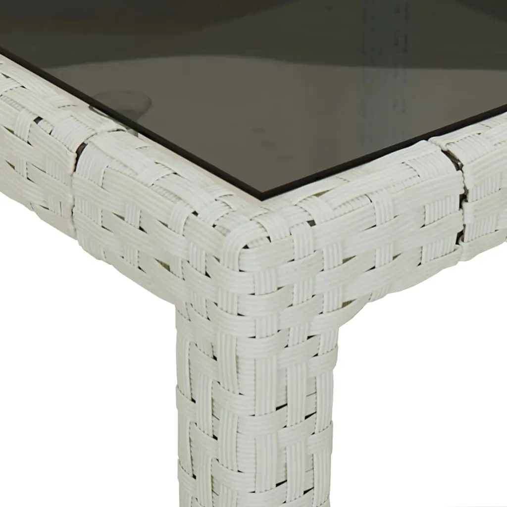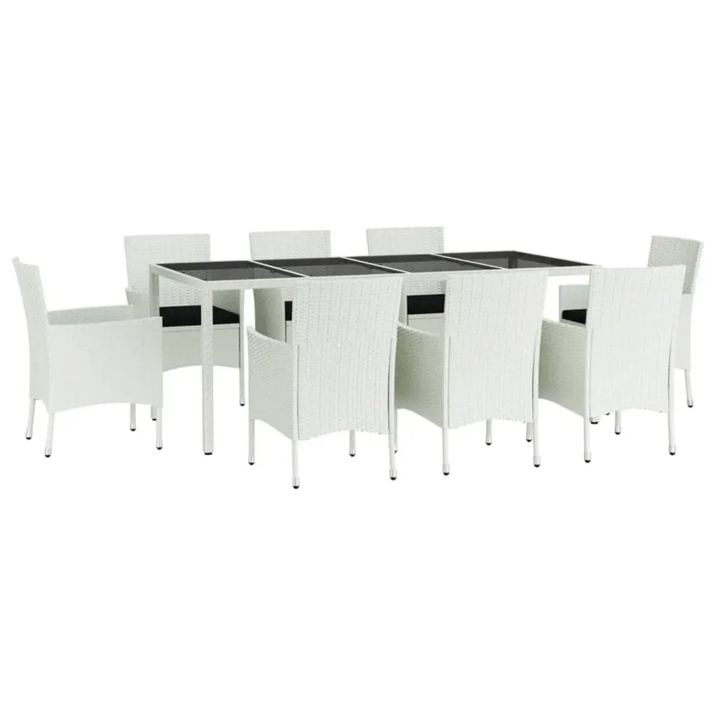 This 9-Piece patio dining set brings a touch of style and great functionality for your outdoor get-togethers, making it spot on for hosting friends and family. With a striking mix of white poly rattan and tough powder-coated steel, it creates a modern yet comfy vibe for outdoor dining. Perfect for outdoor dining: Can seat up to 9 people easily.Weather-proof materials: Gorgeous poly rattan designed to handle the weather.Comfort-first design: Thick, removable seat cushions make meals comfy.Chic modern look: Sleek lines and a stylish design enhance any outdoor setting.Adjustable features: Armrests can be adjusted for personal support and comfort.