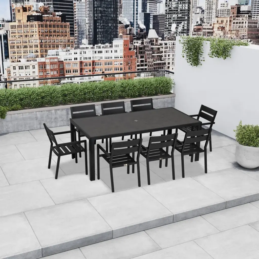 This 9-piece outdoor dining set will bring refinement and relaxation to your favorite outdoor space. Enjoy the simple elegance of its plush cushions, gentle angles and minimalist design that is perfect for patios - large and small. Its fully-welded aluminum frames are treated with a powder-coated finish to ensure lasting performance across the seasons. Optional cushions are made in the USA with quick-drying, dacron and UV-treated, marine-grade PremoBond thread to create a supportive, yet comfortable seat that is meant to last throughout the seasons.