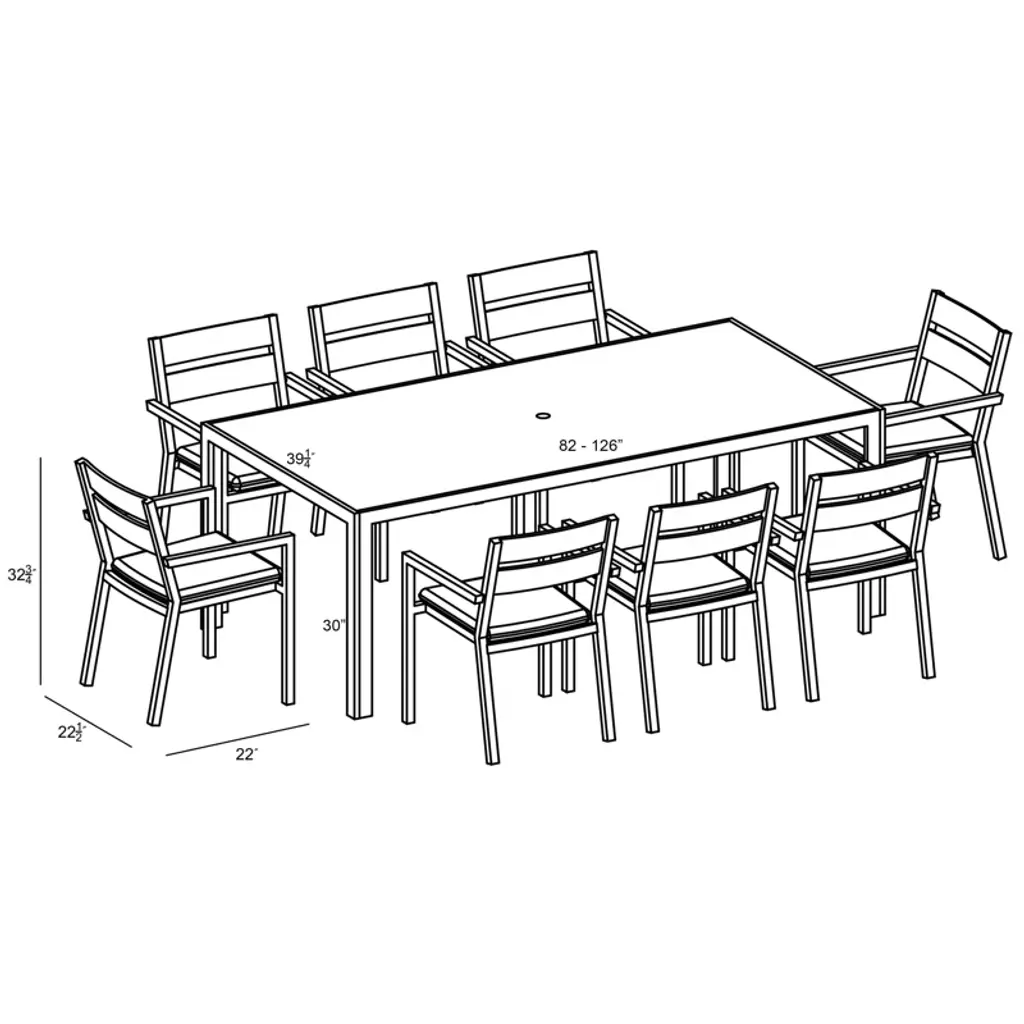 The 9-piece dining set will bring refinement and relaxation to your favorite outdoor space. Enjoy the simple elegance of its plush cushions, gentle angles, and minimalist design that is perfect for patios - large and small. Its fully welded aluminum frames are treated with a powder-coated finish to ensure lasting performance across the seasons. Optional cushions are made in the USA with quick-drying, dacron, and UV-treated, marine-grade premobond thread to create a supportive, yet comfortable seat that is meant to last throughout the seasons. The chairs are paired with the dining table, which boasts modern lines and durable, low-maintenance materials.