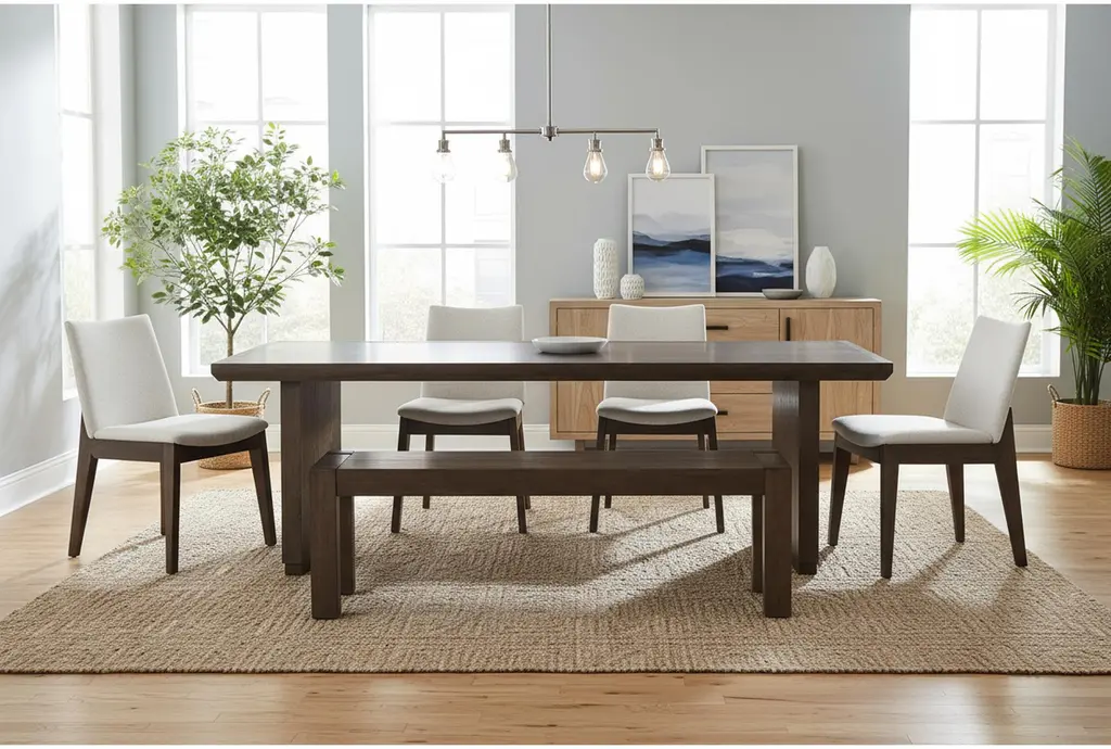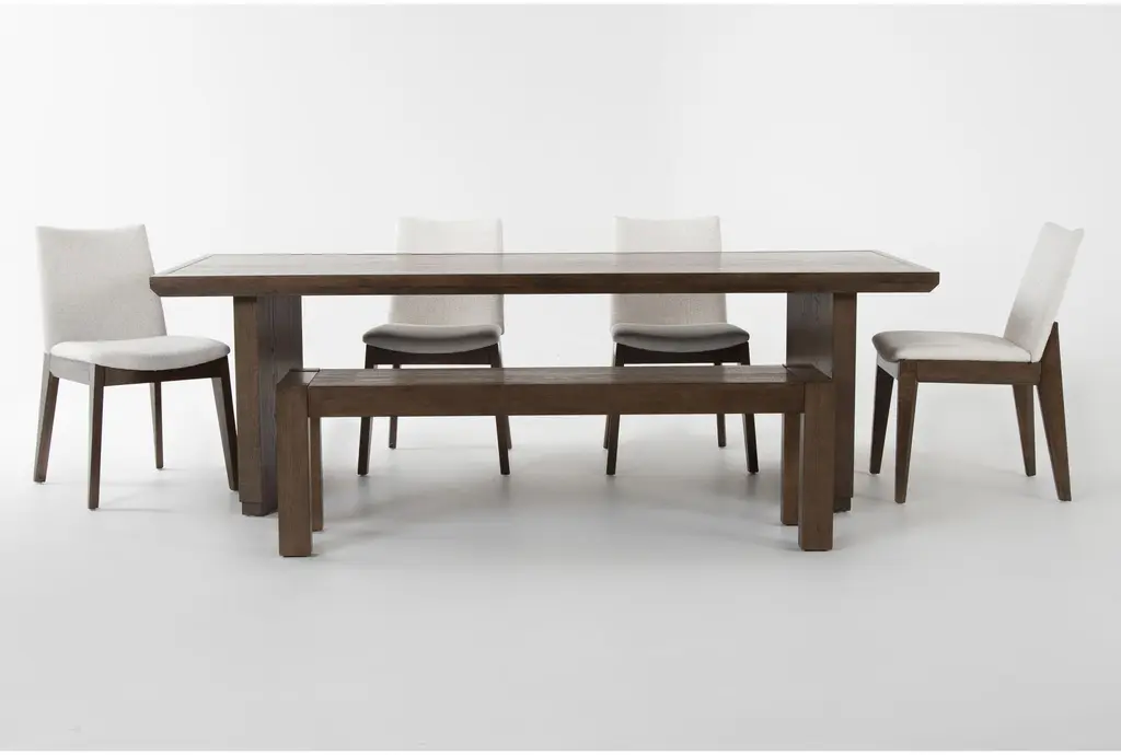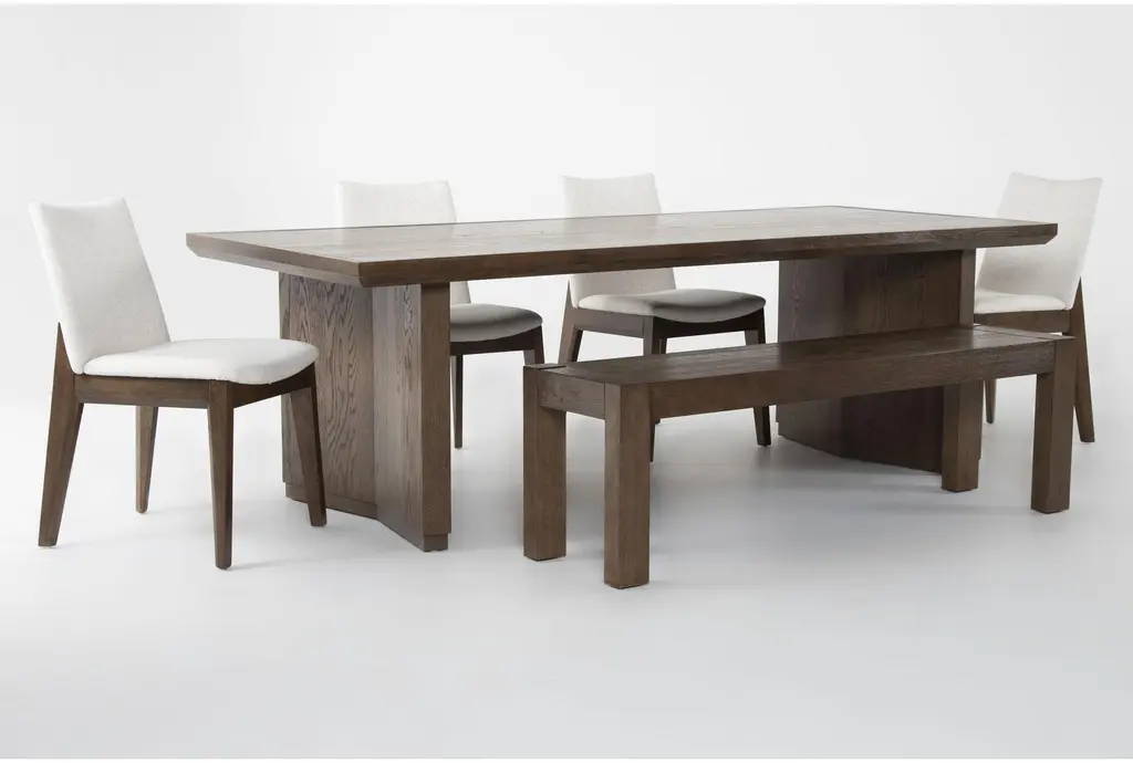 Voyage Brown 94" Trestle Dining With Bench + Upholstered Chair Set For 6 By Nate Berkus + Jeremiah Brent