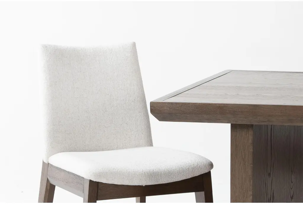 The Voyage Brown 94" Trestle Dining Set with Bench and Upholstered Chair for 8 by Nate Berkus and Jeremiah Brent is a stunning addition to any dining room or kitchen. This modern set features a rectangle-shaped table made from solid hardwood and cathedral oak veneers, providing a durable and stylish surface for meals and gatherings. The set includes a bench and armless upholstered chairs, offering comfortable seating for up to eight people.