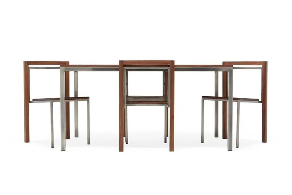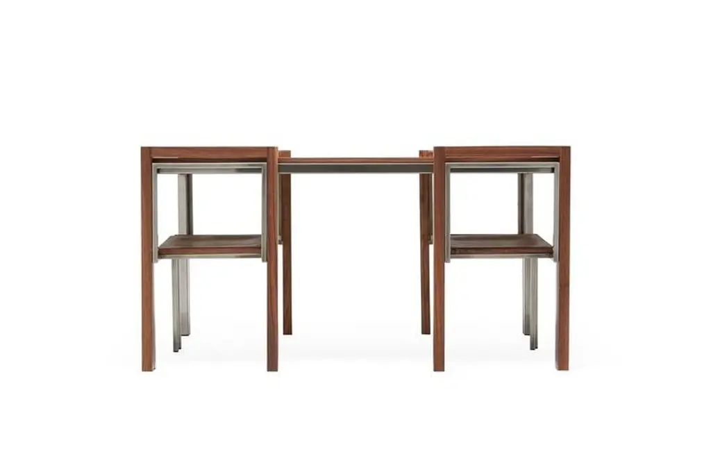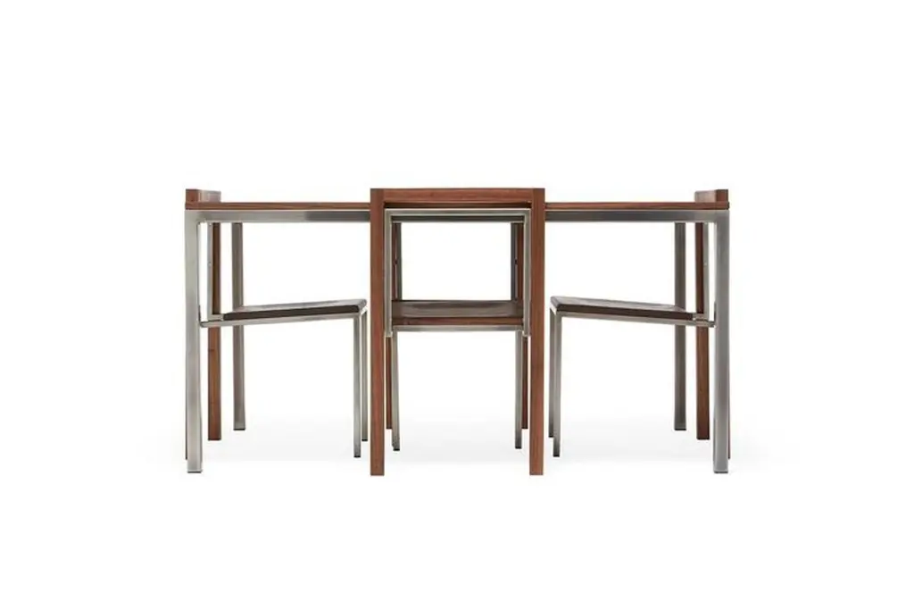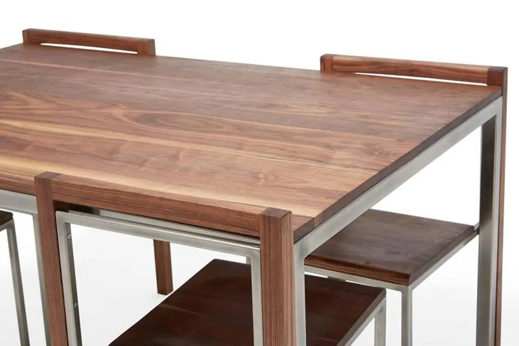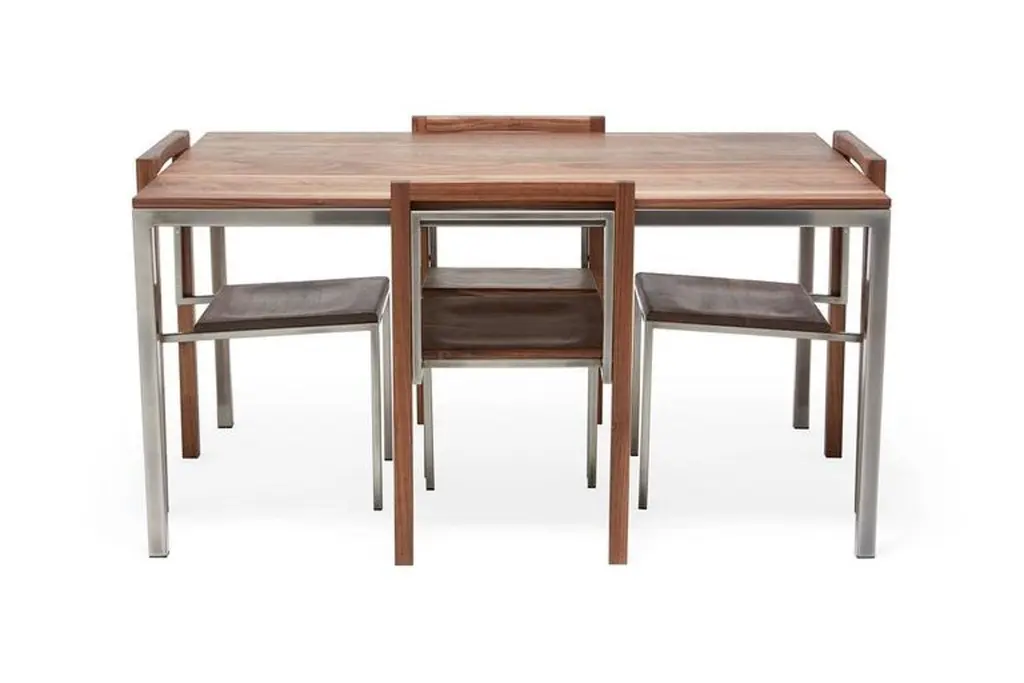 Dining goods are one of the newest additions to Stephen Kenn's The Inheritance collection. A solid walnut and steel dining table with simple and modern lines, with a set of four matching chairs.This item is made to order in Los Angeles.Interested in different wood or metal finish. Please message us for information about custom materials and dimensions.