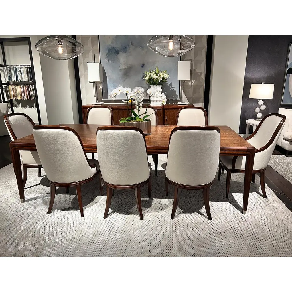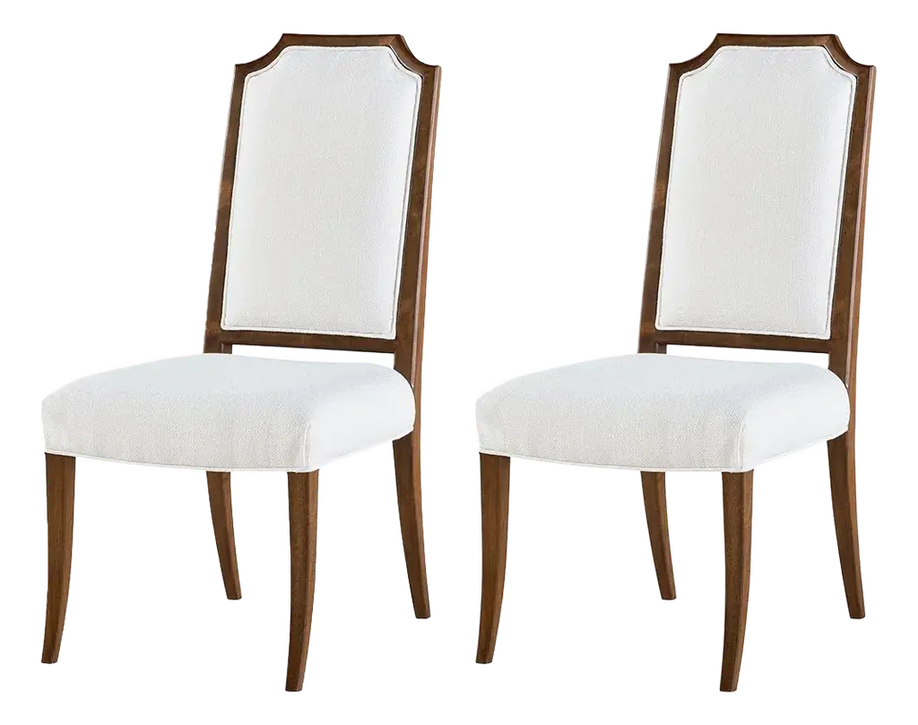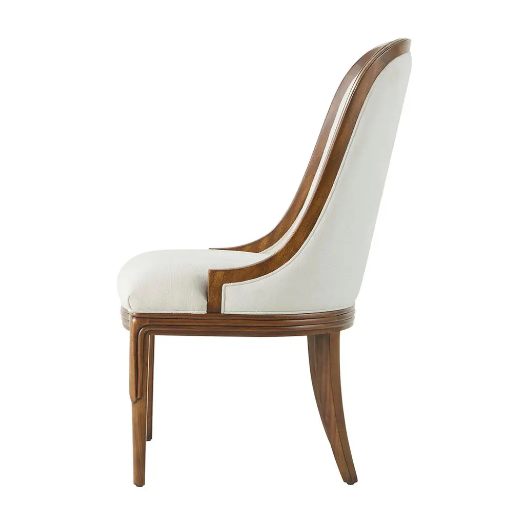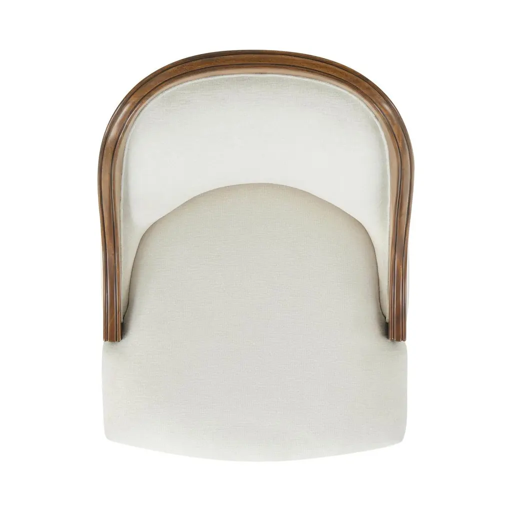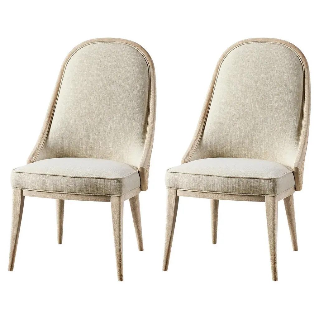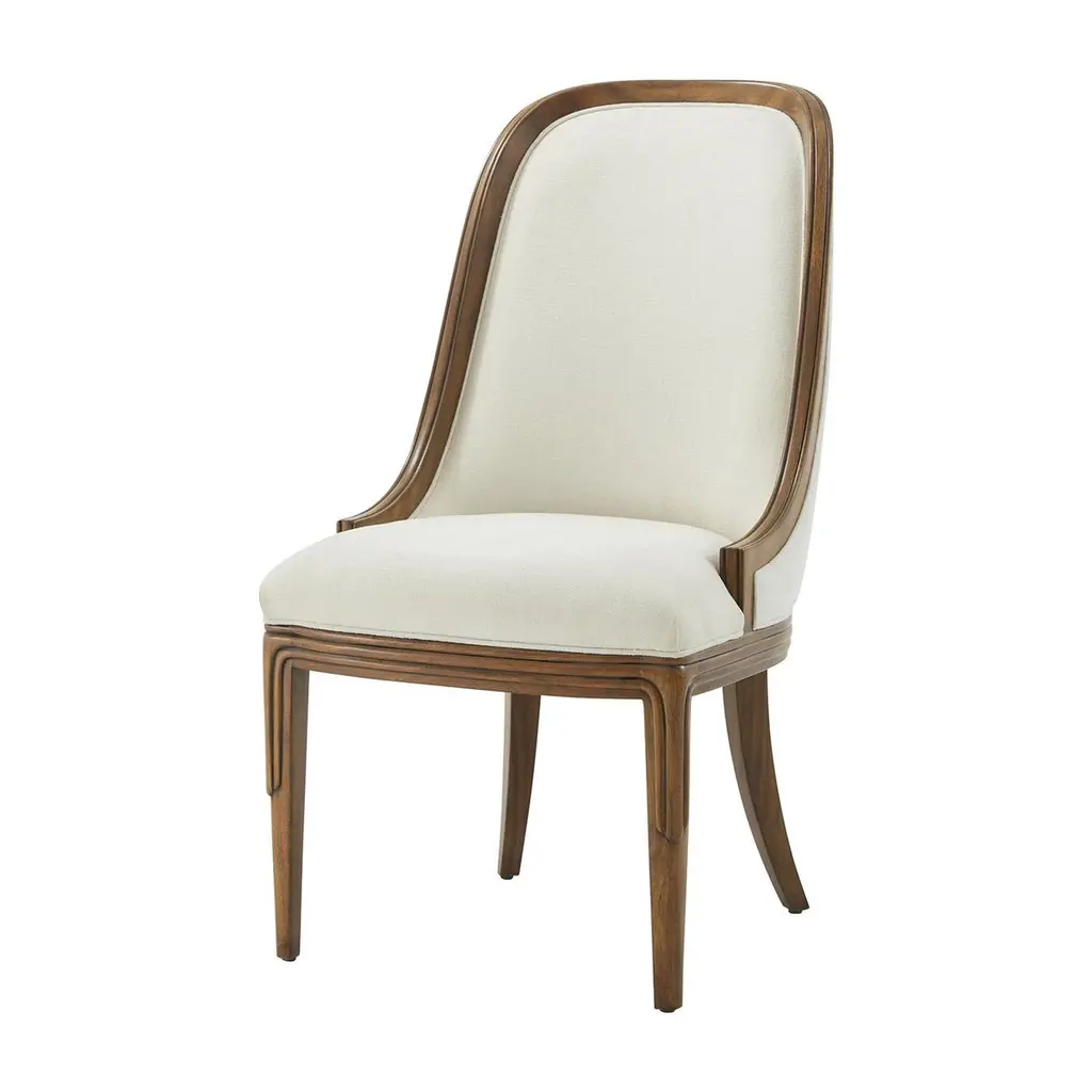 Crafted with a walnut finish, these chairs embody timeless luxury. The refined wooden frame highlights its sculptural presence, while the Marshmallow performance fabric offers both comfort and durability.The meticulously tailored upholstery features welting trim, adding a subtle decorative touch that enhances the chair's architectural silhouette. Designed for elevated dining experiences, this piece seamlessly complements both classic and contemporary interiors. Whether placed around a formal dining table or as an accent chair in a grand space, its impeccable craftsmanship ensures a lasting impression.Dimensions: 21½" W x 26½" D x 40" HSeat - 20" H