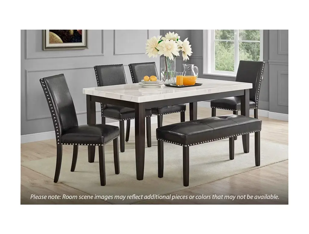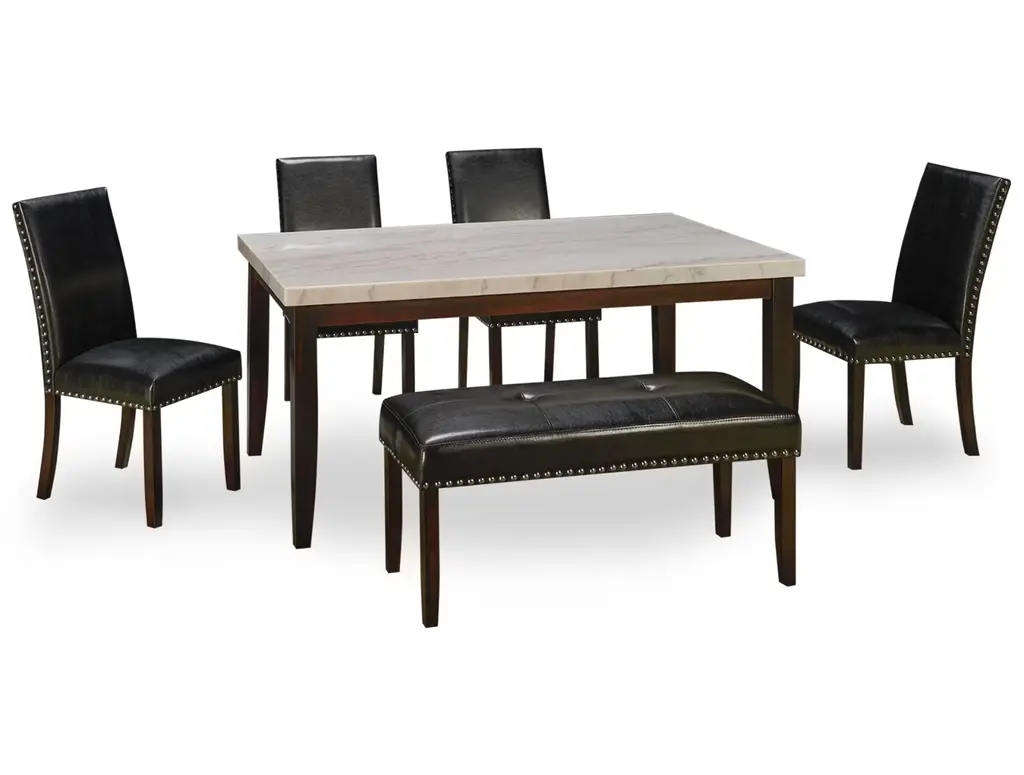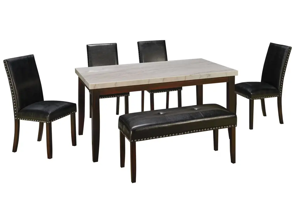 Create a beautiful modern dining space with the Westby Table, 4 Side Chairs and Bench from Steve Silver Company. This 6-piece dining set features a white marble rectangular table with black tapered legs. This contemporary-style dining set is completed by four side chairs and one bench with easy-care black upholstery, pewter nailhead trim, and tapered legs in a brown finish to complete the look.