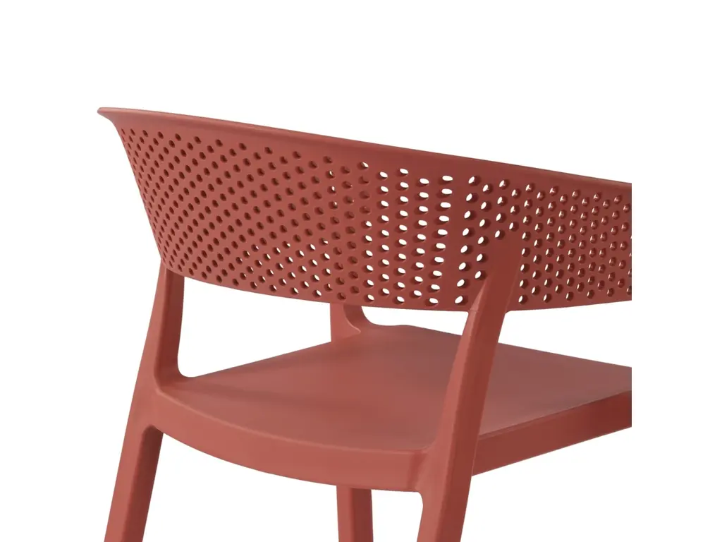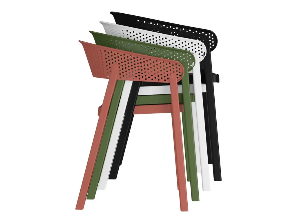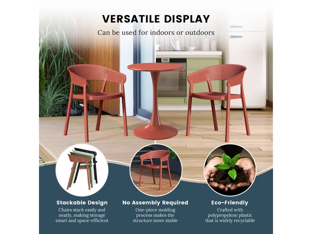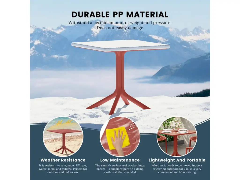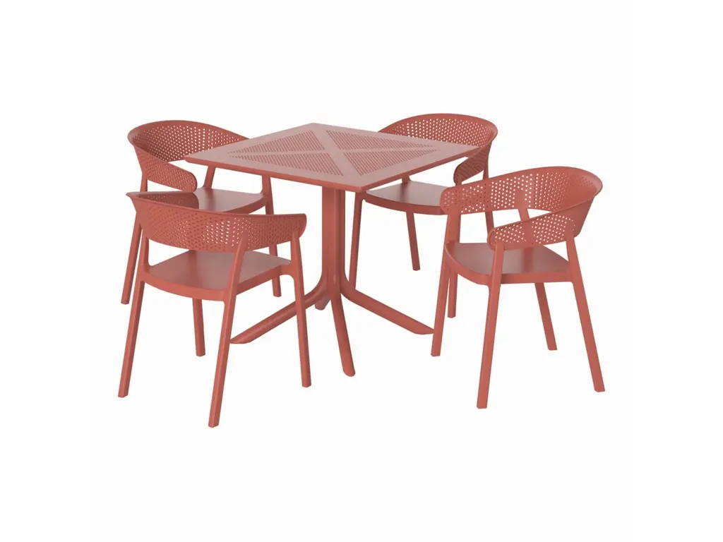Enjoy stylish dining indoors or outdoors on the balcony or patio with this versatile 5-piece resin patio dining set. Crafted for effortless living, the all-weather polypropylene (PP) material is resistant to fading and damage, ensuring lasting beauty in any climate. The sturdy table features a central support and thick legs with adjustable foot levelers for exceptional stability, while the stackable chairs offer convenient storage. With seating for four and a 31.5" spacious ventilated tabletop and the mesh open backrest is perfect for keeping you cool on warm days. With seating for four and a 31.5" spacious tabletop, this 4-person arm chair dining set is perfect for everyday meals and casual gatherings.