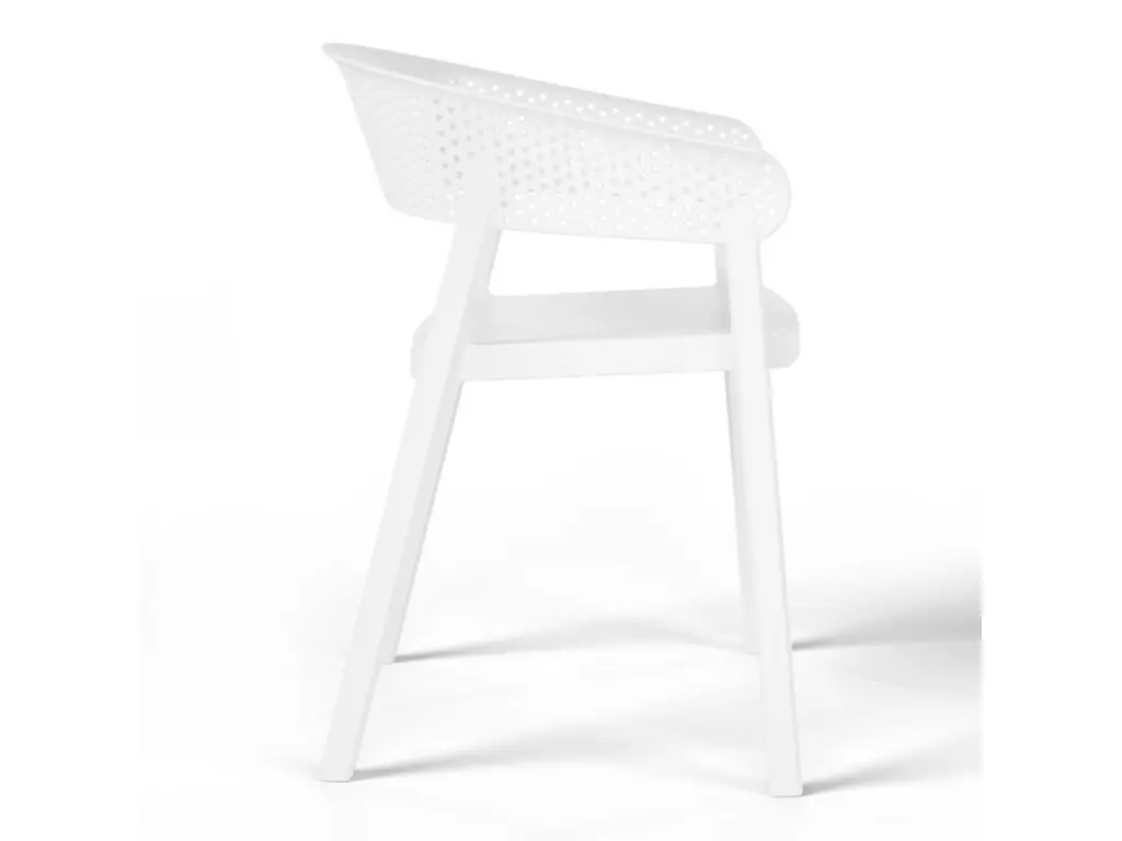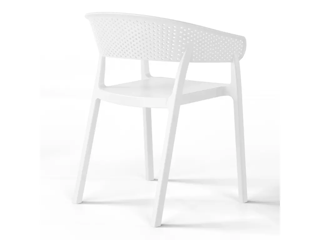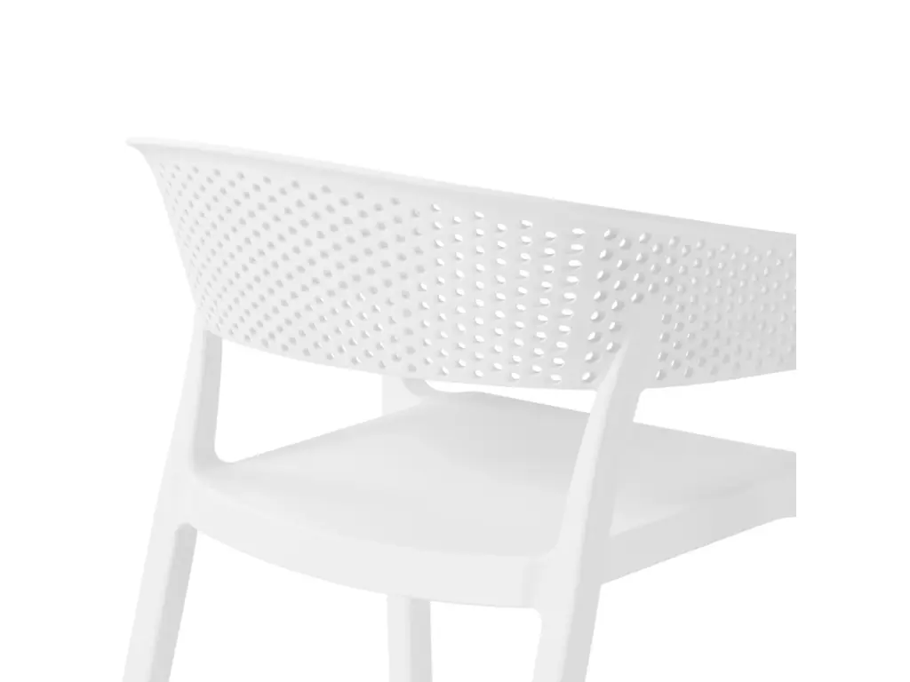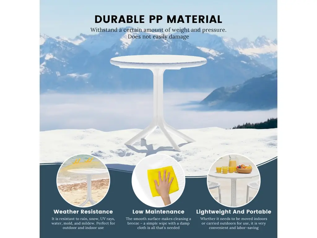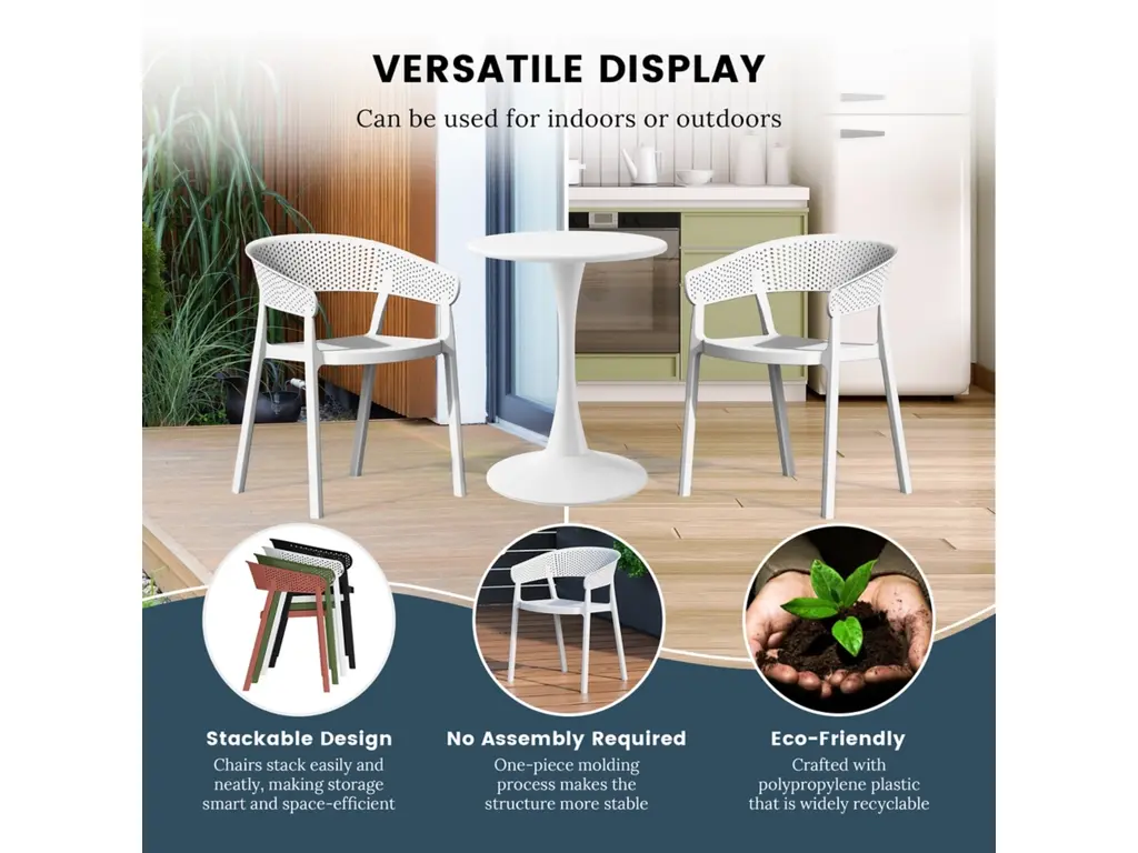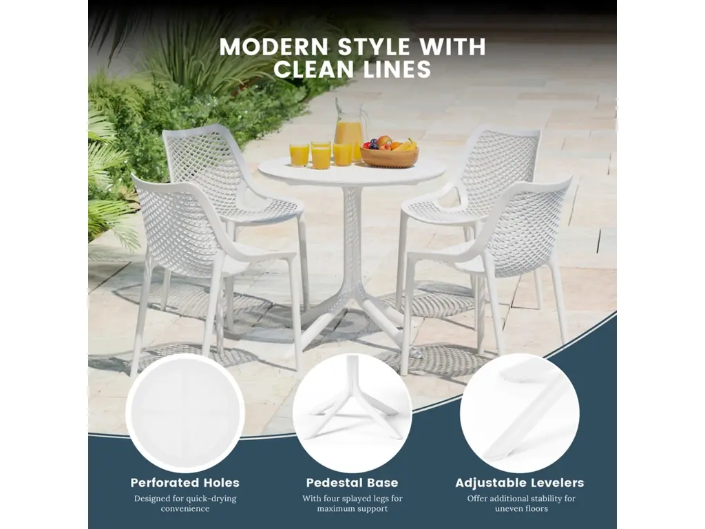 Enjoy stylish dining indoors or outdoors on the balcony or patio with this versatile 5-piece resin round patio dining set. Crafted for effortless living, the all-weather polypropylene (PP) material is resistant to fading and damage, ensuring lasting beauty in any climate. The sturdy table features a central support and thick legs with adjustable foot levelers for exceptional stability, while the stackable chairs offer convenient storage. With seating for four and a 31.5" spacious perforated round tabletop and the mesh open backrest is perfect for keeping you cool on warm days. This 4-person arm chair dining set is perfect for everyday meals and casual gatherings.