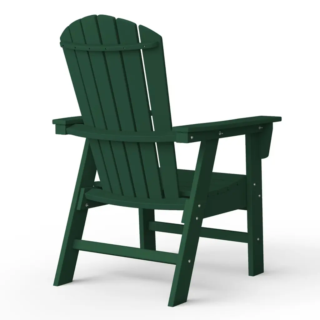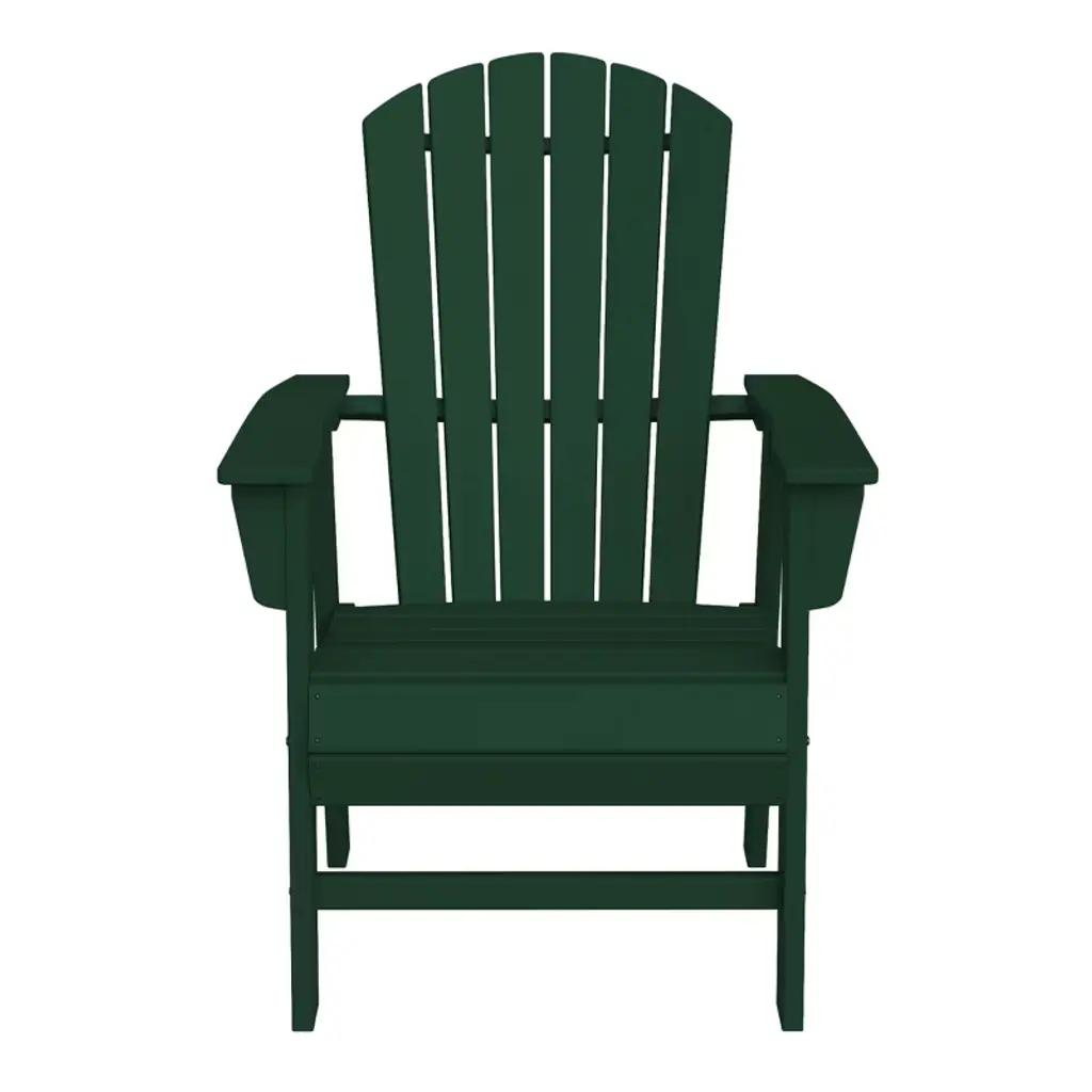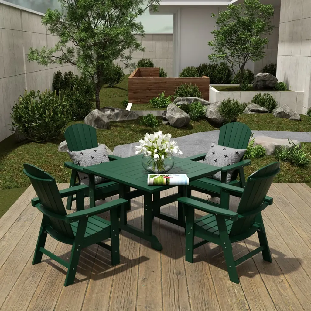 Impress your loved ones at your next outdoor family dinner with the 5-Piece outdoor dining set. This all-weather set seats up to four and features curved-back dining chairs with the look of Adirondack design. With a durable and spacious square dining table, this set is perfect for casual outdoor dining. Created with HDPE material adds durability and can withstand the outdoor elements thanks to the HDPE's natural UV and weather resistant. The dining table and chair are made to look like natural wood without any of the disadvantages of natural wood, meaning that this outdoor dining set isn't prone to splinters, cracks, or peeling.While we strive to accurately represent product colors, please be aware that actual colors may vary slightly due to individual screen settings and lighting conditions. FeaturesSet includes: Four (4) Adirondack dining chairs, One (1) square dining tableMade with an eco-friendly HDPE lumberUV and weather resistant finish and fade resistant colorsContoured seat, wide armrests, curved seashell backrest and waterfall seat frontSolid heavy-duty construction1.97" diameter center hole for standard umbrellaDetails:Product Type: Patio Dining SetsWhat's Included: (4) Dining Chair; (1) Dining TableDining ChairDimensions: 28" W x 24.5" D x 40.25" HWeight: 36 lbs.Seat Width: 20.25"Seat Depth: 18"Seat Height: 16"Weight Capacity: 330 lbs.Dining TableDimensions: 43" W x 43" D x 29.5" HWeight: 80 lbs.Weight Capacity: 330 lbs.