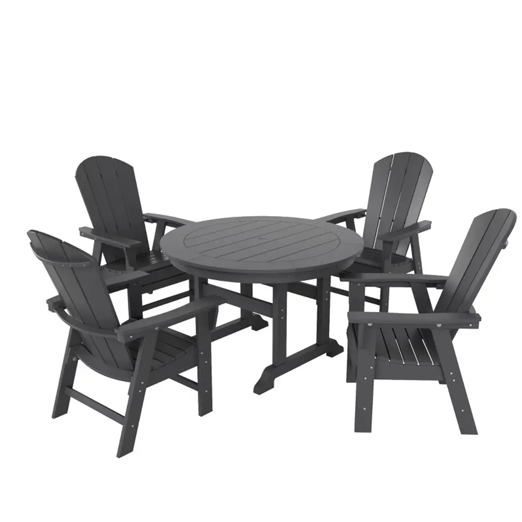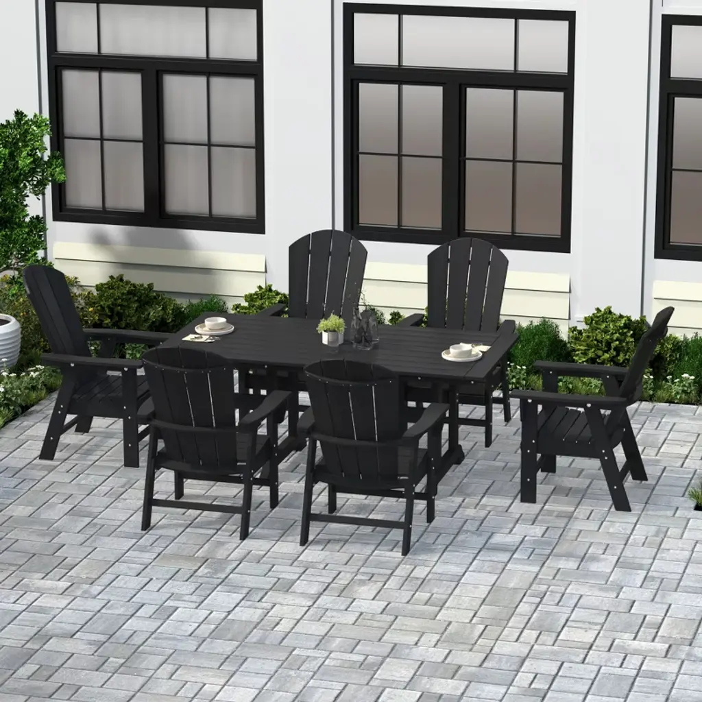 Impress your loved ones at your next outdoor family dinner with the 7-Piece outdoor dining set. This all-weather set seats up to six and features curved-back dining chairs with the look of Adirondack design. With a durable and spacious dining table, this set is perfect for casual outdoor dining. Created with HDPE material adds durability and can withstand the outdoor elements thanks to the HDPE's natural UV and weather resistant. The dining table and chair are made to look like natural wood without any of the disadvantages of natural wood, meaning that this outdoor dining set isn't prone to splinters, cracks, or peeling.While we strive to accurately represent product colors, please be aware that actual colors may vary slightly due to individual screen settings and lighting conditions. FeaturesSet includes: Six (6) Adirondack dining chairs, One (1) Rectangular dining tableMade with Eco-friendly HDPE LumberUV and weather resistant finish and fade resistant colorsContoured seat, wide armrests, curved seashell backrest and waterfall seat frontSolid heavy-duty construction1.97" diameter center hole for standard umbrellaDetails:Product Type: Patio Dining SetsWhat's Included: (6) Dining Chair; (1) Dining TableDining ChairDimensions: 27.5" W x 29" D x 40.5" HWeight: 36.25 lbs.Seat Width: 20.25"Seat Depth: 17.75"Seat Height: 17"Weight Capacity: 330 lbs.Dining TableDimensions: 71" W x 37" D x 29.5" HWeight: 126.5 lbs.Weight Capacity: 330 lbs.
