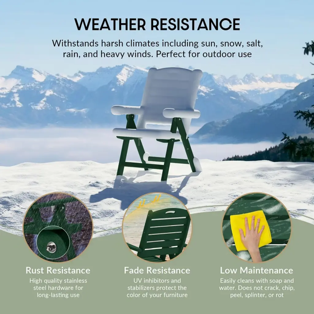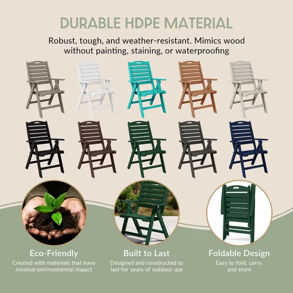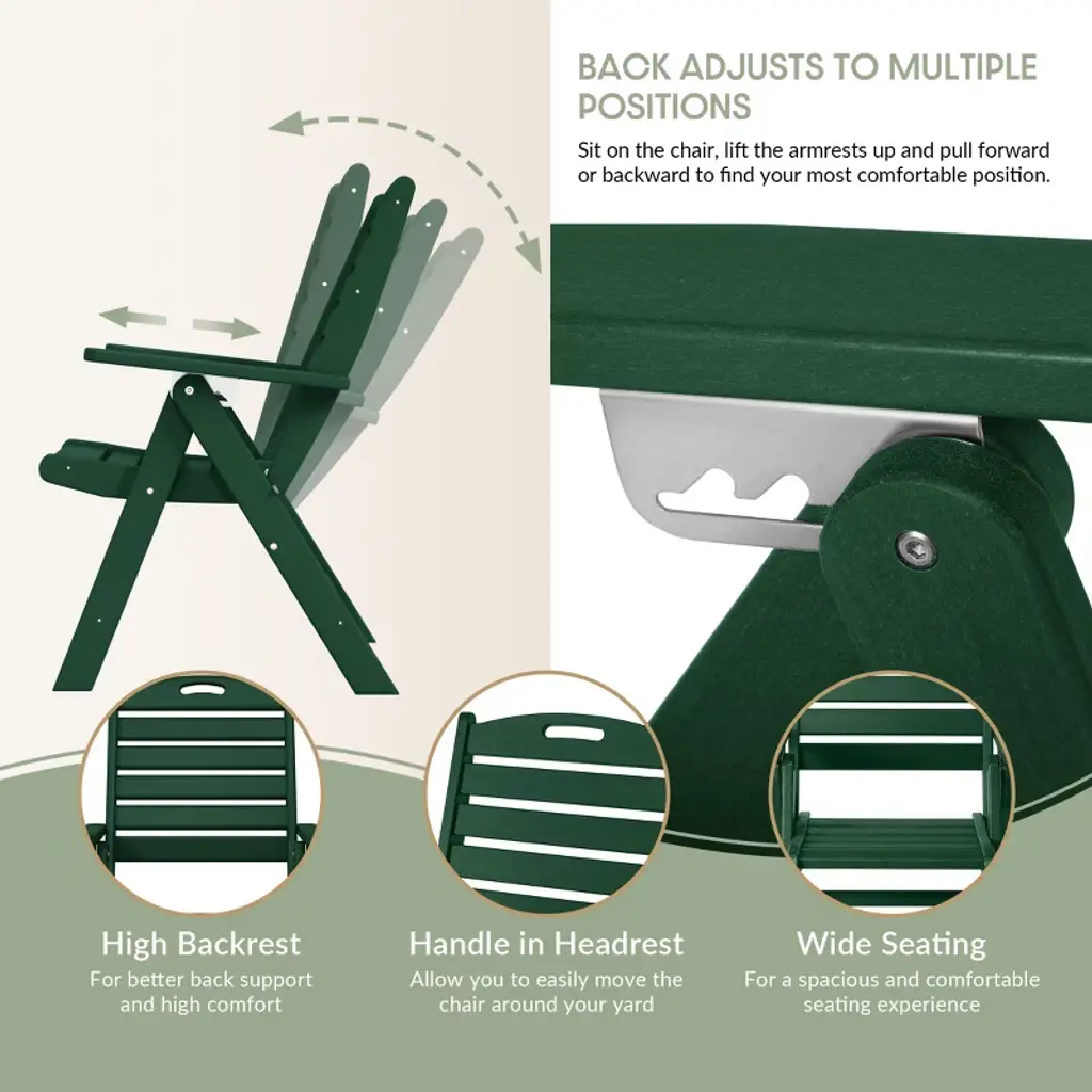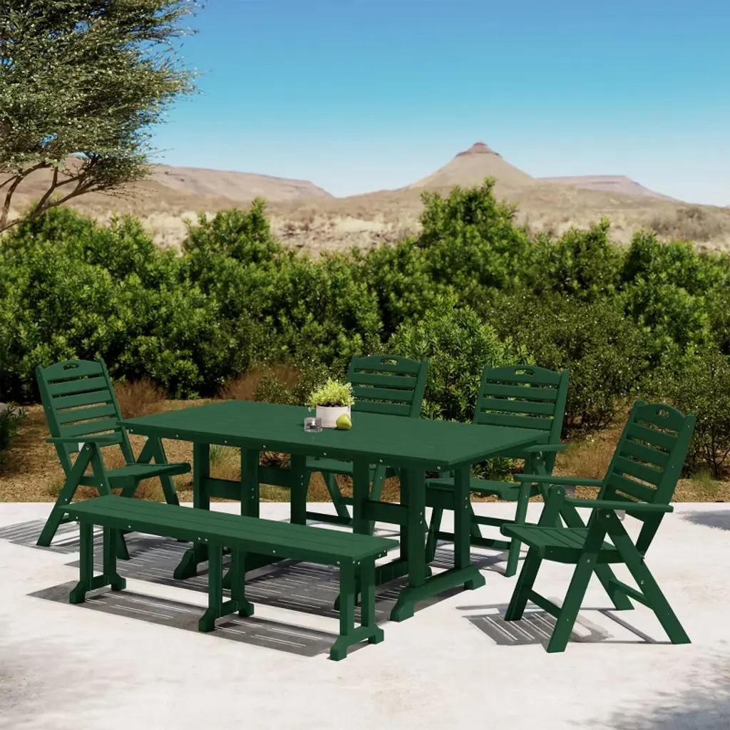 Savor every moment with our 6-Piece HDPE Adjustable High back Folding Patio Dining Table Set, designed for both style and comfort. Made with a durable, all-weather HDPE material that is resilient against UV rays and fading, making it the ideal material for the outdoors. Embrace sun-filled days with ease, thanks to a thoughtfully designed 1.9" umbrella hole—ideal for adding your favorite patio umbrella. After your meal, unwind with the adjustable backrest, offering four reclining positions for personalized relaxation. When the evening is over, effortlessly fold the chair for convenient storage, keeping your space neat and tidy. durability and stability in mind with tables and bench's trestle leg design to ensure added stability, durability and helps reduce wobbling.While we strive to accurately represent product colors, please be aware that actual colors may vary slightly due to individual screen settings and lighting conditions. FeaturesSet Includes: One (1) 71" Rectangle Patio Dining Table, Four (4) High back Folding Patio Dining Chairs, and One (1) 65" Trestle Patio BenchConstructed from Durable HDPE Material and Designed to be Stable and SturdyWeather Resistant to Protect Against the Harsh Outdoor Elements & Fade and UV Resistant to Protect Against the SunFoldable Chairs for Easy Storage and Portable with Convenient Handle to Carry with Ease & Adjustable Backrest with 4 Reclinable Positions for Optimal ComfortChairs Designed with A-Frame Legs and Table and Bench Equipped with a Trestle Design for Better Stability and Weight DistributionPatio Chairs Require Simple AssemblyConvenient 1.9" Diameter Umbrella Hole to Fit Standard Umbrella Pole (Umbrella Not Included)Details:Product Type: Patio Dining SetsWhat's Included: (4) Dining Chair; (1) Dining Table; (1) Bench