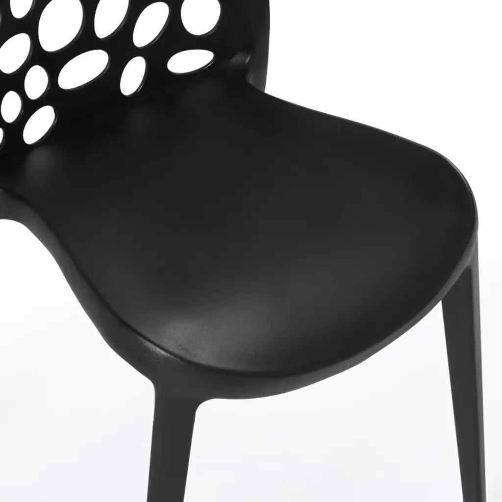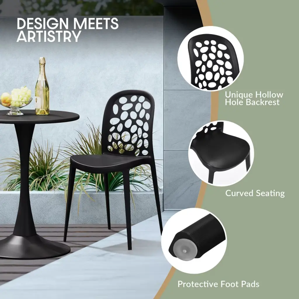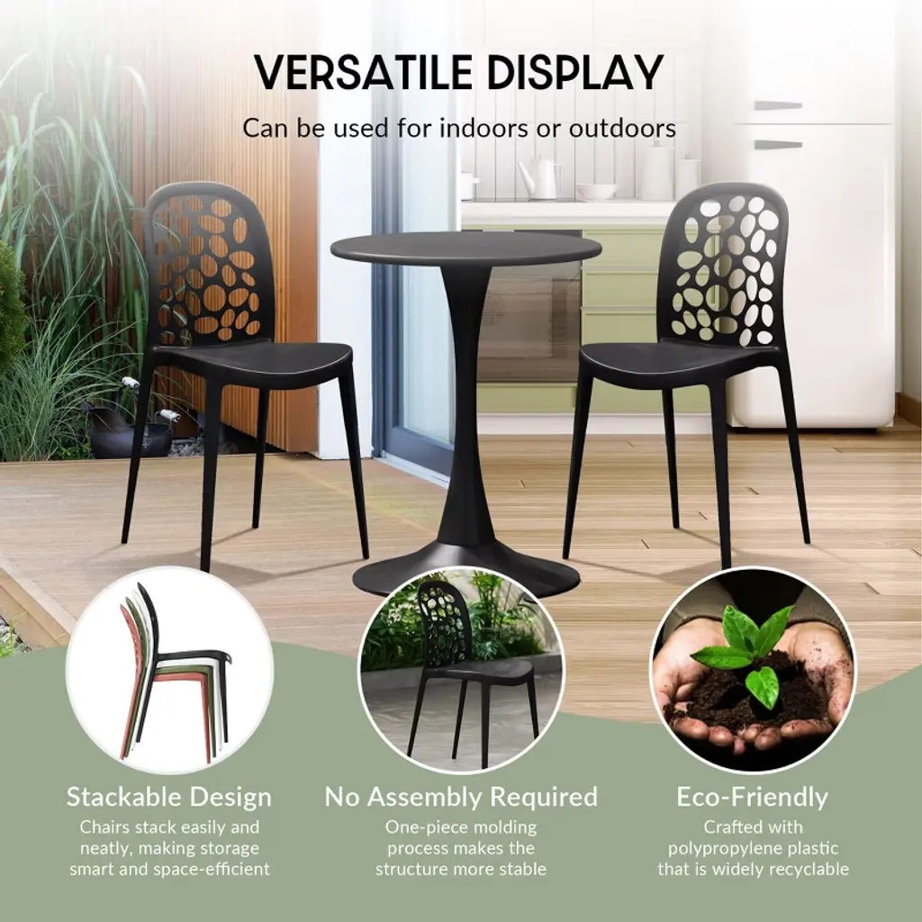 Elevate your outdoor gatherings with this four-person dining table set. The round patio bistro dining table, crafted from a durable metal that has a rust-resistant e-coating that ensures the longevity of the table and has a wide, flat base to reduce wobbling and promote stability. Complementing the table are four stackable patio chairs, designed for space-conscious living. Made from UV-resistant polypropylene resin, these lightweight chairs allow for effortless rearrangement, adapting to your evolving patio aesthetic. The patio dining chairs are designed with an avant-garde backrest offering a more comfortable design with added charm. The ventilated backrest promotes better airflow to keep you cool during those warmer days, and the arched backrest provides optimal comfort while sitting. Enjoy instant gratification with the fully assembled chairs, while the table's assembly allows for quick setup, making this 5-piece round patio dining table set for 4 the perfect patio set.While we strive to accurately represent product colors, please be aware that actual colors may vary slightly due to individual screen settings and lighting conditions. FeaturesSet Includes: One (1) 31.5" Metal Patio Dining Table & Four (4) Stackable Patio Dining ChairsE-Coating Finish Provides Rust & Fade Resistance To The Metal Table, Ensuring Longevity & Weather Resistance In Outdoor ConditionsChairs Constructed with Durable Polypropylene (PP) Material & Designed for Sturdiness & StabilityRobust & Thick Metal Table Base Offers Increased Stability & Wide Flat Base Bottom Helps Eliminate WobblingStackable Chairs for Easy Storage & No Assembly Required, Simply Unpack & Enjoy & The Table Is Simple To Assemble for Quick Set UpVentilated Backrest Promotes Better Airflow To Help Keep You Cool During Those Warmer DaysScratch-Resistant Table for Protection Against Everyday Scratches & Scuffs & Rounded Edges for Added Safety Against Scratches & PricksDetails:Product Type: Patio Dining SetsWhat's Included: (4) Dining Chair; (1) Dining TableDining ChairDimensions: 17.5" W x 21.75" D x 33" HWeight: 8.8 lbs.Seat Width: 16.25"Seat Depth: 17.25"Seat Height: 17.75"Weight Capacity: 260 lbs.Dining TableDimensions: 31.5" W x 31.5" D x 29" HWeight: 27.3 lbs.Table Top Width: 31.5"Table Top Depth: 31.5"Table Top Thickness: 0.75"Seat Width: 16.25"Seat Depth: 17.25"Weight Capacity: 180 lbs.