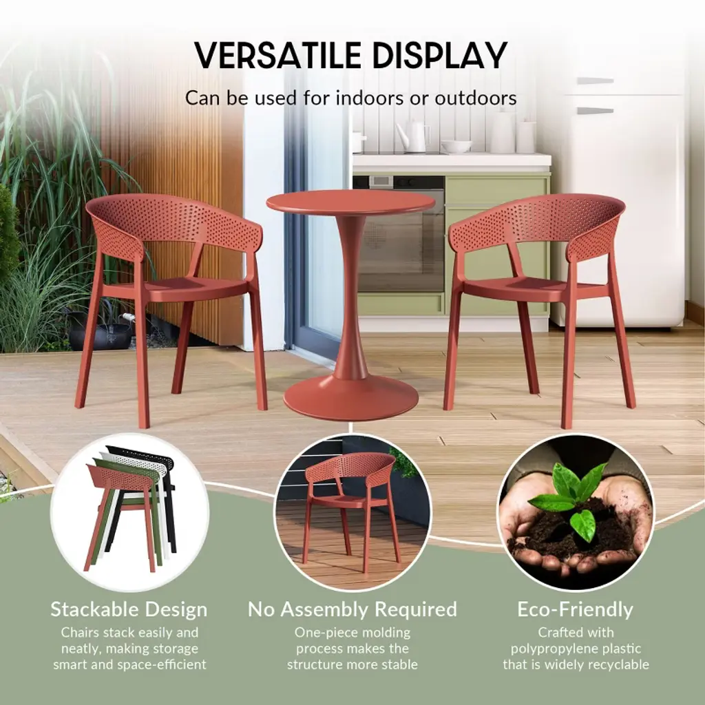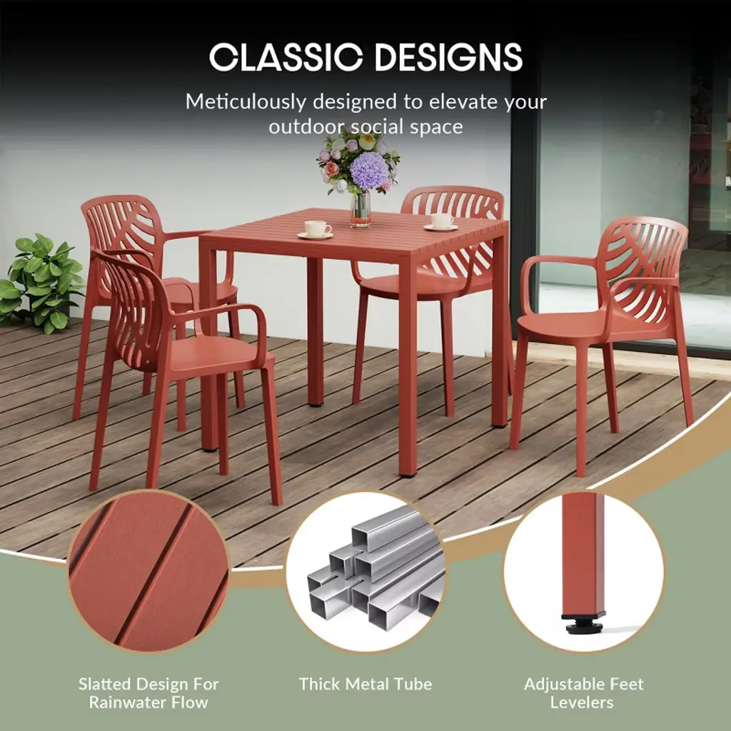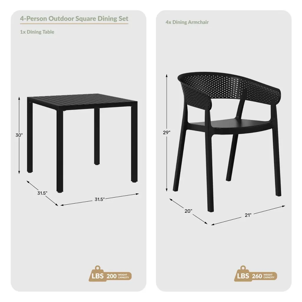 Elevate your patio with this contemporary 5-piece dining set, designed for both form and function. The 31.5" square table, featuring a sleek, scratch-resistant polystyrene top that has a wood-like pattern, is grounded by a modern iron frame with a durable, rust-resistant e-coating to ensure added protection against the outdoors. Adjustable leveling feet ensure stability on any surface, while the slatted tabletop offers practical drainage. Complementing the table are four stackable chairs, crafted from UV and fade-resistant polypropylene resin. Their perforated back design promotes airflow, keeping you comfortable on warm days, and rubber foot pads protect your floors while adding stability. The clean lines and vibrant hues of this set bring a touch of modern sophistication to your outdoor space, creating an inviting setting for al fresco gatherings making this the perfect square patio table set for the summer.While we strive to accurately represent product colors, please be aware that actual colors may vary slightly due to individual screen settings and lighting conditions. FeaturesSet Includes: Four (4) Plastic Resin Dining Side Chairs and One (1) 31.5" Wide Square Patio Dining TableDurable Construction: Table With A Strong Iron Frame And Polystyrene Resin Top; Chairs Crafted From Long-Lasting Polypropylene (PP).E-Coating Finish Provides Rust and Fade Resistance To The Iron Metal, Ensuring Longevity and Weather Resistance In Outdoor ConditionsStackable Patio Dining Chairs To Help Maximize Storage Space With Modern, Perforated Backrest for Enhanced Airflow and Cooling ComfortRobust and Thick Iron Metal Table Legs Offer Increased Stability and Adjustable Leveling Feet Enhance Stability On Uneven Surfaces, Eliminating WobbleEffortless Setup: Chairs Arrive Fully Assembled, Table Requires Simple Leg Assembly For Quick AssemblyWater Easily Drains Through The Slatted Design, Keeping The Tabletop Dry By Preventing PuddlingDetails:Product Type: Patio Dining SetsWhat's Included: (4) Dining Chair; (1) Dining TableDining ChairDimensions: 21" W x 20" D x 29" HWeight: 9.55 lbs.Seat Width: 17.75"Seat Depth: 16.5"Seat Height: 16.5"Weight Capacity: 260 lbs.Dining TableDimensions: 59" W x 35.5" D x 29.5" HWeight: 38 lbs.Table Top Width: 31.5"Table Top Depth: 31.5"Table Top Thickness: 1.5"Seat Width: 17.75"Seat Depth: 16.5"Weight Capacity: 200 lbs.
