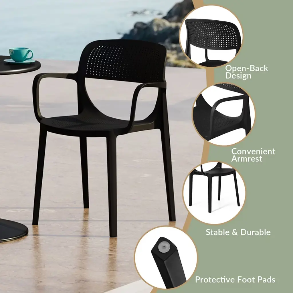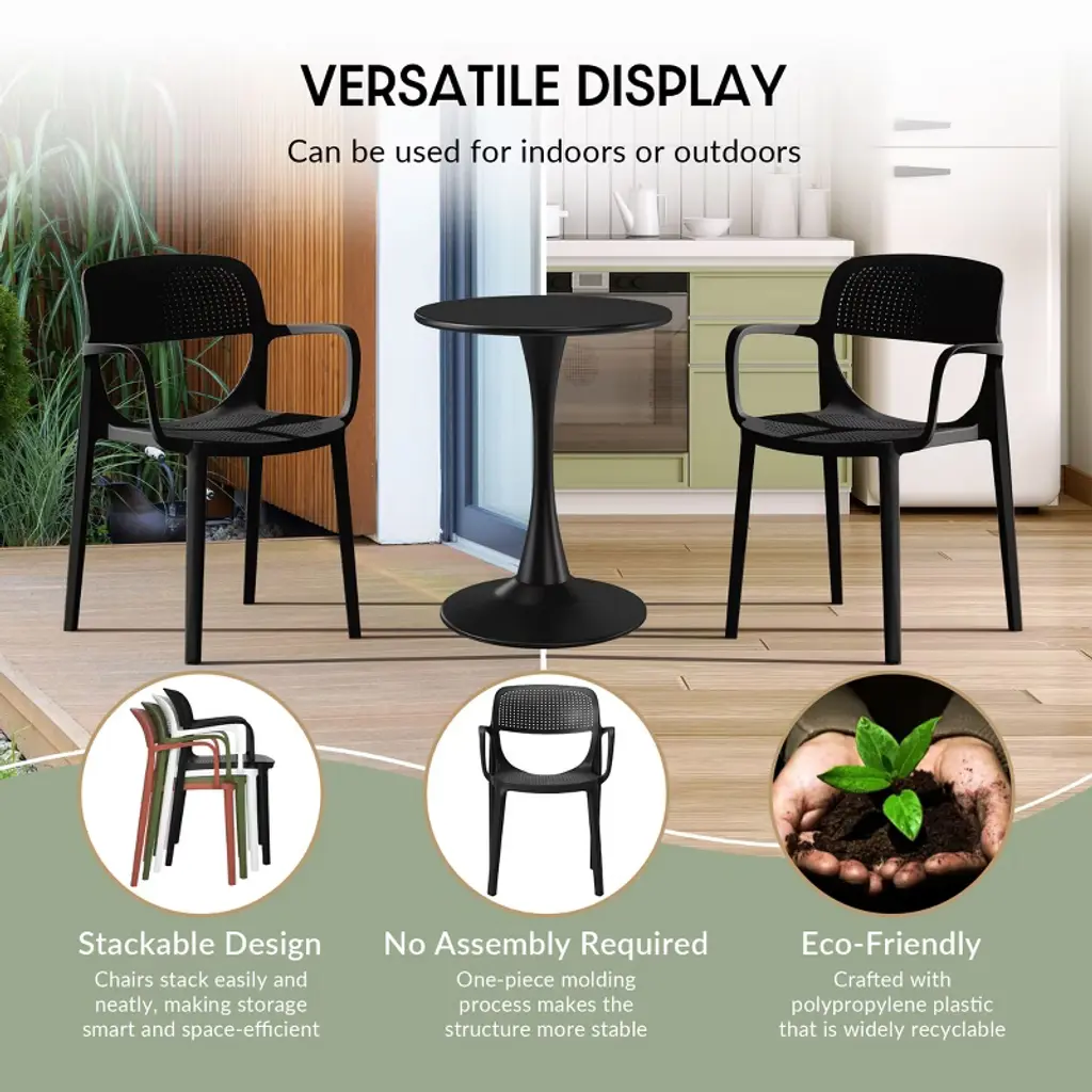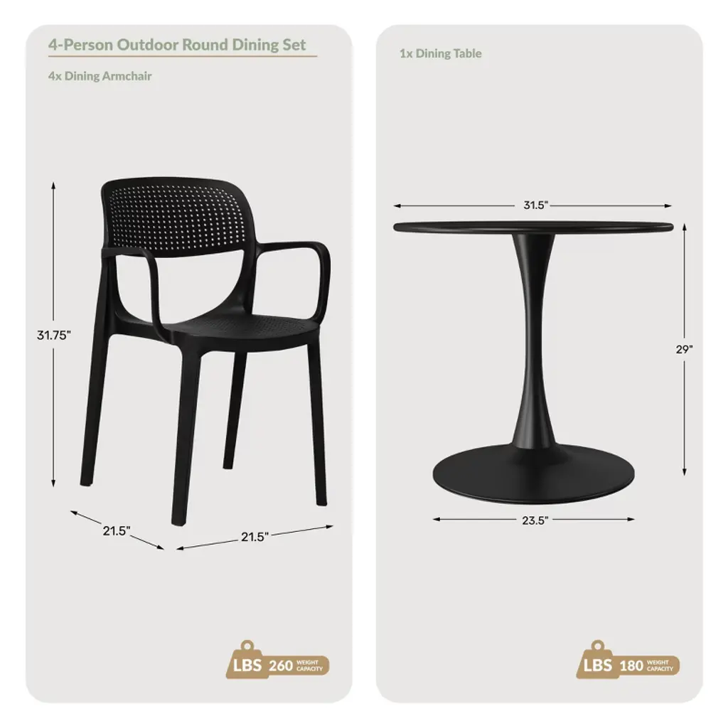 Elevate your outdoor gatherings with this four-person round dining table set. The dining table, crafted from durable metal with rust-resistant e-coating, offers a modern foundation for al fresco dining. Complementing the table are four stackable patio armchairs that are made from UV-resistant polypropylene resin. These lightweight chairs allow for effortless rearrangement, adapting to your evolving patio aesthetic. The perforated design and curved backrest ensure both comfort and practicality by offering additional comfort while sitting with the curved backrest and increased airflow through the perforated holes on the seat and backrest to prevent water from puddling on the seat and drain, and also keeps you cool during those warmer days with the increased airflow. Enjoy instant gratification with the fully assembled patio chairs, while the table's simple assembly is for quick setup, making this 4-person patio table and chair set the ideal set for your patio this season.While we strive to accurately represent product colors, please be aware that actual colors may vary slightly due to individual screen settings and lighting conditions. FeaturesSet Includes: One (1) 31.5" Patio Dining Table & Four (4) Stackable Patio Dining ArmchairsE-Coating Finish Provides Rust & Fade Resistance To The Metal Dining Table, Ensuring Longevity & Weather Resistance In Outdoor ConditionsChairs Constructed with Durable Polypropylene (PP) Material & Designed for Sturdiness & Stability & Contoured Design Offers Additional Comfort To Your Pressure PointsRobust & Thick Metal Table Base Offers Increased Stability & Wide Flat Base Bottom Helps Eliminate WobblingStackable Chairs for Easy Storage & No Assembly Required, Simply Unpack & Enjoy & The Table Is Simple To AssembleWater Easily Drains Through The Perforated Seats Preventing Puddling On The Seat & Keeps You Cool By Allowing Fresh Air To Flow Through & Promotes Faster DryingScratch-Resistant for Protection Against Everyday Scratches & Scuffs & Rounded Edges for Added Safety Against Scratches & PricksDetails:Product Type: Patio Dining SetsWhat's Included: (4) Dining Chair; (1) Dining TableDining ChairDimensions: 21.5" W x 21.5" D x 31.75" HWeight: 10.6 lbs.Seat Width: 16.25"Seat Depth: 17.5"Seat Height: 17.75"Weight Capacity: 260 lbs.Dining TableDimensions: 31.5" W x 31.5" D x 29" HWeight: 27.3 lbs.Table Top Width: 31.5"Table Top Depth: 31.5"Table Top Thickness: 0.75"Seat Width: 16.25"Seat Depth: 17.5"Weight Capacity: 180 lbs.