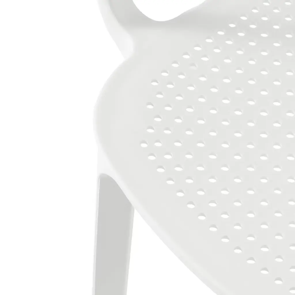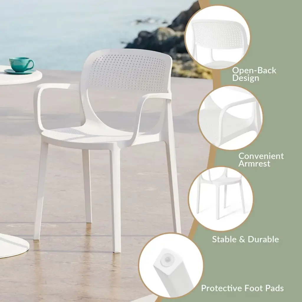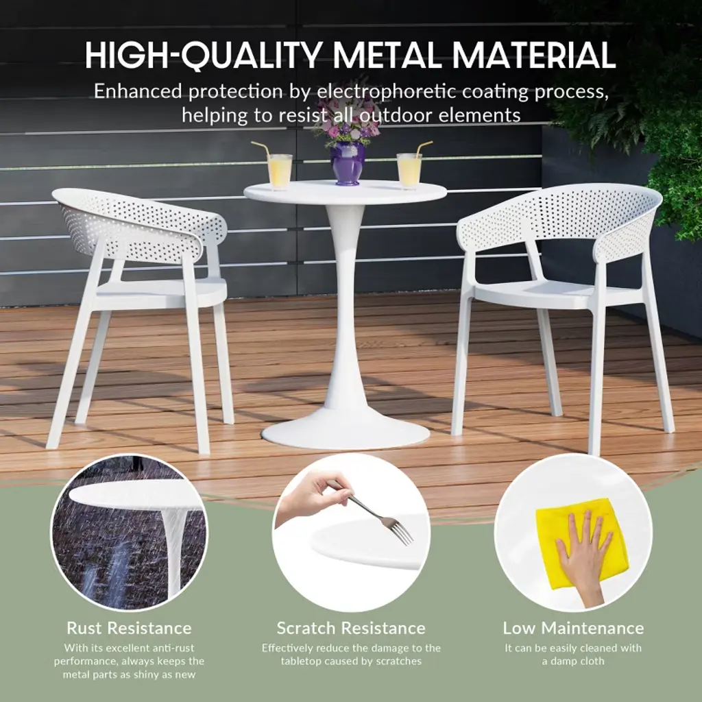 Elevate your outdoor gatherings with this four-person round dining table set. The dining table, crafted from durable metal with rust-resistant e-coating, offers a modern foundation for al fresco dining. Complementing the table are four stackable patio armchairs that are made from UV-resistant polypropylene resin. These lightweight chairs allow for effortless rearrangement, adapting to your evolving patio aesthetic. The perforated design and curved backrest ensure both comfort and practicality by offering additional comfort while sitting with the curved backrest and increased airflow through the perforated holes on the seat and backrest to prevent water from puddling on the seat and drain, and also keeps you cool during those warmer days with the increased airflow. Enjoy instant gratification with the fully assembled patio chairs, while the table's simple assembly is for quick setup, making this 4-person patio table and chair set the ideal set for your patio this season.While we strive to accurately represent product colors, please be aware that actual colors may vary slightly due to individual screen settings and lighting conditions. FeaturesSet Includes: One (1) 31.5" Patio Dining Table & Four (4) Stackable Patio Dining ArmchairsE-Coating Finish Provides Rust & Fade Resistance To The Metal Dining Table, Ensuring Longevity & Weather Resistance In Outdoor ConditionsChairs Constructed with Durable Polypropylene (PP) Material & Designed for Sturdiness & Stability & Contoured Design Offers Additional Comfort To Your Pressure PointsRobust & Thick Metal Table Base Offers Increased Stability & Wide Flat Base Bottom Helps Eliminate WobblingStackable Chairs for Easy Storage & No Assembly Required, Simply Unpack & Enjoy & The Table Is Simple To AssembleWater Easily Drains Through The Perforated Seats Preventing Puddling On The Seat & Keeps You Cool By Allowing Fresh Air To Flow Through & Promotes Faster DryingScratch-Resistant for Protection Against Everyday Scratches & Scuffs & Rounded Edges for Added Safety Against Scratches & PricksDetails:Product Type: Patio Dining SetsWhat's Included: (4) Dining Chair; (1) Dining TableDining ChairDimensions: 21.5" W x 21.5" D x 31.75" HWeight: 10.6 lbs.Seat Width: 16.25"Seat Depth: 17.5"Seat Height: 17.75"Weight Capacity: 260 lbs.Dining TableDimensions: 31.5" W x 31.5" D x 29" HWeight: 27.3 lbs.Table Top Width: 31.5"Table Top Depth: 31.5"Table Top Thickness: 0.75"Seat Width: 16.25"Seat Depth: 17.5"Weight Capacity: 180 lbs.