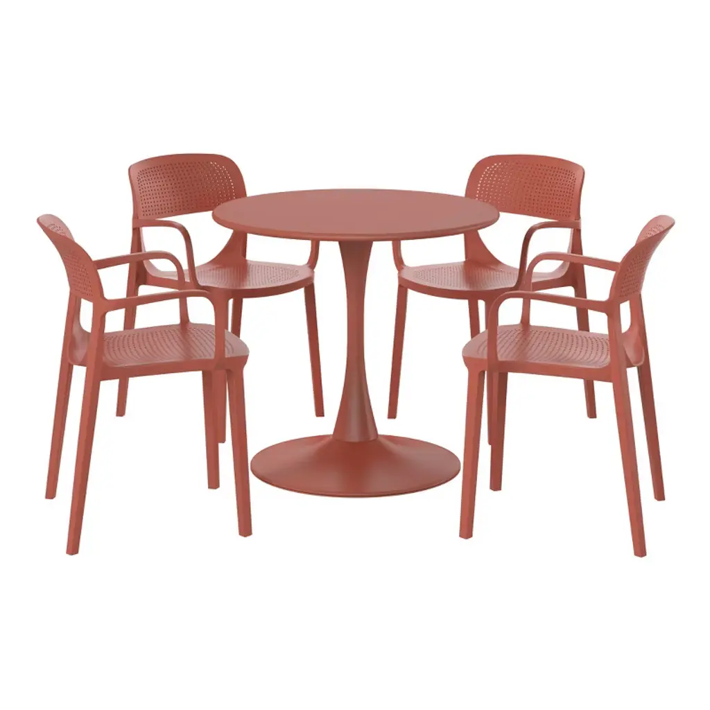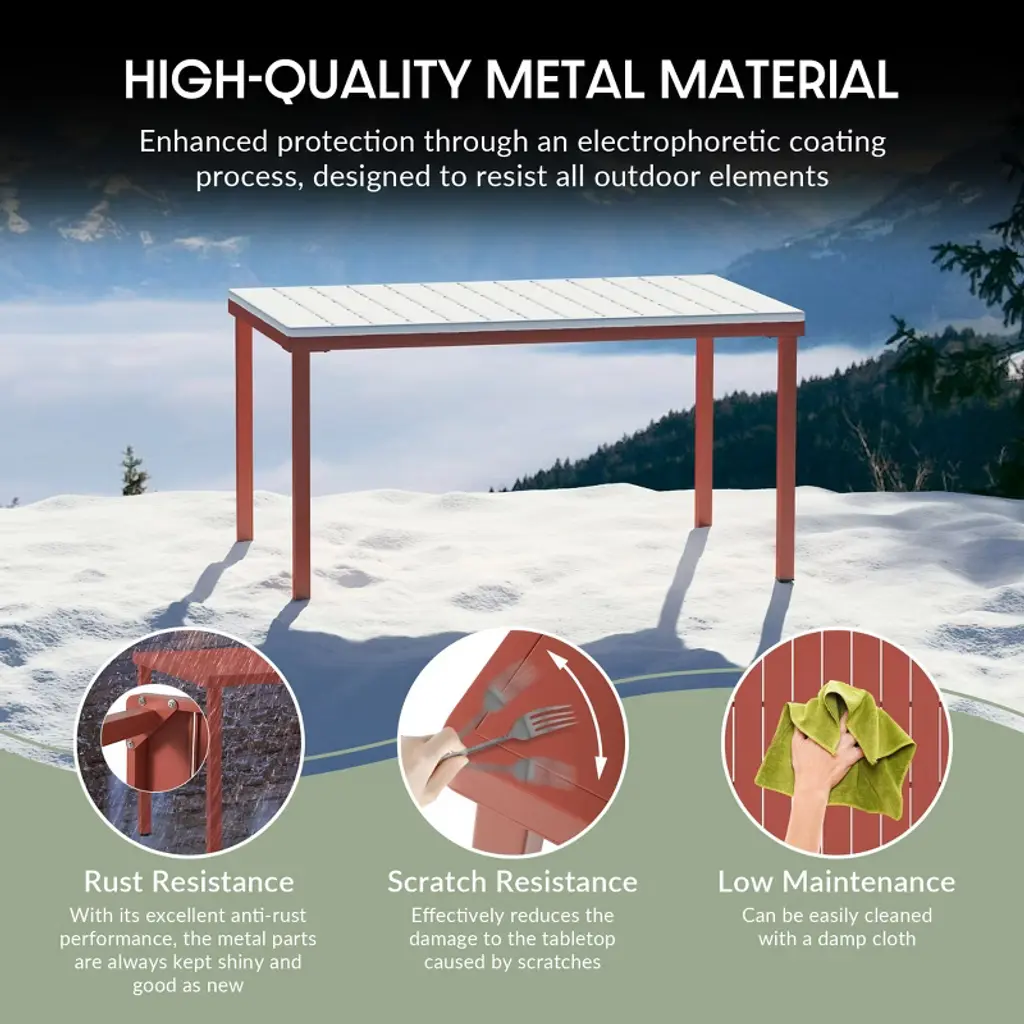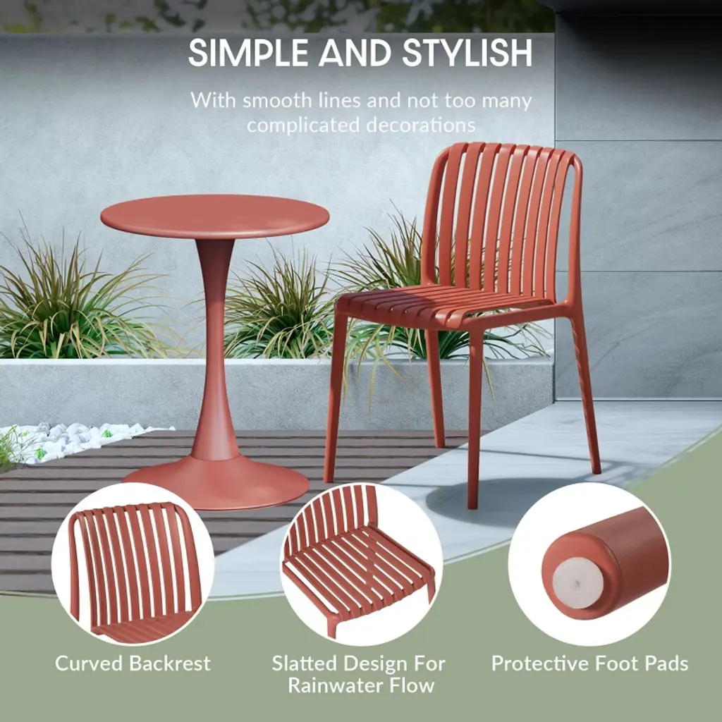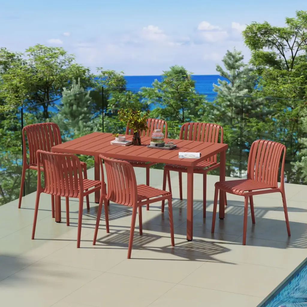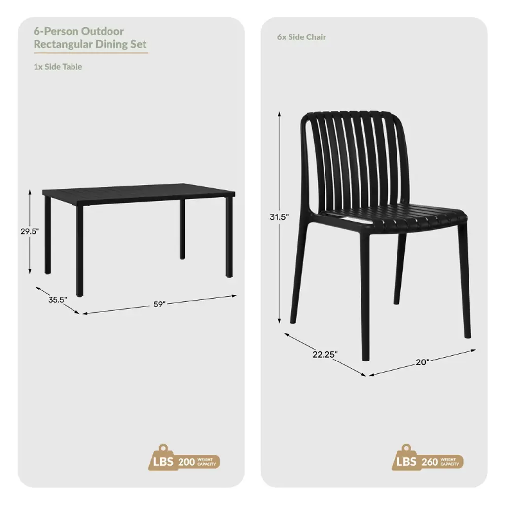 Elevate your outdoor gatherings with this six-person dining set. The rectangular table, crafted from durable iron with a rust-resistant e-coating, offers a modern foundation for al fresco dining. Complementing the table are six stackable patio chairs, designed for space-conscious living. Made from UV-resistant polypropylene resin, these lightweight chairs allow for effortless rearrangement, adapting to your evolving patio aesthetic. The sleek slat design ensures both comfort and practicality, promoting airflow and preventing water accumulation. Enjoy instant gratification with the fully assembled chairs, while the table's simple leg attachment allows for quick setup, making it the perfect centerpiece for your outdoor retreat ensuring this 7-piece outdoor patio dining table set for 6 is the perfect set for your patio this season.While we strive to accurately represent product colors, please be aware that actual colors may vary slightly due to individual screen settings and lighting conditions. FeaturesSet Includes: One (1) 59" Patio Dining Table with Metal Frame & Six (6) Stackable Patio Dining ChairsE-Coating Finish Provides Rust & Fade Resistance To The Iron Metal, Ensuring Longevity & Weather Resistance In Outdoor ConditionsChairs Constructed with Durable Polypropylene (PP) Material & Designed for Sturdiness & StabilityRobust & Thick Iron Metal Table Offers Increased Stability & Adjustable Leveling Feet Enhance Stability On Uneven Surfaces, Eliminating WobbleStackable Chairs for Easy Storage & No Assembly Required, Simply Unpack & Enjoy & The Table Is Simple To Assemble by Simply Attaching the LegsWater Easily Drains Through The Slatted Design, Keeping The Tabletop & Chairs Dry By Preventing Puddling & Keeps You Cool By Allowing Fresh Air To Flow ThroughSpacious 59" Rectangular Tabletop Seats Up to 6 Guest Comfortably with Plenty of Space for all your Meals and DrinksDetails:Product Type: Patio Dining SetsWhat's Included: (6) Dining Chair; (1) Dining TableDining ChairDimensions: 20" W x 22.25" D x 31.5" HWeight: 10.25 lbs.Weight Capacity: 260 lbs.Dining TableDimensions: 59" W x 35.5" D x 29.5" HWeight: 38 lbs.Table Top Width: 59"Table Top Depth: 35.5"Table Top Thickness: 1.5"Seat Width: 17.25"Seat Depth: 17.25"Weight Capacity: 200 lbs.