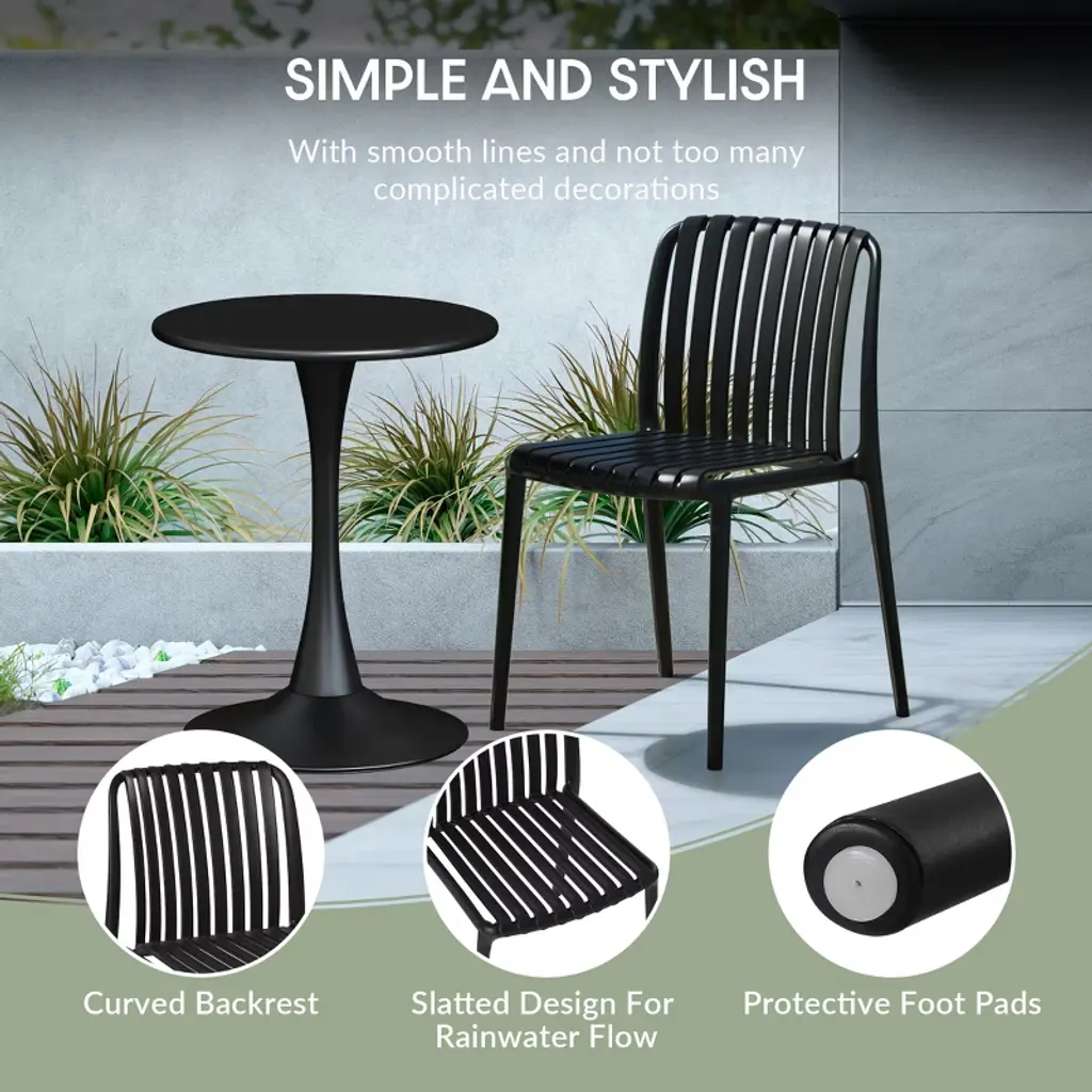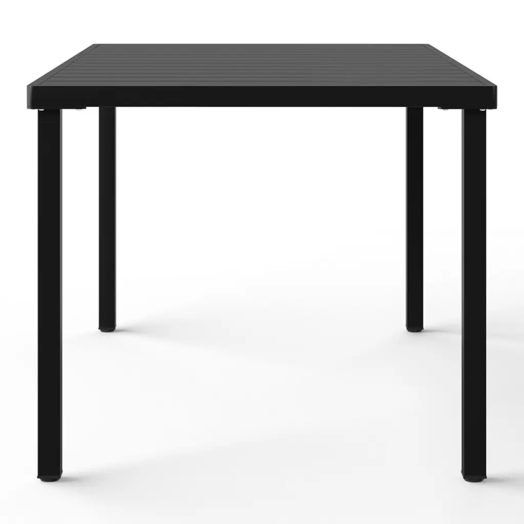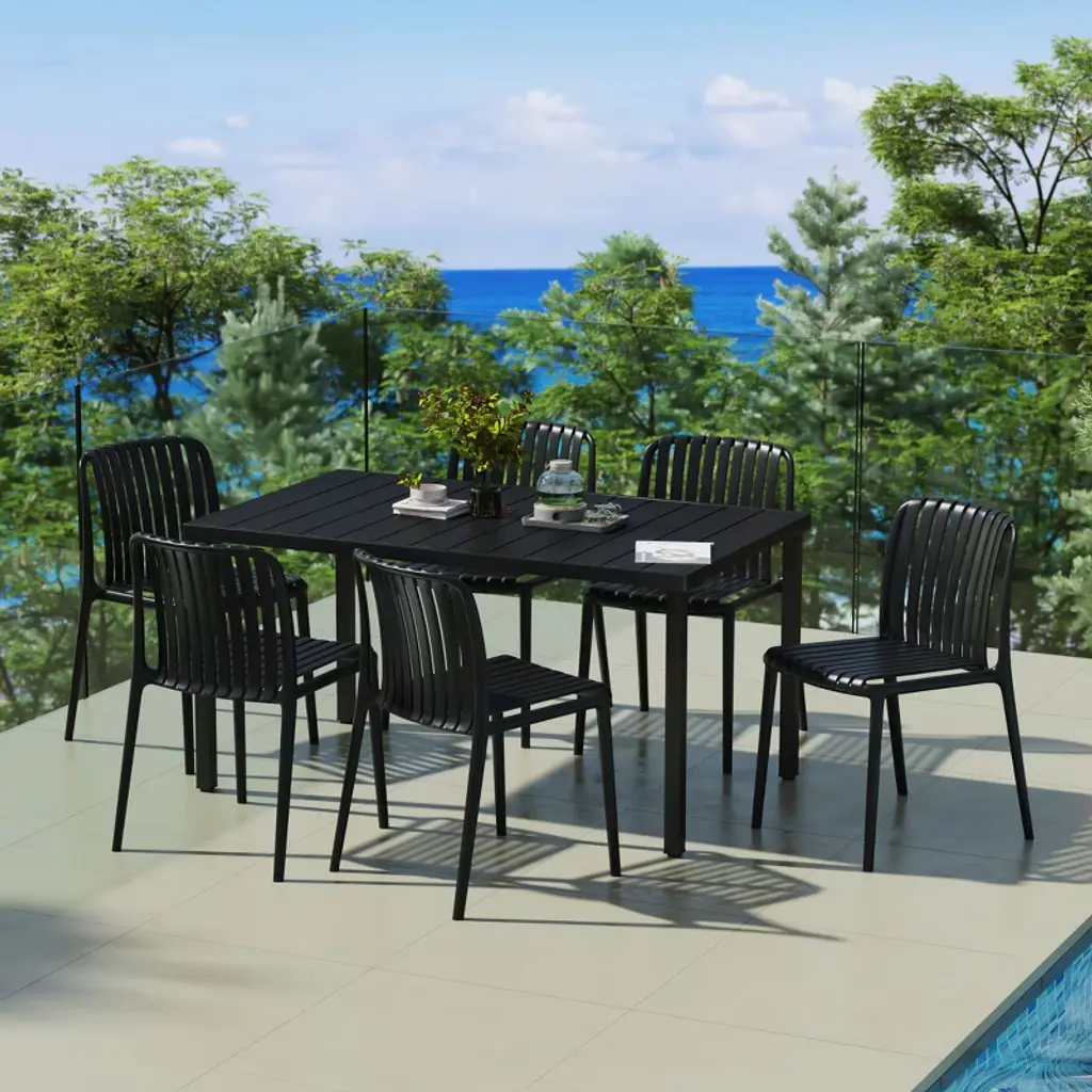 Elevate your outdoor gatherings with this six-person dining set. The rectangular table, crafted from durable iron with a rust-resistant e-coating, offers a modern foundation for al fresco dining. Complementing the table are six stackable patio chairs, designed for space-conscious living. Made from UV-resistant polypropylene resin, these lightweight chairs allow for effortless rearrangement, adapting to your evolving patio aesthetic. The sleek slat design ensures both comfort and practicality, promoting airflow and preventing water accumulation. Enjoy instant gratification with the fully assembled chairs, while the table's simple leg attachment allows for quick setup, making it the perfect centerpiece for your outdoor retreat ensuring this 7-piece outdoor patio dining table set for 6 is the perfect set for your patio this season.While we strive to accurately represent product colors, please be aware that actual colors may vary slightly due to individual screen settings and lighting conditions. FeaturesSet Includes: One (1) 59" Patio Dining Table with Metal Frame & Six (6) Stackable Patio Dining ChairsE-Coating Finish Provides Rust & Fade Resistance To The Iron Metal, Ensuring Longevity & Weather Resistance In Outdoor ConditionsChairs Constructed with Durable Polypropylene (PP) Material & Designed for Sturdiness & StabilityRobust & Thick Iron Metal Table Offers Increased Stability & Adjustable Leveling Feet Enhance Stability On Uneven Surfaces, Eliminating WobbleStackable Chairs for Easy Storage & No Assembly Required, Simply Unpack & Enjoy & The Table Is Simple To Assemble by Simply Attaching the LegsWater Easily Drains Through The Slatted Design, Keeping The Tabletop & Chairs Dry By Preventing Puddling & Keeps You Cool By Allowing Fresh Air To Flow ThroughSpacious 59" Rectangular Tabletop Seats Up to 6 Guest Comfortably with Plenty of Space for all your Meals and DrinksDetails:Product Type: Patio Dining SetsWhat's Included: (6) Dining Chair; (1) Dining TableDining ChairDimensions: 20" W x 22.25" D x 31.5" HWeight: 10.25 lbs.Weight Capacity: 260 lbs.Dining TableDimensions: 59" W x 35.5" D x 29.5" HWeight: 38 lbs.Table Top Width: 59"Table Top Depth: 35.5"Table Top Thickness: 1.5"Seat Width: 17.25"Seat Depth: 17.25"Weight Capacity: 200 lbs.