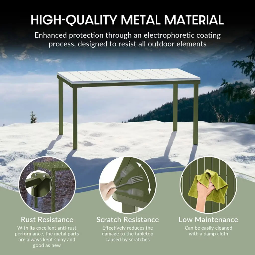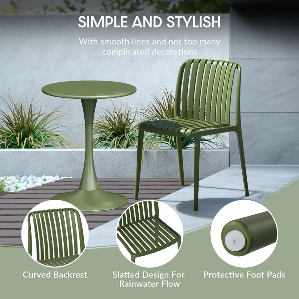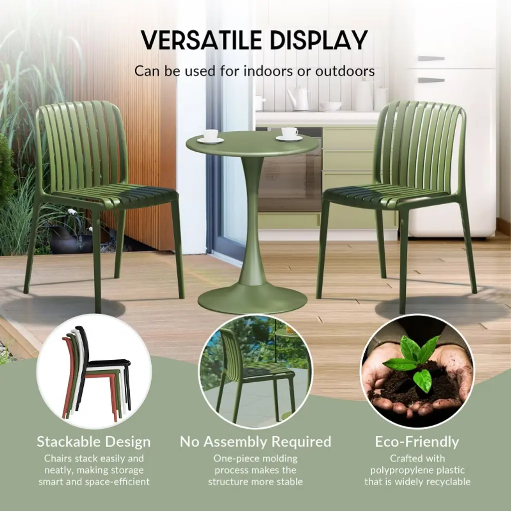Elevate your outdoor gatherings with this six-person dining set. The rectangular table, crafted from durable iron with a rust-resistant e-coating, offers a modern foundation for al fresco dining. Complementing the table are six stackable patio chairs, designed for space-conscious living. Made from UV-resistant polypropylene resin, these lightweight chairs allow for effortless rearrangement, adapting to your evolving patio aesthetic. The sleek slat design ensures both comfort and practicality, promoting airflow and preventing water accumulation. Enjoy instant gratification with the fully assembled chairs, while the table's simple leg attachment allows for quick setup, making it the perfect centerpiece for your outdoor retreat ensuring this 7-piece outdoor patio dining table set for 6 is the perfect set for your patio this season.While we strive to accurately represent product colors, please be aware that actual colors may vary slightly due to individual screen settings and lighting conditions. FeaturesSet Includes: One (1) 59" Patio Dining Table with Metal Frame & Six (6) Stackable Patio Dining ChairsE-Coating Finish Provides Rust & Fade Resistance To The Iron Metal, Ensuring Longevity & Weather Resistance In Outdoor ConditionsChairs Constructed with Durable Polypropylene (PP) Material & Designed for Sturdiness & StabilityRobust & Thick Iron Metal Table Offers Increased Stability & Adjustable Leveling Feet Enhance Stability On Uneven Surfaces, Eliminating WobbleStackable Chairs for Easy Storage & No Assembly Required, Simply Unpack & Enjoy & The Table Is Simple To Assemble by Simply Attaching the LegsWater Easily Drains Through The Slatted Design, Keeping The Tabletop & Chairs Dry By Preventing Puddling & Keeps You Cool By Allowing Fresh Air To Flow ThroughSpacious 59" Rectangular Tabletop Seats Up to 6 Guest Comfortably with Plenty of Space for all your Meals and DrinksDetails:Product Type: Patio Dining SetsWhat's Included: (6) Dining Chair; (1) Dining TableDining ChairDimensions: 20" W x 22.25" D x 31.5" HWeight: 10.25 lbs.Weight Capacity: 260 lbs.Dining TableDimensions: 59" W x 35.5" D x 29.5" HWeight: 38 lbs.Table Top Width: 59"Table Top Depth: 35.5"Table Top Thickness: 1.5"Seat Width: 17.25"Seat Depth: 17.25"Weight Capacity: 200 lbs.