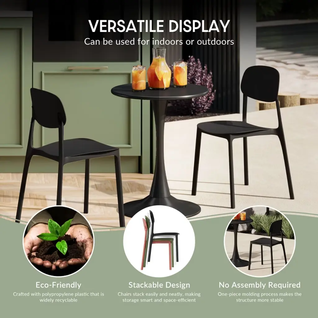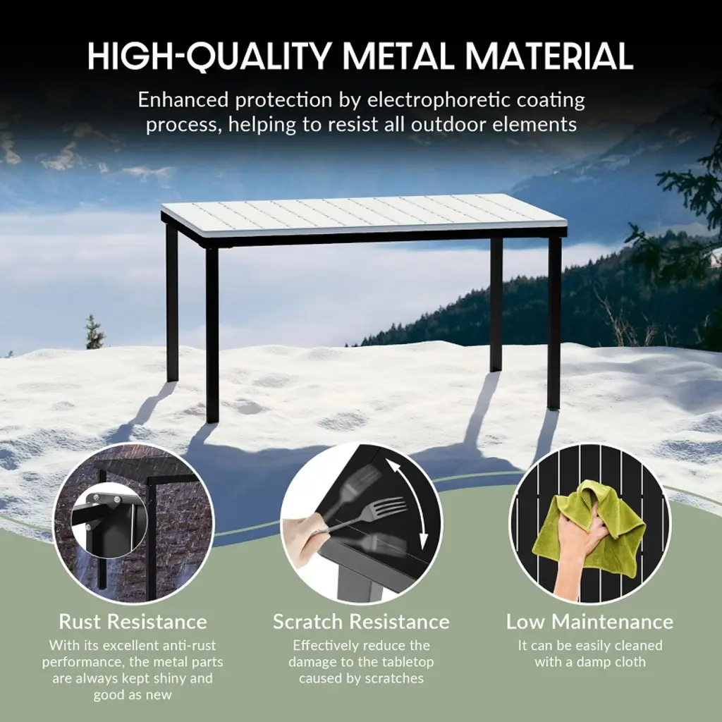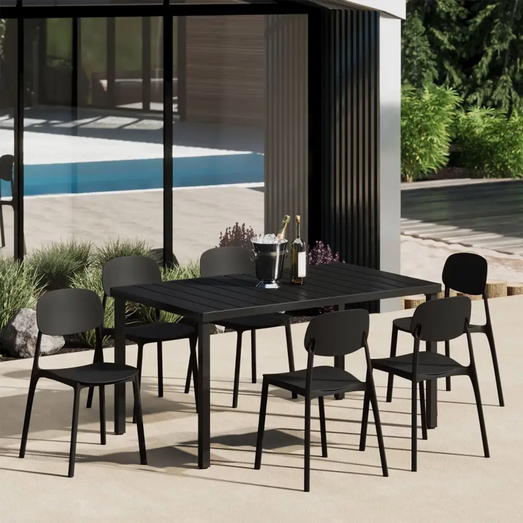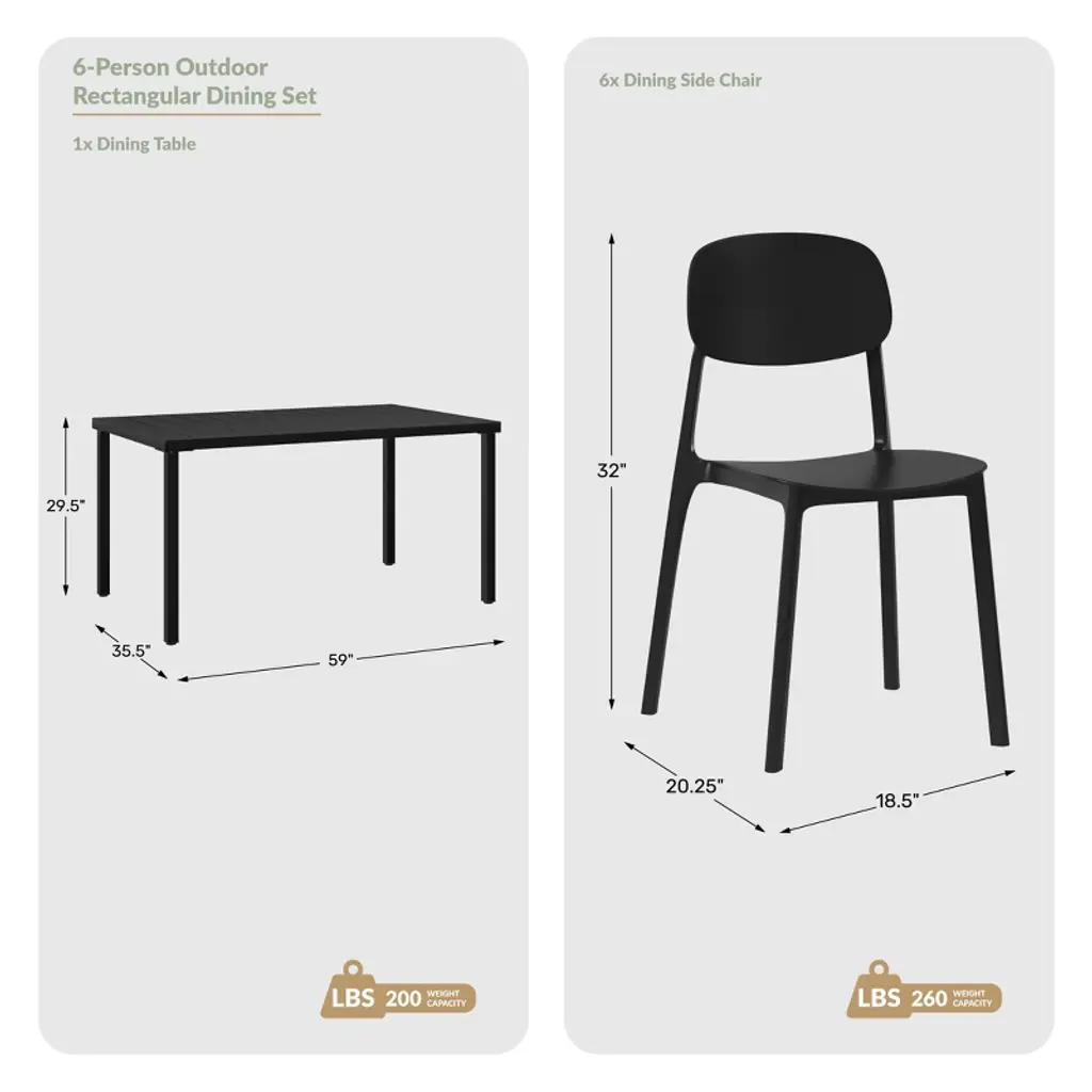 Elevate your outdoor gatherings with this six-person dining set. The rectangular table, crafted from durable iron with a rust-resistant e-coating, offers a modern foundation for al fresco dining. Complementing the table are six stackable patio chairs, designed for space-conscious living. Made from UV-resistant polypropylene resin, these lightweight chairs allow for effortless rearrangement, adapting to your evolving patio aesthetic. The sleek mid-century modern chair design ensures comfort with the open back promoting airflow to keep you cool and the splayed legs adds extra stability. Enjoy instant gratification with the fully assembled chairs, while the table's simple leg attachment allows for quick setup, making it the perfect centerpiece for your outdoor retreat ensuring this 7-piece rectangle patio dining table set for 6 is the perfect set for your patio this season.While we strive to accurately represent product colors, please be aware that actual colors may vary slightly due to individual screen settings and lighting conditions. FeaturesSet Includes: One (1) 59" Iron Metal Patio Dining Table & Six (6) Stackable Patio Dining ChairsE-Coating Finish Provides Rust & Fade Resistance To The Iron Metal, Ensuring Longevity & Weather Resistance In Outdoor ConditionsChairs Constructed with Durable Polypropylene (PP) Material & Designed for Sturdiness & StabilityRobust & Thick Iron Metal Table Offers Increased Stability & Adjustable Leveling Feet Enhance Stability On Uneven Surfaces, Eliminating WobbleStackable Chairs for Easy Storage & No Assembly Required, Simply Unpack & Enjoy & The Table Is Simple To Assemble by Simply Attaching the LegsWater Easily Drains Through The Slatted Tabletop & The Chairs Keep You Cool By Allowing Fresh Air To Flow Through The Open BackrestSpacious 59" Rectangular Tabletop Seats Up to 6 Guest Comfortably with Plenty of Space for all your Meals and DrinksDetails:Product Type: Patio Dining SetsWhat's Included: (6) Dining Chair; (1) Dining TableDining ChairDimensions: 18.5" W x 20.25" D x 32" HWeight: 8.3 lbs.Weight Capacity: 260 lbs.Dining TableDimensions: 59" W x 35.5" D x 29.5" HWeight: 38 lbs.Table Top Width: 59"Table Top Depth: 35.5"Table Top Thickness: 1.5"Seat Width: 16.25"Seat Depth: 16"Weight Capacity: 200 lbs.